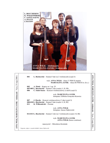 L. BOCCHERINI K. WIŁKOMIRSKI C. SAINT-SAENS, A. PIATTI J. HAYDN 001 L. Bochcerini – Sonata F-dur na 2 wiolonczele (część I) wyk. ANNA WILK – klasa V PSM II stopnia MARCELINA JANIK – klasa III PSM II st. (b.c.) 002 A. Piatti – Kaprys nr 1 op. 25 003-005 L. Boccherini – Sonata C-dur (części: I, II, III) 006 C. Saint-Saens – Koncert wiolonczelowy a-moll (część I) wyk. MARCELINA JANIK fortepian: Elżbieta Gorączko-Krawiec 007 J. Haydn – Koncert wiolonczelowy C-dur (część I) 008-010 L. Boccherini – Sonata F-dur (części: I, II, III) 011 K. Wiłkomirski – Poemat wyk. ANNA WILK fortepian: Janusz Dąbrowski 012-013 L. Boccherini – Sonata C-dur na 2 wiolonczele (części: II, III) wyk. MARCELINA JANIK ANNA WILK (basso continuo) nauczyciel – Mirosława Krośniak Nagranie, zdjęcie i projekt okładki: Janusz Dąbrowski, ANNA WILK, MARCELINA JANIK - wiolonczele – Nysa, 25 maja 2006 r. ANNA WILK, MARCELINA JANIK - wiolonczele – Nysa, 25 maja 2006 r. ANNA WILK - wiolonczela MARCELINA JANIK - wiolonczela