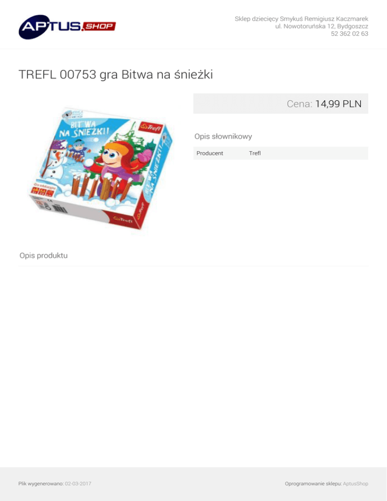 Sklep dziecięcy Smykuś Remigiusz Kaczmarek ul. Nowotoruńska 12, Bydgoszcz 52 362 02 63 TREFL 00753 gra Bitwa na śnieżki Cena: 14,99 PLN Opis słownikowy Producent Trefl Opis produktu Plik wygenerowano: 02-03-2017 Powered by TCPDF (www.tcpdf.org) Oprogramowanie sklepu: AptusShop