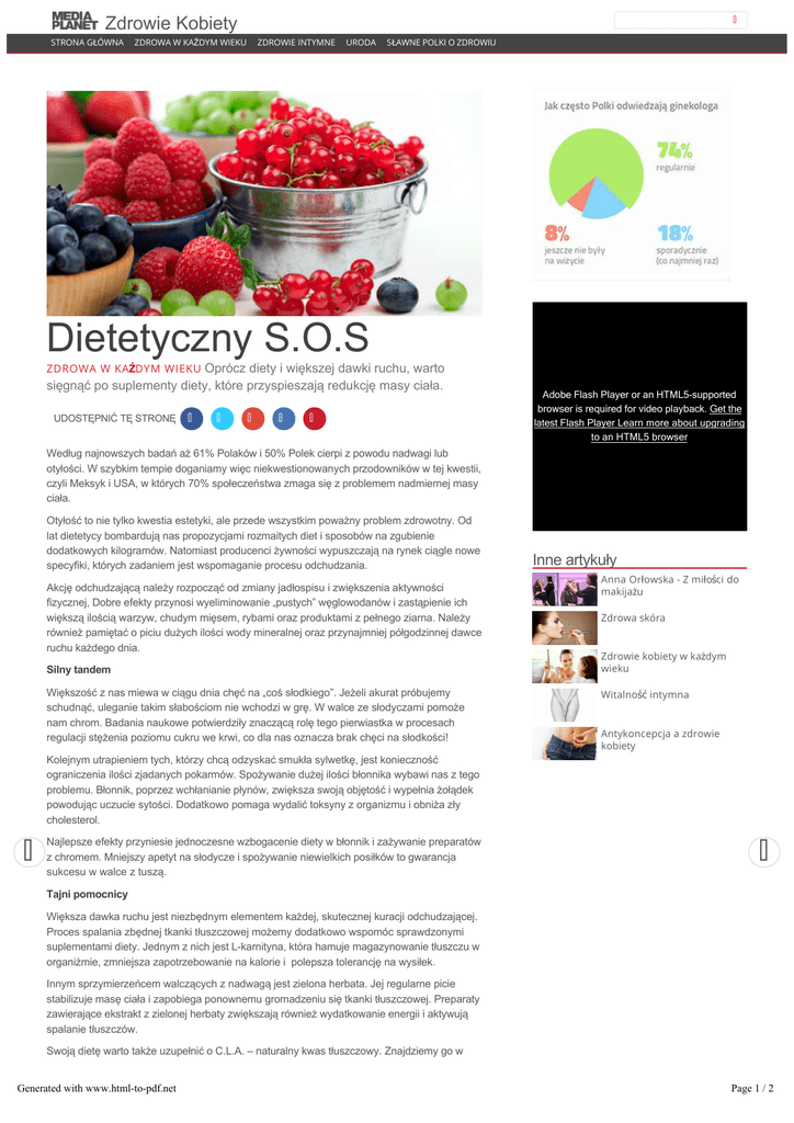 Zdrowie Kobiety STRONA GŁÓWNA ZDROWA W KAŻDYM WIEKU ZDROWIE INTYMNE URODA SŁAWNE POLKI O ZDROWIU Dietetyczny S.O.S Oprócz diety i większej dawki ruchu, warto sięgnąć po suplementy diety, które przyspieszają redukcję masy ciała. ZDROWA W KAŻDYM WIEKU UDOSTĘPNIĆ TĘ STRONĘ 0 0 0 0 0 Adobe Flash Player or an HTML5-supported browser is required for video playback. Get the latest Flash Player Learn more about upgrading to an HTML5 browser Według najnowszych badań aż 61% Polaków i 50% Polek cierpi z powodu nadwagi lub otyłości. W szybkim tempie doganiamy więc niekwestionowanych przodowników w tej kwestii, czyli Meksyk i USA, w których 70% społeczeństwa zmaga się z problemem nadmiernej masy ciała. Otyłość to nie tylko kwestia estetyki, ale przede wszystkim poważny problem zdrowotny. Od lat dietetycy bombardują nas propozycjami rozmaitych diet i sposobów na zgubienie dodatkowych kilogramów. Natomiast producenci żywności wypuszczają na rynek ciągle nowe specyfiki, których zadaniem jest wspomaganie procesu odchudzania. Akcję odchudzającą należy rozpocząć od zmiany jadłospisu i zwiększenia aktywności fizycznej, Dobre efekty przynosi wyeliminowanie „pustych” węglowodanów i zastąpienie ich większą ilością warzyw, chudym mięsem, rybami oraz produktami z pełnego ziarna. Należy również pamiętać o piciu dużych ilości wody mineralnej oraz przynajmniej półgodzinnej dawce ruchu każdego dnia. Silny tandem Większość z nas miewa w ciągu dnia chęć na „coś słodkiego”. Jeżeli akurat próbujemy schudnąć, uleganie takim słabościom nie wchodzi w grę. W walce ze słodyczami pomoże nam chrom. Badania naukowe potwierdziły znaczącą rolę tego pierwiastka w procesach regulacji stężenia poziomu cukru we krwi, co dla nas oznacza brak chęci na słodkości! Inne artykuły Anna Orłowska - Z miłości do makijażu Zdrowa skóra Zdrowie kobiety w każdym wieku Witalność intymna Antykoncepcja a zdrowie kobiety Kolejnym utrapieniem tych, którzy chcą odzyskać smukła sylwetkę, jest konieczność ograniczenia ilości zjadanych pokarmów. Spożywanie dużej ilości błonnika wybawi nas z tego problemu. Błonnik, poprzez wchłanianie płynów, zwiększa swoją objętość i wypełnia żołądek powodując uczucie sytości. Dodatkowo pomaga wydalić toksyny z organizmu i obniża zły cholesterol. Najlepsze efekty przyniesie jednoczesne wzbogacenie diety w błonnik i zażywanie preparatów z chromem. Mniejszy apetyt na słodycze i spożywanie niewielkich posiłków to gwarancja sukcesu w walce z tuszą. Tajni pomocnicy Większa dawka ruchu jest niezbędnym elementem każdej, skutecznej kuracji odchudzającej. Proces spalania zbędnej tkanki tłuszczowej możemy dodatkowo wspomóc sprawdzonymi suplementami diety. Jednym z nich jest Lkarnityna, która hamuje magazynowanie tłuszczu w organiźmie, zmniejsza zapotrzebowanie na kalorie i polepsza tolerancję na wysiłek. Innym sprzymierzeńcem walczących z nadwagą jest zielona herbata. Jej regularne picie stabilizuje masę ciała i zapobiega ponownemu gromadzeniu się tkanki tłuszczowej. Preparaty zawierające ekstrakt z zielonej herbaty zwiększają również wydatkowanie energii i aktywują spalanie tłuszczów. Swoją dietę warto także uzupełnić o C.L.A. – naturalny kwas tłuszczowy. Znajdziemy go w mięsie i nabiale. Jego ilości w pożywieniu są niewielkie, należy więc rozważyć jego suplementację. C.L.A. blokuje wchłanianie tłuszczu z pokarmu do komórek tłuszczowych Generated with www.html-to-pdf.net kierując go do mięśni, gdzie następuje spalanie w celu wytworzenia energii. Według badań opublikowanych w American Journal of Clinical Nutrition, C.L.A. zwiększa spalanie tkanki Page 1 / 2 Swoją dietę warto także uzupełnić o C.L.A. – naturalny kwas tłuszczowy. Znajdziemy go w mięsie i nabiale. Jego ilości w pożywieniu są niewielkie, należy więc rozważyć jego suplementację. C.L.A. blokuje wchłanianie tłuszczu z pokarmu do komórek tłuszczowych kierując go do mięśni, gdzie następuje spalanie w celu wytworzenia energii. Według badań opublikowanych w American Journal of Clinical Nutrition, C.L.A. zwiększa spalanie tkanki tłuszczowej podczas snu o 14%. << Poprzedni Artykuł Olga Bończyk Prawdziwe piękno tkwi w Następny Artykuł >> Zdrowa skóra każdej z nas Anna Orłowska Z miłości do makijażu Zdrowa skóra Zdrowie kobiety w każdym wieku Mediaplanet Publishing House Sp. z o.o. Ul. Wilcza 50/52 00-679 Warszawa tel. +48 22 401 75 26 Generated with www.html-to-pdf.net Zdrowie kobiety w każdym wieku Dbajmy o nasze zdrowie Witalność intymna Agnies Zaufajm Antykoncepcja a zdrowie kobiety Dojrzałe piękno © Mediaplanet 2015 | Page 2 / 2