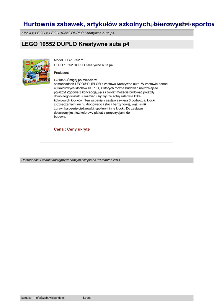 : 02 marzec 2017 Hurtownia zabawek, artykułów szkolnych,Utworzono biurowych i sportow Klocki > LEGO > LEGO 10552 DUPLO Kreatywne auta p4 LEGO 10552 DUPLO Kreatywne auta p4 Model : LG-10552 ** LEGO 10552 DUPLO Kreatywne auta p4 Producent : LG10552Śmigaj po mieście w samochodach LEGO® DUPLO® z zestawu Kreatywne auta! W zestawie ponad 40 kolorowych klocków DUPLO, z których można budować najróżniejsze pojazdy! Zgodnie z koncepcją „łącz i twórz” możecie budować pojazdy dowolnego kształtu i rozmiaru, łącząc ze sobą zaledwie kilka kolorowych klocków. Ten wspaniały zestaw zawiera 3 podwozia, klocki z oznaczeniami ruchu drogowego i stacji benzynowej, wąż, silnik, żuraw, karoserię ciężarówki, spojlery i inne klocki. Do zestawu dołączony jest też kolorowy plakat z propozycjami do budowy. Cena : Ceny ukryte Dostępność: Produkt dostępny w naszym sklepie od 19 marzec 2014 kontakt : - [email protected] Strona 1