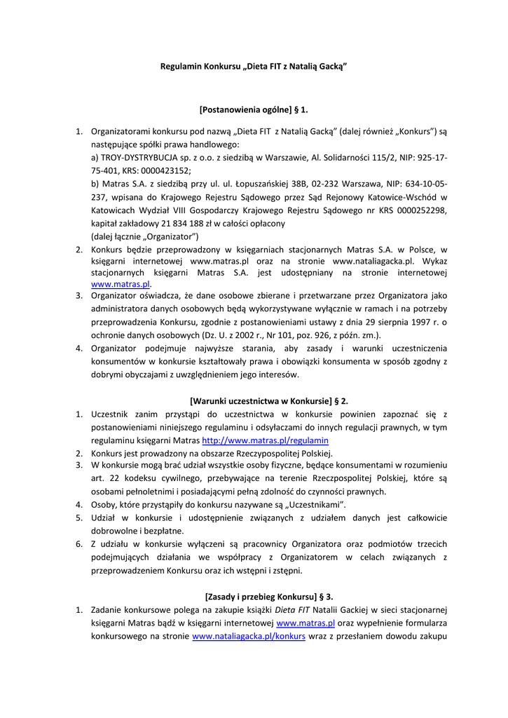 Regulamin Konkursu „Dieta FIT z Natalią Gacką” [Postanowienia ogólne] § 1. 1. Organizatorami konkursu pod nazwą „Dieta FIT z Natalią Gacką” (dalej również „Konkurs”) są następujące spółki prawa handlowego: a) TROY-DYSTRYBUCJA sp. z o.o. z siedzibą w Warszawie, Al. Solidarności 115/2, NIP: 925-1775-401, KRS: 0000423152; b) Matras S.A. z siedzibą przy ul. ul. Łopuszańskiej 38B, 02-232 Warszawa, NIP: 634-10-05237, wpisana do Krajowego Rejestru Sądowego przez Sąd Rejonowy Katowice-Wschód w Katowicach Wydział VIII Gospodarczy Krajowego Rejestru Sądowego nr KRS 0000252298, kapitał zakładowy 21 834 188 zł w całości opłacony (dalej łącznie „Organizator”) 2. Konkurs będzie przeprowadzony w księgarniach stacjonarnych Matras S.A. w Polsce, w księgarni internetowej www.matras.pl oraz na stronie www.nataliagacka.pl. Wykaz stacjonarnych księgarni Matras S.A. jest udostępniany na stronie internetowej www.matras.pl. 3. Organizator oświadcza, że dane osobowe zbierane i przetwarzane przez Organizatora jako administratora danych osobowych będą wykorzystywane wyłącznie w ramach i na potrzeby przeprowadzenia Konkursu, zgodnie z postanowieniami ustawy z dnia 29 sierpnia 1997 r. o ochronie danych osobowych (Dz. U. z 2002 r., Nr 101, poz. 926, z późn. zm.). 4. Organizator podejmuje najwyższe starania, aby zasady i warunki uczestniczenia konsumentów w konkursie kształtowały prawa i obowiązki konsumenta w sposób zgodny z dobrymi obyczajami z uwzględnieniem jego interesów. 1. 2. 3. 4. 5. 6. [Warunki uczestnictwa w Konkursie] § 2. Uczestnik zanim przystąpi do uczestnictwa w konkursie powinien zapoznać się z postanowieniami niniejszego regulaminu i odsyłaczami do innych regulacji prawnych, w tym regulaminu księgarni Matras http://www.matras.pl/regulamin Konkurs jest prowadzony na obszarze Rzeczypospolitej Polskiej. W konkursie mogą brać udział wszystkie osoby fizyczne, będące konsumentami w rozumieniu art. 22 kodeksu cywilnego, przebywające na terenie Rzeczpospolitej Polskiej, które są osobami pełnoletnimi i posiadającymi pełną zdolność do czynności prawnych. Osoby, które przystąpiły do konkursu nazywane są „Uczestnikami”. Udział w konkursie i udostępnienie związanych z udziałem danych jest całkowicie dobrowolne i bezpłatne. Z udziału w konkursie wyłączeni są pracownicy Organizatora oraz podmiotów trzecich podejmujących działania we współpracy z Organizatorem w celach związanych z przeprowadzeniem Konkursu oraz ich wstępni i zstępni. [Zasady i przebieg Konkursu] § 3. 1. Zadanie konkursowe polega na zakupie książki Dieta FIT Natalii Gackiej w sieci stacjonarnej księgarni Matras bądź w księgarni internetowej www.matras.pl oraz wypełnienie formularza konkursowego na stronie www.nataliagacka.pl/konkurs wraz z przesłaniem dowodu zakupu 2. 3. 4. 5. w formie paragonu lub faktury oraz odpowiedzią na pytanie konkursowe zawarte w formularzu. W Konkursie wezmą udział tylko zgłoszenia, do których dołączony paragon/faktura będą wskazywały na dokonanie zakupu książki w dniach od 13 kwietnia 2016r. do dnia 27 kwietnia 2016r. do godz. 23:59. Formularz zgłoszeniowy na stronie www.nataliagacka.pl/konkurs wypełniony zostać musi najpóźniej do 3 maja 2016r. do godz. 23:59. Oznacza to, że zgłoszenia nadesłane tylko w tym okresie będą brane pod uwagę w losowaniu konkursowym. Organizatorzy Konkursu nie odpowiadają za treści przesłane lub umieszczane na stronach internetowych przez Uczestników. W przypadku gdyby Uczestnik naruszył prawa osób trzecich, ponosi on wyłączną odpowiedzialność za to naruszenie. Organizator zastrzega sobie prawo usunięcia plików i komentarzy w sytuacji, gdy umieszczono je niezgodnie z regulaminem oraz gdyby uzasadnione stało się przypuszczenie, iż naruszają one prawa osób trzecich, jak również w przypadku gdyby ich treść była nieprzyzwoita lub mogła naruszać dobre obyczaje. Nie będą uwzględniane zgłoszenia, które nie spełniają wymogów opisanych w niniejszym Regulaminie. [Wyłonienie zwycięzców i nagrody] § 4. 1. W Konkursie nagrodzonych zostanie 10 Uczestników, którzy prawidłowo wypełnią formularz konkursowy oraz najlepiej odpowiedzą na pytanie w nim zawarte. 2. Konkurs wygrywają zgłoszenia, które zostaną wybrane przez Komisję Konkursową. 3. W skład Komisji Konkursowej wchodzi czterech pracowników Organizatorów konkursu. 4. Wyniki Konkursu zostaną opublikowane 6 maja 2016r. na stronie www.nataliagacka.pl/konkurs 5. Zwycięzcy Konkursu dodatkowo zostaną powiadomieni o wygranej drogą mailową, na podany przez siebie w formularzu zgłoszeniowym adres mailowy. W wiadomości mailowej zostaną poproszeni o przesłanie danych, na jaki mają zostać wysłane nagrody konkursowe. 6. W celu opublikowania na stronie www.nataliagacka.pl/konkurs wyników Konkursu, Uczestnicy wyrażają zgodę na wskazanie laureatów Konkursu w następujący sposób: imię oraz nazwisko wraz unikatowym numerem kasy rejestrującej, umieszczonym na dowodzie zakupu. 7. Nagrody zostaną przyznane w następujący sposób: a) 3 x nagroda główna w postaci stroju sportowego (koszulka, spodenki, buty, torba sportowa firmy Under Armour), książki „Zostań Fit” Natalii Gackiej, płyty DVD z ćwiczeniami Natalii Gackiej oraz kalendarza z Natalią Gacką b) 7 x nagrody pocieszenia w postaci książki „Zostań Fit” Natalii Gackiej, płyty DVD z ćwiczeniami Natalii Gackiej oraz kalendarza z Natalią Gacką 8. Uczestnicy, którzy wygrają nagrody główne będą mieli możliwość wyboru wzoru torby oraz rozmiaru i wzoru odzieży oraz obuwia z rozmiarów i wzorów dostępnych u Fundatora. O dostępnych wzorach i rozmiarach każdy Uczestnik zostanie powiadomiony indywidualnie mailowo po ogłoszeniu zwycięzców Konkursu. 9. Przedstawiane na materiałach reklamowych zdjęcia nagród są zdjęciami poglądowymi. 10. W razie braku możliwość skontaktowan