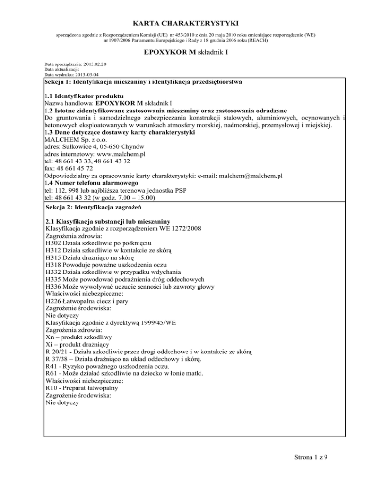 KARTA CHARAKTERYSTYKI sporządzona zgodnie z Rozporządzeniem Komisji (UE) nr 453/2010 z dnia 20 maja 2010 roku zmieniające rozporządzenie (WE) nr 1907/2006 Parlamentu Europejskiego i Rady z 18 grudnia 2006 roku (REACH) EPOXYKOR M składnik I Data sporządzenia: 2013.02.20 Data aktualizacji: Data wydruku: 2013-03-04 Sekcja 1: Identyfikacja mieszaniny i identyfikacja przedsiębiorstwa 1.1 Identyfikator produktu Nazwa handlowa: EPOXYKOR M składnik I 1.2 Istotne zidentyfikowane zastosowania mieszaniny oraz zastosowania odradzane Do gruntowania i samodzielnego zabezpieczania konstrukcji stalowych, aluminiowych, ocynowanych i betonowych eksploatowanych w warunkach atmosfery morskiej, nadmorskiej, przemysłowej i miejskiej. 1.3 Dane dotyczące dostawcy karty charakterystyki MALCHEM Sp. z o.o. adres: Sułkowice 4, 05-650 Chynów adres internetowy: www.malchem.pl tel: 48 661 43 33, 48 661 43 32 fax: 48 661 45 72 Odpowiedzialny za opracowanie karty charakterystyki: e-mail: [email protected] 1.4 Numer telefonu alarmowego tel: 112, 998 lub najbliższa terenowa jednostka PSP tel: 48 661 43 32 (w godz. 7.00 – 15.00) Sekcja 2: Identyfikacja zagrożeń 2.1 Klasyfikacja substancji lub mieszaniny Klasyfikacja zgodnie z rozporządzeniem WE 1272/2008 Zagrożenia zdrowia: H302 Działa szkodliwie po połknięciu H312 Działa szkodliwie w kontakcie ze skórą H315 Działa drażniąco na skórę H318 Powoduje poważne uszkodzenia oczu H332 Działa szkodliwie w przypadku wdychania H335 Może powodować podrażnienia dróg oddechowych H336 Może wywoływać uczucie senności lub zawroty głowy Właściwości niebezpieczne: H226 Łatwopalna ciecz i pary Zagrożenie środowiska: Nie dotyczy Klasyfikacja zgodnie z dyrektywą 1999/45/WE Zagrożenia zdrowia: Xn – produkt szkodliwy Xi – produkt drażniący R 20/21 - Działa szkodliwie przez drogi oddechowe i w kontakcie ze skórą R 37/38 – Działa drażniąco na układ oddechowy i skórę. R41 - Ryzyko poważnego uszkodzenia oczu. R61 - Może działać szkodliwie na dziecko w łonie matki. Właściwości niebezpieczne: R10 - Preparat łatwopalny Zagrożenie środowiska: Nie dotyczy Strona 1 z 9 KARTA CHARAKTERYSTYKI sporządzona zgodnie z Rozporządzeniem Komisji (UE) nr 453/2010 z dnia 20 maja 2010 roku zmieniające rozporządzenie (WE) nr 1907/2006 Parlamentu Europejskiego i Rady z 18 grudnia 2006 roku (REACH) EPOXYKOR M składnik I Data sporządzenia: 2013.02.20 Data aktualizacji: Data wydruku: 2013-03-04 2.2 Elementy oznakowania Zgodnie z rozporządzeniem (WE) 1272/2008 Piktogramy określające rodzaj zagrożenia: Hasło ostrzegawcze: Niebezpieczeństwo Zwroty określające zagrożenie: H226 Łatwopalna ciecz i pary H332 Działa szkodliwie w przypadku wdychania H312 Działa szkodliwie w kontakcie ze skórą H315 Działa drażniąco na skórę H302 Działa szkodliwie po połknięciu H335 Może powodować podrażnienia dróg oddechowych H336 Może wywoływać uczucie senności lub zawroty głowy H318 Powoduje poważne uszkodzenia oczu Zwroty określające środki ostrożności: P210 Przechowywać z dala od źródeł ciepła/iskrzenia/otwartego ognia/gorących powierzchni. Palenie wzbronione P233 Przechowywać pojemnik szczelnie zamknięty P241 Używać elektrycznego/wentylującego/oświetleniowego/przeciwwybuchowego sprzętu P261 Unikać wdychania mgły/par/rozpylonej cieczy P280 Stosować rękawice ochronne/odzież ochronną/ochronę oczu/ochronę twarzy P501 Zawartość/pojemnik usuwać zgodnie z przepisami krajowymi. Zgodnie z dyrektywą 1999/45/WE Xn - produkt szkodliwy Zawiera: ksylen, n-butanol R10 - Preparat łatwopalny R 20/21 - Działa szkodliwie przez drogi oddechowe i w kontakcie ze skórą R22 - Działa szkodliwie po połknięciu. R 37/38 – Działa drażniąco na układ oddechowy i skórę. R41 - Ryzyko poważnego uszkodzenia oczu. R67 - Pary mogą wywoływać uczucie senności i zawroty głowy. S 2 - Chronić przed dziećmi S 7/9 - Przechowywać pojemnik szczelnie zamknięty, w miejscu dobrze wentylowanym. S 23 - Nie wdychać oparów S 26 - Zanieczyszczone oczy przemyć natychmiast dużą ilością wody i zasięgnąć porady lekarza. S 37/39 - Nosić odpowiednie rękawice i okulary lub ochronę twarzy. S 46 - W razie połknięcia niezwłocznie zasięgnij porady lekarza – pokaż opakowanie lub etykietę 2.3 Inne zagrożenia Składniki mieszaniny nie spełniają kryteriów PBT lub vPvB zgodnie z załącznikiem XIII Strona 2 z 9 KARTA CHARAKTERYSTYKI sporządzona zgodnie z Rozporządzeniem Komisji (UE) nr 453/2010 z dnia 20 maja 2010 roku zmieniające rozporządzenie (WE) nr 1907/2006 Parlamentu Europejskiego i Rady z 18 grudnia 2006 roku (REACH) EPOXYKOR M składnik I Data sporządzenia: 2013.02.20 Data aktualizacji: Data wydruku: 2013-03-04 Sekcja 3: Skład/informacja o składnikach 3.1 Substancje Nie dotyczy 3.2 Mieszaniny Numer indeksowy Nazwa substancji Numer CAS Numer WE 601-022-00-9 Ksylen (mieszanina izomerów) 1330-20-7 215-535-7 603-004-00-6 n-butanol 71-36-3 200-751-6 Klasyfikacja substancji zgodna z dyrektywą 67/548/EWG Klasyfikacja zgodna z rozporządzeniem 1272/2008 % wagowy R 10 Xn; R 20/21 Xi; R 38 Flam. Liq. 3 H226 Acute Tox. 4 H332 Acute Tox. 4 H312 Skin Irrit. 2 H315 21-23 R 10-22-37/38-41-67 H226Flam. Liq. 3 Acute Tox. 4 H302 STOT SE 3 H335 Skin Irrit. 2 H315 Eye Dam. 1 H318 STOT SE 3 H336 4-6 Objaśnienia treści zwrotów znajdują się w punkcie 16 karty charakterystyki. Sekcja 4: Środki pierwszej pomocy 4.1 Opis środków pierwszej pomocy Po wdychaniu: W przypadku złego samopoczucia wynieść poszkodowanego na świeże powietrze lub do innego pomieszczenia. Transportować w bezpiecznej pozycji (bocznej ustalonej), chronić przed utratą ciepła. Wezwać lekarza. W przypadku kontaktu ze skórą: Zdjąć zabrudzone ubranie, zanieczyszczoną skórę natychmiast zmyć ciepłą wodą z mydłem i dobrze spłukać. Nie stosować rozpuszczalników ani rozcieńczalników organicznych. W razie objawów podrażnienia skóry k