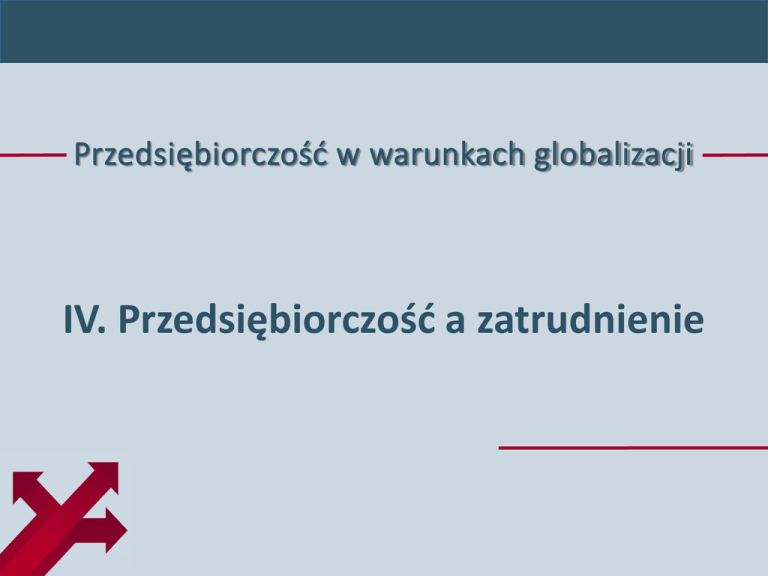 Przedsiębiorczość w warunkach globalizacji IV. Przedsiębiorczość a zatrudnienie Tematy Zatrudnienie, praca - wymiar ekonomiczny i społeczny. Kluczowe pojęcia. Miejsce pracy - dawniej i dziś. Struktura zatrudnienia w sektorze przedsiębiorstw. Kto generuje nowe miejsca pracy? Ilość a jakość miejsc pracy. Przedsiębiorczość w warunkach globalizacji 2 Zatrudnienie, praca - dlaczego istotne? (Nie)wykorzystany potencjał ludzki a stadia rozwoju gospodarczego. Bezrobocie a stan koniunktury gospodarczej. Ekonomiczny wymiar pracy i jej braku. Praca a poczucie dobrobytu i szczęścia. Przedsiębiorczość w warunkach globalizacji 3 Kto tworzy nowe miejsca pracy - ewolucja poglądów od 1979 r. F. Fazy przyspieszonego wzrostu na wszystkich etapach rozwoju firmy Duże korporacje D. Gazele E. Firmy wysokiego wpływu = wzrost obrotów + wzrost zatrudnienia B. Młode firmy C. Młode firmy startujące z wysokiego pułapu zatrudnienia A. Małe firmy Przedsiębiorczość w warunkach globalizacji 4 Jakie grupy MŚP generują nowe miejsca pracy? Małe - D. Birch 66% przyrostu netto firmy < 20 pracowników. Małe tak, ale dlatego, że młode: przyrost zatrudnienia wyraźny w pierwszej fazie, później większość firm wyhamowuje, po kilku latach efekt przyrostu marginalny a nawet negatywny. Młode startujące z wyższego pułapu. Przedsiębiorczość w warunkach globalizacji 5 Firmy dynamiczne - gazele Rodzą się małe ale z myślą o większych rozmiarach. Szybko przechodzą od mikro do małych, średnich a nawet dużych. Standard: przeciętny roczny wzrost 20% przy minimum bazowego poziomu zatrudnienia i/lub obrotów. Gazele - czy muszą być młode? Jak wspierać gazele? Przedsiębiorczość w warunkach globalizacji 6 Firmy wysokiego wpływu (high impact) Łączą szybki wzrost obrotów i zatrudnienia. W gałęziach zaawansowanych technologii wysoka dynamika obrotów - niski poziom zatrudnienia. Kogo wspierać: gazele czy firmy innowacyjne? Kluczowa rola firm wysokiego wpływu - podzbioru gazel. Przedsiębiorczość w warunkach globalizacji 7 Najnowsze wyniki badań Firmy wydatnie zwiększające zatrudnienie nie są bardzo młode. Występują w różnych gałęziach gospodarki. Firmy mają fazy przyspieszonego wzrostu zatrudnienia, po których wracają do średniej swojej branży. Ergo (poza wyjątkami) nie występują firmy o trwałej ponadprzeciętnej dynamice wzrostu. Przedsiębiorczość w warunkach globalizacji 8 Kto tworzy NOWE miejsca pracy - podsumowanie Przełomowe badania D. Bircha w USA od końca roku 1970. Ponad 30 lat badań - wyniki niejednoznaczne. Konsensus - raczej wskazanie na MŚP niż na wielkie korporacje. MŚP ale jakie? Mikro (0-9), Małe (10-49), Średnie (50-249). Znaczenie przyjętej metody pomiaru i alokacji przyrostu zatrudnienia. Przedsiębiorczość w warunkach globalizacji 9 Kto tworzy NOWE miejsca pracy - znaczenie przyjętych metod pomiaru Różnice w stosowanych metodach - różnice wyników. Podział na klasy przedsiębiorstw - tradycja amerykańska i europejska. USA - small business do 500 osób - duże. EU - mikro, małe, średnie i duże. Jak potraktować firmy, które w procesie rozwoju zmieniają „kategorie zaszeregowania”? Przedsiębiorczość w warunkach globalizacji 10 Przykład: Firma X zatrudniała w 2009 r. 5 osób, a w 2012 r. już 265 osób. Pytanie: Jak przypisać przyrost 260 nowych zatrudnionych do klas wielkości przedsiębiorstw? Metoda/klasa wielkości firmy Mikro (0-9) Małe (10-49) Średnie (50-249) Duże (250+) Razem Zatrudnienie w roku bazowym 260 Zatrudnienie w roku końcowym 260 Zatrudnienie przeciętne 260 Dynamiczna alokacja 260 Przedsiębiorczość w warunkach globalizacji 11 Przykład: Firma X zatrudniała w 2009 r. 5 osób, a w 2012 r. już 265 osób. Pytanie: Jak przypisać przyrost 260 nowych zatrudnionych do klas wielkości przedsiębiorstw? Metoda/klasa wielkości firmy Mikro (0-9) Zatrudnienie w roku bazowym 260 Małe (10-49) Średnie (50-249) 260 Zatrudnienie przeciętne 260 4 Przedsiębiorczość w warunkach globalizacji Razem 260 Zatrudnienie w roku końcowym Dynamiczna alokacja Duże (250+) 40 200 260 260 16 260 12 Przyrost zatrudnienia według klas wielkości przy zastosowaniu czterech metod - Baza INC 2007 - 2010 160 000 140 000 120 000 Rok bazowy Rok końcowy 100 000 Średnia arytmetyczna Dynamiczna alokacja 80 000 60 000 40 000 20 000 0 Mikro Małe Średnie Przedsiębiorczość w warunkach globalizacji Duże 13 Udział klas przedsiębiorstw w przyroście liczby pracujących w %: Polska 2004 - 2010 i UE 2002 - 2010 Przedsiębiorczość w warunkach globalizacji 14 Obiegowe rozumienie a kategorie statystyczne Employment, self-employment, employees, persons employed, staff headcount. Problemy z polskimi odpowiednikami: zatrudnienie, samozatrudnieni, pracujący na własny rachunek, zatrudnieni, pracodawcy, osoby zatrudnione. Przedsiębiorczość w warunkach globalizacji 15 Dylematy pomiaru i analizy - cd. Obiegowe rozumienie a kategorie statystyczne. Kluczowa rola pracodawców. Czy solo to quasi przedsiębiorcy? Co jest ważne: miejsce pracy czy zaangażowanie zawodowe? Przedsiębiorczość zależna: zagrożenie czy szansa? Jak traktować „hybrydowców”? Przedsiębiorczość w warunkach globalizacji 16 Rodzaje firm i form zatrudnienia w statystyce Przedsiębiorczość w warunkach globalizacji 17 Wewnętrzna struktura MŚP - kryterium zatrudnienia MŚP MIKRO SOLO DODATKOWA SOLO GŁÓWNA MAŁE DUŻE ŚREDNIE MIKRO PRACODAWCY ZALEŻNA Przedsiębiorczość w warunkach globalizacji 18 Pracownicy najemni, przedsiębiorcy, „strefa pośrednia” w Polsce w 2013 r. Przedsiębiorczość w warunkach globalizacji 19 Wewnętrzne zróżnicowanie sektora mikroprzedsiębiorstw Przedsiębiorczość w warunkach globalizacji 20 Jakość miejsc pracy: MŚP czy duże korporacje? Warunki pracy - kryteria Warunki zatrudnienia - kryteria Warunki BHP – oświetlenie, Wynagrodzenie. czystość, wypadkowość. Rodzaj kontraktu. Sam