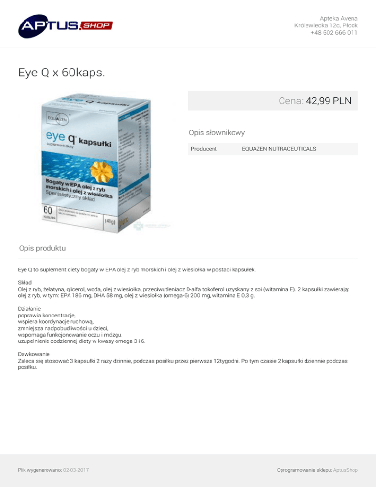 Apteka Avena Królewiecka 12c, Płock +48 502 666 011 Eye Q x 60kaps. Cena: 42,99 PLN Opis słownikowy Producent EQUAZEN NUTRACEUTICALS Opis produktu Eye Q to suplement diety bogaty w EPA olej z ryb morskich i olej z wiesiołka w postaci kapsułek. Skład Olej z ryb, żelatyna, glicerol, woda, olej z wiesiołka, przeciwutleniacz D-alfa tokoferol uzyskany z soi (witamina E). 2 kapsułki zawierają: olej z ryb, w tym: EPA 186 mg, DHA 58 mg, olej z wiesiołka (omega-6) 200 mg, witamina E 0,3 g. Działanie poprawia koncentracje, wspiera koordynacje ruchową, zmniejsza nadpobudliwości u dzieci, wspomaga funkcjonowanie oczu i mózgu. uzupełnienie codziennej diety w kwasy omega 3 i 6. Dawkowanie Zaleca się stosować 3 kapsułki 2 razy dzinnie, podczas posiłku przez pierwsze 12tygodni. Po tym czasie 2 kapsułki dziennie podczas posiłku. Plik wygenerowano: 02-03-2017 Powered by TCPDF (www.tcpdf.org) Oprogramowanie sklepu: AptusShop