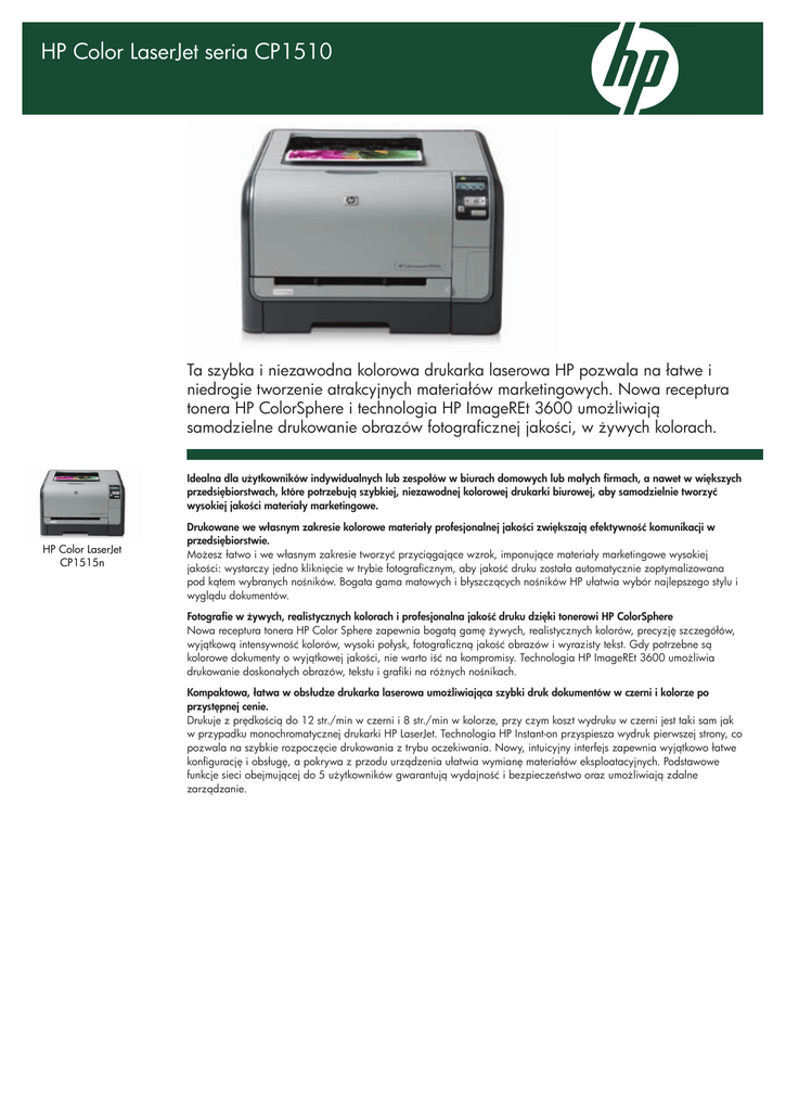 HP Color LaserJet seria CP1510 Ta szybka i niezawodna kolorowa drukarka laserowa HP pozwala na łatwe i niedrogie tworzenie atrakcyjnych materiałów marketingowych. Nowa receptura tonera HP ColorSphere i technologia HP ImageREt 3600 umożliwiają samodzielne drukowanie obrazów fotograficznej jakości, w żywych kolorach. Idealna dla użytkowników indywidualnych lub zespołów w biurach domowych lub małych firmach, a nawet w większych przedsiębiorstwach, które potrzebują szybkiej, niezawodnej kolorowej drukarki biurowej, aby samodzielnie tworzyć wysokiej jakości materiały marketingowe. HP Color LaserJet CP1515n Drukowane we własnym zakresie kolorowe materiały profesjonalnej jakości zwiększają efektywność komunikacji w przedsiębiorstwie. Możesz łatwo i we własnym zakresie tworzyć przyciągające wzrok, imponujące materiały marketingowe wysokiej jakości: wystarczy jedno kliknięcie w trybie fotograficznym, aby jakość druku została automatycznie zoptymalizowana pod kątem wybranych nośników. Bogata gama matowych i błyszczących nośników HP ułatwia wybór najlepszego stylu i wyglądu dokumentów. Fotografie w żywych, realistycznych kolorach i profesjonalna jakość druku dzięki tonerowi HP ColorSphere Nowa receptura tonera HP Color Sphere zapewnia bogatą gamę żywych, realistycznych kolorów, precyzję szczegółów, wyjątkową intensywność kolorów, wysoki połysk, fotograficzną jakość obrazów i wyrazisty tekst. Gdy potrzebne są kolorowe dokumenty o wyjątkowej jakości, nie warto iść na kompromisy. Technologia HP ImageREt 3600 umożliwia drukowanie doskonałych obrazów, tekstu i grafiki na różnych nośnikach. Kompaktowa, łatwa w obsłudze drukarka laserowa umożliwiająca szybki druk dokumentów w czerni i kolorze po przystępnej cenie. Drukuje z prędkością do 12 str./min w czerni i 8 str./min w kolorze, przy czym koszt wydruku w czerni jest taki sam jak w przypadku monochromatycznej drukarki HP LaserJet. Technologia HP Instant-on przyspiesza wydruk pierwszej strony, co pozwala na szybkie rozpoczęcie drukowania z trybu oczekiwania. Nowy, intuicyjny interfejs zapewnia wyjątkowo łatwe konfigurację i obsługę, a pokrywa z przodu urządzenia ułatwia wymianę materiałów eksploatacyjnych. Podstawowe funkcje sieci obejmującej do 5 użytkowników gwarantują wydajność i bezpieczeństwo oraz umożliwiają zdalne zarządzanie. Informacje o zamawianiu Dane techniczne Technologia druku Prędkość druku Procesor Pamięć Rozdzielczość druku Jakość druku Języki drukowania Ekonomiczne drukowanie Czcionki Normatywny cykl pracy (miesięcznie, format A4) Zalecana ilość stron drukuwanych miesięcznie Marginesy wydruku Obsługa nośników Nośniki Interfejsy Możliwości pracy w sieci Obsługiwane systemy operacyjne Jednoprzebiegowy, kolorowy druk laserowy A4w czerni: Do 12 str./min, w kolorze: Do 8 str./min Pierwsza wydrukowana stronaW czerni: poniżej 25,5 s z trybu gotowości, w kolorze: poniżej 31,5 s z trybu gotowości Rzeczywista prędkość druku zależy od konfiguracji systemu, wykorzystywanego oprogramowania, sterownika i stopnia złożoności dokumentu. 450 MHz, Motorola ColdFire® V5x 96 MB, Z możliwością rozszerzenia do 352 MB poprzez dodanie 256 MB pamięci DDR2 w jednym dostępnym gnieździe. W czerni: Do 600 x 600 dpi Kolor: Do 600 x 600 dpi HP ImageREt 3600 HP PCL 6, emulacja Postscript level 3 Ręczny druk dwustronny i druk kilku zmniejszonych stron na jednym arkuszu zapewniają oszczędność papieru. 80 skalowalnych czcionek TrueType Do 30000 stron 250 – 1000 górny: 3,5 mm, lewy: 3,5 mm, prawy: 3,5 mm, dolny: 3,5 mm Podawanie nośników Pojemność Waga Format Podajnik 1 arkusze: 1 od 60 do 176 g/m² (maksymalnie A4, A5, A6, B5 (ISO, JIS), od 76 x 200 g/m² z papierem HP Laser 127 do 216 x 356 mm Cover, maksymalnie 220 g/m² z papierem HP Color Laser Glossy Photo) Podajnik 2 arkusze: 150, arkusze folii: 50, od 60 do 176 g/m² (maksymalnie A4, A5, A6, B5 (ISO, JIS), od 76 x karty: 50, koperty: 10 200 g/m² z papierem HP Laser 127 do 216 x 356 mm Cover, maksymalnie 220 g/m² z papierem HP Color Laser Glossy Photo) Drukowanie Ręczny (z obsługą przez sterownik) dwustronne: Odbiór nośników: Liczba arkuszy: Do 125. Koperty: Do 10. Folie przezroczyste: Do 50 Papier (bond, do druku broszur, kolorowy, błyszczący, firmowy, fotograficzny, zwykły, wstępnie zadrukowany, dziurkowany, ekologiczny, szorstki), folia, etykiety, koperty, kartony Hi-Speed USB 2.0, 10/100Base-TX ze złączem RJ45 Przez wbudowaną kartę sieciową, przez zewnętrzne serwery druku HP Jetdirect Microsoft® Windows® 2000, XP Home, XP Professional, Server 2003; Windows Vista® Ready; System Mac OS X w wersji 10.2.8, 10.3, 10.4 lub nowszej Opcjonalnie: OS/2, UNIX, Linux, Najnowsze sterowniki do systemów Windows® i Macintosh są dostępne pod adresem http://www.hp.com/support/ljcp1510series CC377A Drukarka HP Color LaserJet CP1515n, kabel zasilania, płyta CD (podręcznik użytkownika, oprogramowanie drukarki), instrukcja rozpoczęcia pracy, 4 próbne wkłady drukujące HP Color LaserJet (błękitny, purpurowy, żółty, czarny) z tonerem HP ColorSphere o wydajności do 750 stron (zgodnie z normą ISO/IEC 19798) Serwis i pomoc techniczna Europa: UM133E Pakiety serwisowe HP Care Pack — serwis w miejscu instalacji w następnym dniu roboczym, 3 lata UM137E Pakiety serwisowe HP Care Pack — wymiana (standardowy czas realizacji), 3 lata UM139E Pakiety serwisowe HP Care Pack — zwrot do magazynu, 3 lata. (UM139E: tylko: kraje bałtyckie, Grecja, Polska, Turcja, Europejskie Rynki Wschodzące, Słowenia, Czechy, Słowacja, Węgry. UM133E/UM137E: pozostałe kraje europejskie) Afryka, Bliski Wschód, Basen Morza Śródziemnego: UM139E Pakiety serwisowe HP Care Pack — zwrot do magazynu, 3 lata. Informacje o zamawianiu Dane techniczne Obsługiwane sieciowe systemy operacyjne Minimalne wymagania systemowe Oprogramowanie Panel sterowania Zarządzanie