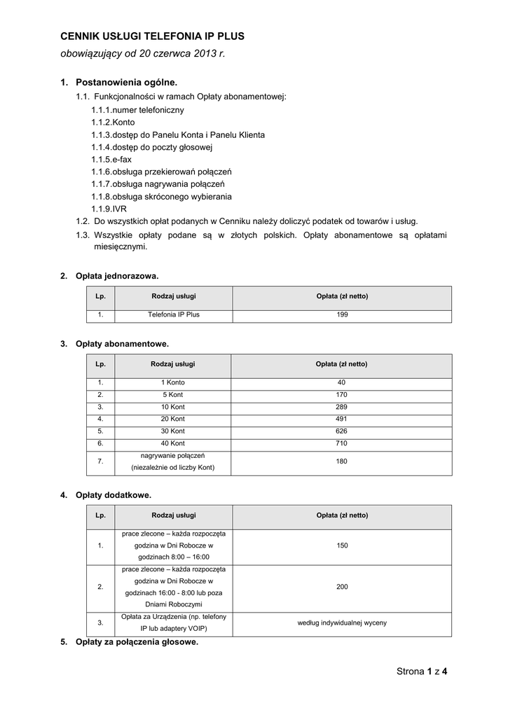 CENNIK USŁUGI TELEFONIA IP PLUS obowiązujący od 20 czerwca 2013 r. 1. Postanowienia ogólne. 1.1. Funkcjonalności w ramach Opłaty abonamentowej: 1.1.1.numer telefoniczny 1.1.2.Konto 1.1.3.dostęp do Panelu Konta i Panelu Klienta 1.1.4.dostęp do poczty głosowej 1.1.5.e-fax 1.1.6.obsługa przekierowań połączeń 1.1.7.obsługa nagrywania połączeń 1.1.8.obsługa skróconego wybierania 1.1.9.IVR 1.2. Do wszystkich opłat podanych w Cenniku należy doliczyć podatek od towarów i usług. 1.3. Wszystkie opłaty podane są w złotych polskich. Opłaty abonamentowe są opłatami miesięcznymi. 2. Opłata jednorazowa. Lp. Rodzaj usługi Opłata (zł netto) 1. Telefonia IP Plus 199 3. Opłaty abonamentowe. Lp. Rodzaj usługi Opłata (zł netto) 1. 1 Konto 40 2. 5 Kont 170 3. 10 Kont 289 4. 20 Kont 491 5. 30 Kont 626 6. 40 Kont 710 7. nagrywanie połączeń (niezależnie od liczby Kont) 180 4. Opłaty dodatkowe. Lp. Rodzaj usługi Opłata (zł netto) prace zlecone – każda rozpoczęta 1. godzina w Dni Robocze w 150 godzinach 8:00 – 16:00 prace zlecone – każda rozpoczęta 2. godzina w Dni Robocze w godzinach 16:00 - 8:00 lub poza 200 Dniami Roboczymi 3. Opłata za Urządzenia (np. telefony IP lub adaptery VOIP) według indywidualnej wyceny 5. Opłaty za połączenia głosowe. Strona 1 z 4 CENNIK USŁUGI TELEFONIA IP PLUS obowiązujący od 20 czerwca 2013 r. 5.1. Opłaty za połączenia krajowe. Opłaty naliczane są za każdą rozpoczętą sekundę w wysokości równej 1/60 Opłaty za minutę. Opłata za 1 minutę Lp. Rodzaj połączenia 1. Połączenia wewnątrz sieci NASK Bez opłat 2. Połączenia krajowe do sieci stacjonarnych 0,08 (zł netto) Sposób naliczania przez całą dobę, wszystkie dni tygodnia przez całą dobę, wszystkie dni tygodnia Połączenia do sieci telefonii komórkowych 3. operatorów: Polska Telefonia Cyfrowa S.A., przez całą dobę, 0,22 Polkomtel Sp. z o.o., PTK Centertel Sp. z wszystkie dni tygodnia o.o., P4 Sp. z o.o., Cyfrowy Polsat S.A. Połączenia do sieci telefonii komórkowych 4. pozostałych operatorów oraz operatorów przez całą dobę, 0,45 wszystkie dni tygodnia wirtualnych 5.2. Opłaty za połączenia międzynarodowe w ruchu automatycznym do sieci stacjonarnych. Opłaty naliczane są za każdą rozpoczętą sekundę w wysokości równej 1/60 Opłaty za minutę. Strefa Kraj 1 Andora, Australia, Austria, Belgia, Bułgaria, Chorwacja, Cypr, Czechy, Dania, Estonia, Finlandia, Francja, Grecja, Hiszpania, Holandia, Irlandia, Kanada, Litwa, Luxemburg, Łotwa, Malta, Niemcy, Nowa Zelandia, Norwegia, Portugalia, Rumunia, Słowacja, Słowenia, Stany Zjednoczone, Szwecja, Szwajcaria, Turcja, Węgry, Wielka Brytania, Włochy 2 Algieria, Argentyna, Brazylia, Chiny, Gruzja, Hongkong, Indie, Islandia, Japonia, Kazachstan, Korea Południowa, Lichtenstein, Monako, Republika Południowej Afryki, Rosja, Czarnogóra, Singapur, Tajlandia, Tajwan, Uzbekistan, Wietnam 3 Abchazja, Albania, Arabia Saudyjska, Armenia, Bahamy, Bośnia i Hercegowina, Czarnogóra, Egipt, Gibraltar, Iran, Irak, Jemen, Kuwejt, Kirgistan, Macedonia, Malezja, Maroko, Meksyk, Mołdawia, Pakistan, Serbia, Tadżykistan, Turkmenistan, Ukraina, Wyspy Dziewicze Stanów Zjednoczonych, Wyspy Dziewicze, Wielkiej Brytanii 4 Afganistan, Angola, Anguilla, Antarktyka, Antigua i Barbuda, Antyle Holenderskie, Aruba, AustraliaTerytoria Zewnętrzne, Azerbejdżan, Bahrajn, Bangladesz, Barbados, Bermudy, Białoruś, Boliwia, Botswana, Brunei, Burkina Faso, Chile, Czad, Dominika, Dominikana, Ekwador, Etiopia, Falklandy, Fidżi, Filipiny, Gana, Grenada, Grenlandia, Gujana, Gujana Francuska, Gwadelupa, Gwatemala, Gwinea, Gwinea Równikowa, Haiti, Honduras, Indonezja, Izrael, Jamajka, Jordan, Kambodża, Kamerun, Katar, Kenia, Kolumbia, Kongo, Korea Północna, Kostaryka, Laos, Liberia, Libia, Madagaskar, Malediwy, Mali, Martynika, Mauretania, Mauritius, Mikronezja, Mongolia, Mozambik, Namibia, Nepal, Niger, Nigeria, Nikaragua, Palau, Palestyna, Panama, Paragwaj, Peru, Polinezja Francuska, Portoryko, Republika Środkowoafrykańska, Rwanda, San Marino, Samoa Amerykańskie, Senegal, Seszele, Somalia, Sri Lanka, Sudan, Surinam, Syria, Tanzania, Trinidad i Tobago, Uganda, Urugwaj, Wenezuela, Wyspy Marshalla, Zambia, Zimbabwe, Zjednoczone Emiraty Arabskie 5 Belize, Benin, Bhutan, Birma, Burundi, Diego Garcia, Dżibuti, Salwador, Erytrea, Gabon, Gambia, Guam, Guantanamo, Gwinea Bissau, Jemen, Kajmany, Kiribati, Komory, Kuba, Lesotho, Liban, Makau, Malawi, Mariany Północne, Montserrat, Nauru, Niue, Norfolk, Nowa Kaledonia, Oman, Papua Nowa Gwinea, Reunion, Święta Helena, Saint Kitts, Saint Lucia, Saint Pierre i Miquelon, Saint Vincent i Grenadyny, Samoa Zachodnia, Wyspy Św. Tomasza i Książęca, Sierra Leone, Suazi, Togo, Tokelau, Tonga, Turks i Caicos, Tuvalu, Tunezja, Vanuatu, Wallis i Futuna, Wybrzeże Kości Słoniowej, Wyspy Cooka, Wyspy Owcze, Wyspy Salomona, Wyspy Wniebowstąpienia, Wyspy Zielonego Przylądka Opłata za 1 min (zł netto) 0,29 0,90 1,50 2,90 4,50 Strona 2 z 4 CENNIK USŁUGI TELEFONIA IP PLUS obowiązujący od 20 czerwca 2013 r. 5.3. Opłaty za połączenia międzynarodowe w ruchu automatycznym do sieci komórkowych. Opłaty naliczane są za każdą rozpoczętą sekundę w wysokości równej 1/60 Opłaty za minutę. Strefa Kraj 1 Austria, Belgia, Bułgaria, Cypr, Czechy, Dania, Finlandia, Francja, Niemcy, Grecja, Hiszpania, Holandia, Islandia, Kanada, Litwa, Luxemburg, Litwa, Malta, Niemcy, Nowa Zelandia, Norwegia, Portugalia, Rumunia, San Marino, Słowacja, Słowenia, Stany Zjednoczone, Szwecja, Węgry, Wielka Brytania, Włochy 2 Australia, Brazylia, Chiny, Chorwacja, Gruzja, Hongkong, Indie, Izrael, Kazachstan, Kirgistan, Korea Południowa, Lichtenstein, Łotwa, Rosja, Republika Południowej Afryki, Singapur, Szwajcaria, Tajlandia, Tajwan, Turcja, Turkmenistan, Ukraina, Uzbekistan, Wietnam Opłata za 1 min (zł netto) 0,90 1,50 3 Abchazja, Albania, Algieria, Andora, Argentyna, Armenia, A