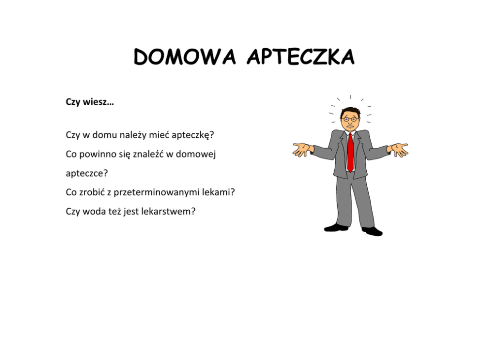 DOMOWA APTECZKA Czy wiesz… Czy w domu należy mieć apteczkę? Co powinno się znaleźć w domowej apteczce? Co zrobić z przeterminowanymi lekami? Czy woda też jest lekarstwem? W każdym domu powinna być apteczka. Może nią być wydzielona szafka lub szuflada, ważne, aby każdy domownik wiedział, gdzie ona się znajduje oraz aby małe dzieci nie miały do niej dostępu. W domowej apteczce powinny się znaleźć: 1) Środki opatrunkowe, czyli plaster z opatrunkiem i bez, bandaż elastyczny i zwykły oraz gaza jałowa, dostępne są także wygodne opatrunki w sprayu. 2) Środki do odkażania, czyli woda utleniona, może też być jodyna. 3) Podstawowe lekarstwa, czyli środek przeciwbólowy, węgiel leczniczy, środek na oparzenia słoneczne i inne w zależności od leków stosowanych przez domowników lub indywidualnych potrzeb. 4) Termometr. Przeterminowane lekarstwa należy odnieść do apteki, w której znajduje się odpowiednio oznakowany pojemnik. Lekarstw nie wolno wyrzucać do śmietników, ponieważ ich dalsze losy nie są wtedy znane i może się zdarzyć, że zostaną zjedzone przez dzieci lub zwierzęta stając się przyczyną zatruć. UWAGA!!! W domu podstawowym środkiem ratunkowym i leczniczym jest CHŁODNA WODA. Przemycie rany wodą, schłodzenie oparzenia, chłodny prysznic po długim pobycie na słońcu, picie dużej ilości wody podczas upałów lub choroby nigdy nie zaszkodzi, a w większości przypadków jest pierwszym i podstawowym działaniem ratowniczym. Opracowanie: JRG II Katowice
