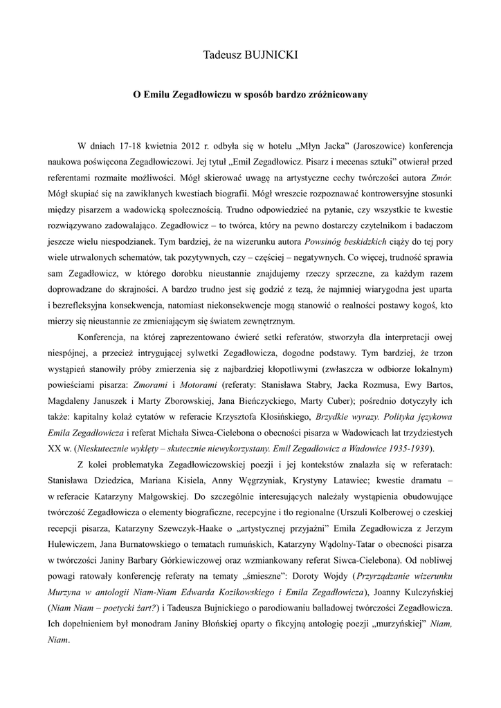 Tadeusz BUJNICKI O Emilu Zegadłowiczu w sposób bardzo zróżnicowany W dniach 17-18 kwietnia 2012 r. odbyła się w hotelu „Młyn Jacka” (Jaroszowice) konferencja naukowa poświęcona Zegadłowiczowi. Jej tytuł „Emil Zegadłowicz. Pisarz i mecenas sztuki” otwierał przed referentami rozmaite możliwości. Mógł skierować uwagę na artystyczne cechy twórczości autora Zmór. Mógł skupiać się na zawikłanych kwestiach biografii. Mógł wreszcie rozpoznawać kontrowersyjne stosunki między pisarzem a wadowicką społecznością. Trudno odpowiedzieć na pytanie, czy wszystkie te kwestie rozwiązywano zadowalająco. Zegadłowicz – to twórca, który na pewno dostarczy czytelnikom i badaczom jeszcze wielu niespodzianek. Tym bardziej, że na wizerunku autora Powsinóg beskidzkich ciąży do tej pory wiele utrwalonych schematów, tak pozytywnych, czy – częściej – negatywnych. Co więcej, trudność sprawia sam Zegadłowicz, w którego dorobku nieustannie znajdujemy rzeczy sprzeczne, za każdym razem doprowadzane do skrajności. A bardzo trudno jest się godzić z tezą, że najmniej wiarygodna jest uparta i bezrefleksyjna konsekwencja, natomiast niekonsekwencje mogą stanowić o realności postawy kogoś, kto mierzy się nieustannie ze zmieniającym się światem zewnętrznym. Konferencja, na której zaprezentowano ćwierć setki referatów, stworzyła dla interpretacji owej niespójnej, a przecież intrygującej sylwetki Zegadłowicza, dogodne podstawy. Tym bardziej, że trzon wystąpień stanowiły próby zmierzenia się z najbardziej kłopotliwymi (zwłaszcza w odbiorze lokalnym) powieściami pisarza: Zmorami i Motorami (referaty: Stanisława Stabry, Jacka Rozmusa, Ewy Bartos, Magdaleny Januszek i Marty Zborowskiej, Jana Bieńczyckiego, Marty Cuber); pośrednio dotyczyły ich także: kapitalny kolaż cytatów w referacie Krzysztofa Kłosińskiego, Brzydkie wyrazy. Polityka językowa Emila Zegadłowicza i referat Michała Siwca-Cielebona o obecności pisarza w Wadowicach lat trzydziestych XX w. (Nieskutecznie wyklęty – skutecznie niewykorzystany. Emil Zegadłowicz a Wadowice 1935-1939). Z kolei problematyka Zegadłowiczowskiej poezji i jej kontekstów znalazła się w referatach: Stanisława Dziedzica, Mariana Kisiela, Anny Węgrzyniak, Krystyny Latawiec; kwestie dramatu – w referacie Katarzyny Małgowskiej. Do szczególnie interesujących należały wystąpienia obudowujące twórczość Zegadłowicza o elementy biograficzne, recepcyjne i tło regionalne (Urszuli Kolberowej o czeskiej recepcji pisarza, Katarzyny Szewczyk-Haake o „artystycznej przyjaźni” Emila Zegadłowicza z Jerzym Hulewiczem, Jana Burnatowskiego o tematach rumuńskich, Katarzyny Wądolny-Tatar o obecności pisarza w twórczości Janiny Barbary Górkiewiczowej oraz wzmiankowany referat Siwca-Cielebona). Od nobliwej powagi ratowały konferencję referaty na tematy „śmieszne”: Doroty Wojdy (Przyrządzanie wizerunku Murzyna w antologii Niam-Niam Edwarda Kozikowskiego i Emila Zegadłowicza), Joanny Kulczyńskiej (Niam Niam – poetycki żart?) i Tadeusza Bujnickiego o parodiowaniu balladowej twórczości Zegadłowicza. Ich dopełnieniem był monodram Janiny Błońskiej oparty o fikcyjną antologię poezji „murzyńskiej” Niam, Niam. Ambicje generalizujące, syntetyczne miały końcowe wystąpienia: Weroniki Grudzień – Koprowskiej (Osobowość twórcza Emila Zegadłowicza w świetle badań z zakresu psychologii twórczości), Włodzimierza Próchnickiego (Emil Zegadłowicz – wielość perspektyw) i Henryka Czubały (Zegadłowicza doświadczanie świata). Samo to wyliczenie – rzecz jasna – o charakterze konferencji mówi jedynie częściowo i zakreśla z grubsza jej ramę tematyczną. Autentyczną wartość miała dyskusja; rozwijająca niektóre pomysły, polemiczna i aprobatywna wobec sposobów ujmowania dorobku pisarza i jego relacji ze środowiskiem. Nie bez znaczenia była szersza oprawa: wystąpienia przedstawicieli rodziny: państwa Wegenke, wymieniony wyżej spektakl Janiny Błońskiej, spotkania i dyskusje kuluarowe w „Młynie Jacka” oraz na „Wieczorze w dworze poety” w Gorzeniu Górnym. W organizację konferencji zaangażowały się poważne ośrodki badań na literaturą międzywojnia: Wydział Polonistyki UJ, Instytut Nauk o Literaturze Polskiej U. Śl., Instytut Filologii Polskiej UP im. Komisji Edukacji Narodowej w Krakowie. Wspierała ją Fundacja „Czartak” Muzeum Emila Zegadłowicza. Dodać należy, iż konferencja miała także życzliwe wsparcie Urzędu Miasta Wadowice i osobiście – pani burmistrz Ewy Filipiak. Wypowiadając osobiste zdanie o konferencji, powiem, iż były na niej referaty lepsze i gorsze; bardziej zajmujące i skupiające na sobie mniejszą uwagę, jednak biorąc rzecz jako całość, należy uznać, iż było to spotkanie ważne i momentami frapujące. Prezentowany Zegadłowicz nie był ani pisarzem z pomnika, ani godnym zapomnienia „bluźniercą”. Konferencja skłaniała wyraźnie do wieloaspektowego oglądu tego, co twórca pozostawił po sobie, zwłaszcza w dziedzinie twórczej. A jednak zabrakło na konferencji (lub pojawiły się one tylko na drugim planie) kilku – jak się wydaje – szczególnie znaczących wątków. Przede wszystkim szerszego opisu środowiska inteligenckotwórczego Wadowic w latach międzywojennych, ważnego jako tła dla działalności twórczej i kulturowej Zegadłowicza; dokładniejszej interpretacji działań grupy „Czartak”, przedstawienia aktywności Zegadłowicza jako mecenasa sztuki ludowej (zwłaszcza jako „odkrywcy” Wowry); brakowało także problematyki związanej z wielkim epizodem „radiowym” (Poznańskim i Katowickim) w jego biografii. Wymieniłem tylko niektóre tematy, które na pewno warto „zagospodarować”. Jest to zarazem propozycja na przyszłość; prace nad dorobkiem Zegadłowicza nie powinny być zdarzeniem okazjonalnym, lecz zapoczątkować działania szersze