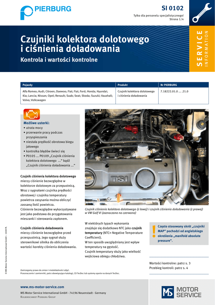 SI 0102 I n f o r m at i o n SERVICE Tylko dla personelu specjalistycznego! Strona 1/4 Czujniki kolektora dolotowego i ciśnienia doładowania Kontrola i wartości kontrolne Pojazdy Produkt Nr PIERBURG Alfa Romeo; Audi; Citroen; Daewoo; Fiat; Fiat; Ford; Honda; Hyundai; Kia; Lancia; Nissan; Opel; Renault; Saab; Seat; Skoda; Suzuki; Vauxhall; Volvo; Volkswagen Czujnik kolektora dolotowego i ciśnienia doładowania 7.18222.01.0 ... .21.0 Możliwe usterki: •utrata mocy •przerwanie pracy podczas przyspieszania •niestała prędkość obrotowa biegu jałowego •kontrolka błędów świeci się •P0105 ... P0109 „Czujnik ciśnienia kolektora dolotowego ...” bądź „Czujnik ciśnienia doładowania ...” © MS Motor Service International GmbH – 1009 PL Czujnik ciśnienia kolektora dolotowego mierzy ciśnienie bezwzględne w kolektorze dolotowym za przepustnicą. Wraz z sygnałami czujnika prędkości obrotowej i czujnika temperatury powietrza zasysania można obliczyć zassaną ilość powietrza. Ciśnienie bezwzględne wykorzystywane jest jako podstawa do przygotowania mieszanki i sterowania zapłonem. Czujnik ciśnienia doładowania mierzy ciśnienie bezwzględne przed przespustnicą. Jego sygnał służy sterownikowi silnika do obliczenia wartości korekty ciśnienia doładowania. Czujnik ciśnienia kolektora dolotowego (z lewej) i czujnik ciśnienia doładowania (z prawej) w VW Golf VI (zaznaczono na czerwono) W niektórych typach wykonania znajduje się dodatkowo NTC jako czujnik temperatury (NTC= Negative Temperature Coefficient). W ten sposób uwzględniany jest wpływ temperatury na gęstość. Czujnik temperatury służy jako wielkość wejściowa obiegu chłodziwa. Zastrzegamy prawo do zmian i niedokładności zdjęć. Przeznaczenie i zamienniki, patrz obowiązujące katalogi, CD TecDoc lub systemy oparte na danych TecDoc. www.ms-motor-service.com MS Motor Service International GmbH · 74196 Neuenstadt · Germany Kolbenschmidt Pierburg Group ! Często stosowany skrót „czujniki MAP” pochodzi od angielskiego określenia „manifold absolute pressure”. Wartości kontrolne: patrz s. 3 Przebieg kontroli: patrz s. 4 SI 0102 tylko dla personelu specjalistycznego! Strona 2/4 Przegląd i styki 7.18222.01.0 C B 7.18222.08.0 a 7.18222.02.0 7.18222.03.0 7.18222.09.0 B B a C C D a 7.18222.04.0 B a C 7.18222.15.0 a 7.18222.16.0 B a C 7.18222.17.0 B a C C D a C D B a C 7.18222.11.0 B C D a 7.18222.18.0 7.18222.12.0 B C D a 7.18222.19.0 7.18222.10.0 B a B C B a C 7.18222.05.0 © MS Motor Service International GmbH – 1009 PL B B a C 7.18222.06.0 B a C 7.18222.13.0 B C a 7.18222.20.0 7.18222.07.0 C a B 7.18222.14.0 B C 7.18222.21.0 a C B B www.ms-motor-service.com MS Motor Service International GmbH · 74196 Neuenstadt · Germany Kolbenschmidt Pierburg grouP a C B D a C D a SI 0102 Tylko dla personelu specjalistycznego! Strona 3/4 Wartości kontrolne Nr handlowy Dolna wartość kontrolna Górna wartość kontrolna Dolne ciśnienie bezwzględne plow 7.18222.01.0 Górne ciśnienie bezwzględne phigh Napięcie wyjściowe Uhigh [mbar] [psi] [mV] [mbar] [psi] [mV] 150 2.17 261 (± 4%) 1020 14.8 4958 (± 4%) 7.18222.02.0 400 5.8 1349 … 1484 1000 14.5 4427 … 4562 7.18222.03.0 400 5.8 1552,5 … 1687,5 1000 14.5 3982,5 … 4117,5 7.18222.04.0 400 5.8 688 … 823 2100 30.7 3833 … 3968 7.18222.05.0 400 5.8 1532,5 … 1667,5 1000 14.5 3966,1 … 4101,1 7.18222.06.0 400 5.8 698,6 … 833,6 2100 30.7 3843,6 … 3978,6 7.18222.07.0 400 5.8 1341 … 1476 1000 14.5 4416 … 4551 7.18222.08.0 400 5.8 698,6 … 833,6 2100 30.7 3843,6 … 3978,6 7.18222.09.0 400 5.8 1552,5 … 1687,5 1000 14.5 3982,5 … 4117,5 7.18222.10.0 400 5.8 1372,5 … 1507,5 1000 14.5 4357,5 … 4492,5 7.18222.11.0 400 5.8 1552,5 … 1687,5 1000 14.5 3982,5 … 4117,5 7.18222.12.0 400 5.8 712,5 … 847,5 2000 29.0 3672,5 … 3807,5 7.18222.13.0 400 5.8 1314,5 … 1449,5 1000 14.5 3882,5 … 4017,5 7.18222.14.0 400 5.8 612,5 … 747,5 2600 37.7 3945,5 … 4080,5 7.18222.15.0 400 5.8 1552,5 … 1687,5 1000 14.5 3982,5 … 4117,5 7.18222.16.0 400 5.8 1530,5 … 1665,5 1000 14.5 3972,5 … 4107,5 7.18222.17.0 400 5.8 1221,3 … 1356,3 1000 14.5 3904,5 … 4039,5 7.18222.18.0 400 5.8 640,5 … 775,5 2600 37.7 3984,5 … 4119,5 7.18222.19.0 400 5.8 1341 … 1476 1000 14.5 4416 … 4551 7.18222.20.0 400 5.8 1228,5 … 1363,5 1000 14.5 3922,5 … 4057,5 7.18222.21.0 400 5.8 1552,5 … 1687,5 1000 14.5 3982,5 … 4117,5 Nr handlowy © MS Motor Service International GmbH – 1009 PL Napięcie wyjściowe Ulow Opór NTC [Ω] przy 25 °C 85 °C 100 °C 7.18222.03.0 2080 280 180 7.18222.09.0 2080 280 180 7.18222.11.0 2080 280 180 7.18222.12.0 2080 280 180 7.18222.18.0 2080 280 180 7.18222.20.0 2080 280 180 7.18222.21.0 2080 280 180 ! Należy pamiętać: Podane wartości kontrolne dolnego i górnego ciśnienia to dane ciśnienia bezwzględnego! Przykład: W przypadku ciśnienia atmosferycznego ok. 1000 mbar podane ciśnienie bezwzględne 400 mbar odpowiada podciśnieniu ok. 600 mbar. ! Warunki kontroli: Napięcie zasilające: 5,0 [V] Temperatura: 23 ± 5 [°C] 1 kPa = 10 mbar = 0,145 psi Styki A Masa B Sygnał wyjściowy C Napięcie zasilające 5 V D NTC Przebieg kontroli: patrz s. 4 www.ms-motor-service.com MS Motor Service International GmbH · 74196 Neuenstadt · Germany Kolbenschmidt Pierburg Group SI 0102 Tylko dla personelu specjalistycznego! Strona 4/4 Kontrola czujników kolektora dolotowego i ciśnienia doładowania Urządzenia pomocnicze: •ręczna pompka podciśnienia lub odpowiednie źródło podciśnienia i manometr podciśnienia •multimetr lub przyrząd diagnostyczny •do pomiaru temperatury: termometr (do 100°C) odpowiednie urządzenie pomocnicze do wytworzenia ciepła, np. suszarka wytwarzająca gorące powietrze Pomiar napięcia wyjściowego na czujniku ciśnienia kolektora dolotowego (zaznaczono) w Audi A4 TFSI © MS Motor Service International GmbH – 1009 PL Kontrola napięcia zasilającego •Wyciągnąć