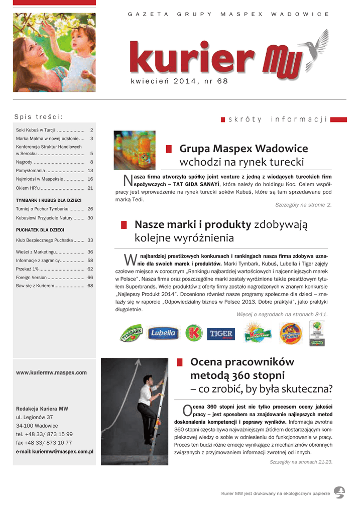 G A Z E T A G R U P Y M A S P E X W A D O W I C E kwiecień 2014, nr 68 Spis treści: s króty inform acji Soki Kubuś w Turcji ..................... 2 Marka Malma w nowej odsłonie..... 3 Grupa Maspex Wadowice wchodzi na rynek turecki Konferencja Struktur Handlowych w Serocku ................................... 5 Nagrody ...................................... 8 Pomysłomania ............................ 13 Najmłodsi w Maspeksie................ 16 Okiem HR’u................................. 21 TYMBARK I KUBUŚ DLA DZIECI Turniej o Puchar Tymbarku............ 26 Kubusiowi Przyjaciele Natury ........ 30 PUCHATEK DLA DZIECI Klub Bezpiecznego Puchatka......... 33 Wieści z Marketingu...................... 36 Informacje z zagranicy................... 58 Przekaż 1%.................................. 62 Foreign Version............................ 66 Baw się z Kurierem....................... 68 www.kuriermw.maspex.com Redakcja Kuriera MW ul. Legionów 37 34-100 Wadowice tel. +48 33/ 873 15 99 fax +48 33/ 873 10 77 e-mail: [email protected] N asza firma utworzyła spółkę joint venture z jedną z wiodących tureckich firm spożywczych – TAT GIDA SANAYİ, która należy do holdingu Koc. Celem współpracy jest wprowadzenie na rynek turecki soków Kubuś, które są tam sprzedawane pod marką Tedi. Szczegóły na stronie 2. Nasze marki i produkty zdobywają kolejne wyróżnienia W najbardziej prestiżowych konkursach i rankingach nasza firma zdobywa uznanie dla swoich marek i produktów. Marki Tymbark, Kubuś, Lubella i Tiger zajęły czołowe miejsca w corocznym „Rankingu najbardziej wartościowych i najcenniejszych marek w Polsce”. Nasza firma oraz poszczególne marki zostały wyróżnione także prestiżowym tytułem Superbrands. Wiele produktów z oferty firmy zostało nagrodzonych w znanym konkursie „Najlepszy Produkt 2014”. Doceniono również nasze programy społeczne dla dzieci – znalazły się w raporcie „Odpowiedzialny biznes w Polsce 2013. Dobre praktyki”, jako praktyki długoletnie. Więcej o nagrodach na stronach 8-11. Ocena pracowników metodą 360 stopni – co zrobić, by była skuteczna? O cena 360 stopni jest nie tylko procesem oceny jakości pracy – jest sposobem na znajdowanie najlepszych metod doskonalenia kompetencji i poprawy wyników. Informacja zwrotna 360 stopni często bywa najważniejszym źródłem dostarczającym kompleksowej wiedzy o sobie w odniesieniu do funkcjonowania w pracy. Proces ten budzi różne emocje wynikające z mechanizmów obronnych związanych z przyjmowaniem informacji zwrotnej od innych. Szczegóły na stronach 21-23. Kurier MW jest drukowany na ekologicznym papierze aktualności Grupa Maspex Wadowice utworzyła spółkę z turcką TAT GIDA SANAYİ Nasza firma utworzyła spółkę joint venture z jedną z wiodących tureckich firm spożywczych – TAT GIDA SANAYİ, która należy do holdingu Koc. Celem współpracy jest wprowadzenie na rynek turecki soków Kubuś, które od stycznia są tam sprzedawane pod marką Tedi. TAT GIDA SANAYİ jest spół- i dzieci (25% w wieku 0-14 lat). spożywczej. Współpraca z firmą ką giełdową o szerokim profilu Rynek soków, nektarów i napo- TAT GIDA SANAYİ, która jest m.in. jów w Turcji jest jeszcze rynkiem w tym kraju wiodącym produ- przetwory warzywne (zwł. pomi- słabo rozwiniętym i cechuje się centem, posiadającym dostęp dorowe) i majonezy (marka Tat), niskim spożyciem soków na oso- do rozległej sieci dystrybucji, produkty mleczne (marka Sek), bę (ok. 7 l). Turcja to także jeden stwarza nam szansę na szybkie makarony z najczęściej wybieranych przez zaistnienie na tym atrakcyjnym działalności, oferującą (marka Pastavilla) rynku. W naszej ofercie na rynku tureckim znajdują się smaki na bazie marchwi oraz kompozycji owoców, ulubionych przez tamtejsze dzieci i młodzież. Soki Kubuś polubili już konsumenci w ponad 25 krajach, więc mamy nadzieję, że ich walory zostaną również docenione w Turcji – komentuje Krzysztof Pawiński, prezes zarządu Grupy Maspex Wadowice. – Jesteśmy dumni z utworzenia joint venture z Grupą Maspex Wadowice, która jest czołowym i przetwory mięsne (marka Ma- Polaków kierunków wakacyjnych producentem ret). Firma posiada dostęp do wyjazdów. Dzięki wprowadzeniu pie Środkowo-Wschodniej i posia- jednej z największych w Turcji na tamtejszy rynek soków Kubuś da rozległą wiedzę na temat tego struktur dystrybucyjnych (Düzey – zarówno rodzice, jak i dzieci rynku. Wierzymy, że nasz nowy Company). Grupa Maspex Wa- będą mogli znaleźć na półkach produkt, skierowany do matek dowice, w ramach nawiązanej ulubiony, dobrze znany im pro- i dzieci, dzięki unikalnym cechom współpracy, jest odpowiedzial- dukt. i poprzez silnego bohatera, jakim na za działania marketingo- – Turcja z ponad 75 milio- we i promocyjne, jak również nami udzielanie wsparcia w zakresie społeczeństwem, badań, rozwoju i technologii. gospodarką i jeszcze stosunko- w Euro- jest miś Tedi, stanie się hitem młodym na rynku tureckim – zapewnia dynamiczną Pani Arzu Aslan, general mana- mieszkańców, Turcja to duży i perspektywicz- wo niskim poziomem konsump- ny rynek. Znaczną część społe- cji to bardzo atrakcyjny rynek czeństwa stanowią ludzie młodzi z punktu widzenia każdej firmy nr 68 / kwiecień 2014 soków ger TAT GIDA SANAYİ. 2 Konferencja wprowadzająca nasz produkt na rynek turecki odbyła się w grudniu w Istambule. Podczas spotkania nie zabrakło gości z zagranicy: Prezesa Krzysztofa Pawińskiego, Marka Góry czy Pawła Karkoszki. Wszyscy obecni mieli okazję poznać wyjątkowy świat Tediego, który przywołał wśród gości najpiękniejsze, dziecięce wspomnienia. W czasie konferencji przedstawiciele struktury handlowej degustowali różne warianty smakowe Tediego, by lepiej poznać nasz produkt i zrozumieć liczne atuty soków marchwiowych. Ponadto – mieli okazję osobiście spotkać się z misiem Tedim oraz wsp