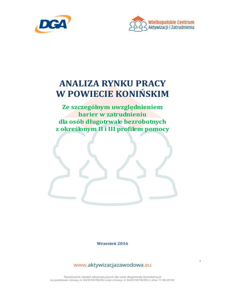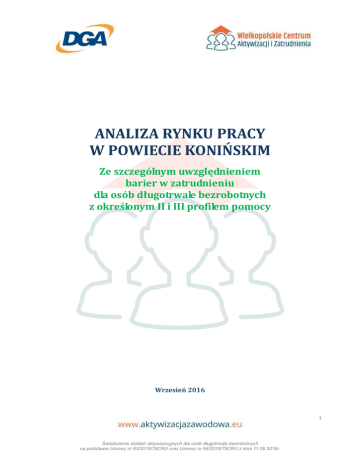 ANALIZA RYNKU PRACY W POWIECIE KONIŃSKIM Ze szczególnym uwzględnieniem barier w zatrudnieniu dla osób długotrwale bezrobotnych z określonym II i III profilem pomocy Wrzesień 2016 1 Świadczenie działań aktywizacyjnych dla osób długotrwale bezrobotnych na podstawie Umowy nr 63/2016/78CRU oraz Umowy nr 64/2016/79CRU z dnia 11.08.2016r. SPIS TREŚCI WPROWADZENIE ....................................................................................................................................................................... 3 CHARAKTERYSTYKA POWIATU KONINSKIEGO .............................................................................................................. 4 CHARAKTERYSTYKA POWIATU ...................................................................................................................................................................... 4 PKB I ATRAKCYJNOŚĆ INWESTYCYJNA .............................................................................................................................. 6 RYNEK PRACY................................................................................................................................................................................................... 7 BEZROBOTNI Z II I III PROFILEM POMOCY- STAN NA DZIEŃ 26.09.2016R. .......................................................................................... 9 ZAWODY DEFICYTOWE I NADWYŻKOWE ...................................................................................................................... 11 ANALIZA UMIEJĘTNOŚCI .............................................................................................................................................................................. 15 CHARAKTERYSTYKA OSÓB DŁUGOTRWALE BEZROBOTNYCH............................................................................... 19 PSYCHOLOGICZNE, SPOŁECZNE I EKONOMICZNE SKUTKI BEZROBOCIA ................................................................................................ 20 DETERMINANTY FUNKCJONOWANIA OSÓB DŁUGPTRWALE BEZROBOTNYCH ............................................... 23 BARIERY WYSTĘPUJĄCE U OSÓB DŁUGOTRWALE BEZROBOTNYCH ........................................................................................................ 24 DŁUGOTRWALE BEZROBOTNY OKIEM PRACODAWCY .............................................................................................................................. 26 PODSUMOWANIE .................................................................................................................................................................... 27 BIBLIOGRAFIA ......................................................................................................................................................................... 28 2 Świadczenie działań aktywizacyjnych dla osób długotrwale bezrobotnych na podstawie Umowy nr 63/2016/78CRU oraz Umowy nr 64/2016/79CRU z dnia 11.08.2016r. WPROWADZENIE Osoby długotrwale bezrobotne ujmowane są w ustawie o promocji zatrudnienia i instytucjach rynku pracy nieprzypadkowo, jako osoby będące w szczególnej sytuacji na rynku pracy. Ta szczególna sytuacja z jednej strony wynika z faktu pozostawania bez pracy dłużej niż dwanaście miesięcy w ciągu kolejnych dwudziestu czterech, z drugiej natomiast polega na specyficznej sytuacji psychospołecznej, w jakiej znajdują się te osoby. W literaturze przedmiotu wielokrotnie wskazywano na różnice w funkcjonowaniu osób długotrwale pozostających bez zatrudnienia względem innych osób bezrobotnych. Na ich specyficzną sytuację składają się m.in. liczne napięcia psychiczne, postawa rezygnacji i alienacji społecznej, nieumiejętność planowania i strukturalizacji czasu, poczucie bycia niepotrzebnym, zjawisko wyuczonej bezradności, osłabienie koncentracji uwagi i orientacji w rzeczywistości oraz pogorszenie zdrowia (dobrostanu) psychicznego zwraca jednak uwagę, że wystąpienie negatywnych skutków psychicznych wywołanych bezrobociem nie jest związane z samą utratą bądź pozostawaniem bez pracy, ale z utratą korzyści, jakie brak pracy powoduje. Osobom pozostającym w szczególnej sytuacji na rynku pracy w tym osobom z określonym II i III profilem pomocy dedykowane są różnorodne formy pomocy, określone w ustawie o promocji zatrudnienia i instytucjach rynku pracy: II profil pomocy – w tym profilu urząd pracy może zastosować dowolne formy pomocy określone w ustawie, takie jak szkolenia, skierowanie do prac interwencyjnych lub robót publicznych itd., z wyłączeniem Programu Aktywizacja i integracja; III profil – w tym profilu urząd pracy może zastosować m.in. Program Aktywizacja i Integracja, działania aktywizacyjne zlecane przez urząd, skierowanie do zatrudnienia wspieranego u pracodawcy, programy specjalne, które obejmują instrumenty wymienione w ustawie uzupełnione dodatkowymi usługami, które mogą pomagać trwałym powrocie na rynek pracy. Udział bezrobotnego w określonej formie wsparcia nie zawsze kończy się znalezieniem pracy. Można jednak wskazać na inne korzyści z tego tytułu wynikające. Cenny jest, bowiem już sam fakt podjęcia 3 Świadczenie działań aktywizacyjnych dla osób długotrwale bezrobotnych na podstawie Umowy nr 63/2016/78CRU oraz Umowy nr 64/2016/79CRU z dnia 11.08.2016r. aktywności i niepozostawania biernym w domu. W związku z powyższym celem opracowania było udzielenie odpowiedzi na pytanie o bariery, na jakie napotykają na rynku pracy długotrwale bezrobotni z określonym II i III profilem pomocy oraz o najbardziej efektywne działania na rzecz tej kategorii osób pozwalające na ich integrację zawodową i społeczną. Opracowanie powstało w ramach Projektu: Wielkopolskie Centrum Aktywizacji i Zatrudnienia, realizowanego przez DGA S.A na zlecenie: Wojewódzkiego Urzędu Pracy w Poznaniu (Świadczenie działań aktywizacyjn