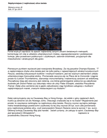 Najsłynniejsze (i najdroższe) ulice świata Wpisany przez JK Sob, 07 gru 2013 Portal bryla.pl zaprasza na spacer najbardziej zanymi ulicami światowych metropolii, komentując ich rolę w układzie urbanistycznym miatsa, zagospodarowanie i podstawowe funkcje, jako przestrzeni publicznych i użytkowych, salonów śródmieść, przyjaznych dla mieszkańców i atrakcyjnych dla gości. Pierwszym punktem wycieczki jest nowojorska Broadway. Za nią paryskie Champs-Elysees. "T a najsłynniejsza chyba ulica świata jest nie tylko jedną z najważniejszych atrakcji turystycznych Paryża, siedzibą luksusowych butików i modnych kawiarni, jest też ważnym elementem układu urbanistycznego francuskiej stolicy. Promenada zaczyna się na Place de la Concorde i ciągnie prosto ku Łukowi Triumfalnemu, stanowiąc monumentalną i malowniczą zarazem oś widokową. Początkowy bieg alei otoczony jest zielenią, zza której gdzieniegdzie widoczne są zabytkowe budowle jak Grand Palais czy odsunięty nieco do ulicy Pałac Elizejski, siedziba Prezydenta Francji. Dalej ulica zamienia się w gęsto zabudowany ciąg handlowo-usługowy z butikami najsłynniejszych marek, znanymi restauracjami czy klubami." Dalej zatrzymujemy się na Causeway Bay w Hong Kongu. Jej widok z góry zapierach dech, trudno ją odróżnić od ulic Nowego Jorku. Dlaczego znalazała się w na trasie? Wyjaśnienie jest proste: to zwycięzca rankingów na najdroższą ulicę świata. Roczny czynsz wynajmu jednego metra kwadratowego powierzchni użytkowej na tej ulicy wynosi 25 tys. euro (dla porównania przy najdroższej polskiej ulicy, czyli warszawskim Nowym Świecie cena ta wynosi 1 tys. euro). Główną funkcją Causeway Bay jest handel. "Jeżeli uznamy, że zakupy to sport, Causeway Bay jest Igrzyskami Olimpijskimi", napisano w przewodniku Discover Hong Kong. 1/2 Najsłynniejsze (i najdroższe) ulice świata Wpisany przez JK Sob, 07 gru 2013 Polecamy Państwu zwiedzenia całej trasy, która dostępna jest tutaj . Źródło: bryla.pl 2/2