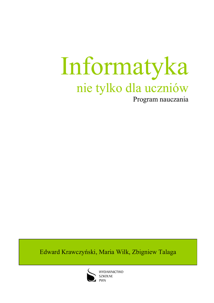 Informatyka nie tylko dla uczniów Program nauczania Edward Krawczyński, Maria Wilk, Zbigniew Talaga Spis treści: Wstęp ......................................................................................................................................... 3 Zbiorczy wykaz skrótów i oznaczeń uŜywanych w programie nauczania.......................... 3 Podstawa programowa w ujęciu tabelarycznym................................................................... 4 Omówienie załoŜeń dydaktycznych i wychowawczych, na jakich została oparta koncepcja programu ................................................................................................................ 6 Relacja programu nauczania do zakresu podstawy programowej kształcenia ogólnego . 6 Szczegółowe cele edukacyjne – kształcenia i wychowania.................................................... 7 Treści nauczania związane ze szczegółowymi celami edukacyjnymi określone w podstawie programowej kształcenia ogólnego................................................................... 7 Procedury osiągania szczegółowych celów edukacyjnych.................................................. 20 Stosowanie metod, form i zasad nauczania.......................................................................... 20 Wskazówki dotyczące procedur realizacji szczegółowych celów nauczania ...................... 21 Zalecenia dotyczące dokumentowania pracy nauczyciela informatyki w gimnazjum ........ 49 Opis załoŜonych osiągnięć ucznia określonych w podstawie programowej kształcenia ogólnego i propozycje metod ich oceny ................................................................................ 49 Specjalne warunki dotyczące realizacji programu ............................................................. 50 Zakres moŜliwych modyfikacji programu nauczania........................................................ 51 Uwagi do tworzenia autorskiego programu nauczania ........................................................ 52 Uwagi i wnioski końcowe....................................................................................................... 52 Informatyka nie tylko dla uczniów Program nauczania informatyki w gimnazjum Edward Krawczyński, Maria Wilk, Zbigniew Talaga Copyright © by Wydawnictwo Szkolne PWN Sp. z o.o. 2 Wstęp Jednym z waŜnych zadań współczesnej szkoły jest przygotowanie uczniów do Ŝycia w społeczeństwie informacyjnym. Musi ona zatem stworzyć takie warunki, aby w trakcie edukacji uczniowie mogli nabywać umiejętności stosowania technologii informacyjno-komunikacyjnych w rozwiązywaniu róŜnych problemów, wymiany zasobów informacyjnych i komunikacji. W związku z tym, na kaŜdym etapie edukacyjnym uczeń ma zajęcia w pracowni komputerowej. W pierwszym i drugim etapie edukacyjnym są to tzw. zajęcia komputerowe, w gimnazjum uczeń kształci kompetencje z zakresu stosowania narzędzi informatycznych w ramach przedmiotu informatyka. Ponadto we współczesnej szkole dąŜy się do tego, aby nauczyciele innych przedmiotów równieŜ stosowali technologię informacyjno-komunikacyjną na swoich lekcjach. Gimnazjum staje się zatem waŜnym etapem zdobywania kompetencji sprawnego wykorzystywania środowiska informacyjno-sieciowego. Jeśli do tego dodać konieczność kształtowania etycznych postaw niezbędnych do podmiotowego udziału ludzi w nowym obrazie społeczeństwa, informatyka w gimnazjum staje się przedmiotem o bardzo istotnym znaczeniu. Nowa podstawa programowa kształcenia ogólnego w zakresie informatyki w gimnazjum, zgodnie z zapisem MEN zawiera „cele kształcenia sformułowane w języku wymagań ogólnych oraz treści nauczania i oczekiwane umiejętności uczniów sformułowane w języku wymagań szczegółowych”. Prezentowany program nauczania, zachowując pełną zgodność z Podstawą programową ma przede wszystkim ułatwić nauczycielom praktyczną realizację jej zapisów. Autorzy mają nadzieję, Ŝe proponowany program pomoŜe nauczycielom w procesie dydaktycznym, w wyniku którego uczniowie opanują wiedzę i nabędą kompetencje z zakresu wykorzystania komputera w nauce i Ŝyciu codziennym. Zaleca się, by prezentowany program nauczania był traktowany jako waŜny dokument, który wchodzi w skład pakietu dla gimnazjum składającego się dodatkowo z podręcznika i przewodnika metodycznego. Te trzy publikacje są ściśle ze sobą skorelowane poprzez uwzględnienie następujących elementów: − − − − − PN nauczania (w pełni zgodny z PP – wyraźne odwołania do zapisów) dla cyklu nauczania 2 oraz 3 godzinnego; propozycje wyróŜnionych poziomów wymagań do poszczególnych bloków programowych w podręczniku i PN; propozycje procedur osiągania celów edukacyjnych; zadania i/lub ćwiczenia na końcach paragrafów (celów operacyjnych) oraz zadania przekrojowe na końcach rozdziałów; propozycje celów wychowawczych dostosowanych do przerabianego materiału. W Przewodniku metodycznym zawarto m.in.: − − propozycję programu nauczania (takŜe w wersji elektronicznej – w wersji edytora Word), łatwej do wykorzystania i ewentualnej modyfikacji); propozycje szablonu konspektu lekcji. Zbiorczy wykaz skrótów i oznaczeń uŜywanych w programie nauczania CKn cel kształcenie o numerze n TNm,k treść nauczania odnosząca się do bloku m i punktu l w zapisach PP CWl cel wychowawczy o numerze l w tabeli celów wychowawczych str. … PP podstawa programowa N nauczyciel PN program nauczania ID CK PP identyfikator celów kształcenia z tabeli PP ID TN PP identyfikator treści nauczania z tabeli PP WSO Wewnątrzszkolny System Oceniania Informatyka nie tylko dla uczniów Program nauczania informatyki w gimnazjum Edward Krawczyński, Maria Wilk, Zbigniew Talaga Copyright © by Wydawnictwo Szkolne PWN Sp. z o.o. 3 Podstawa programowa w ujęciu tabelarycznym INFORMATYKA – III etap edukacyjny Tabela 1. Cele kształcenia – wymagania ogóln