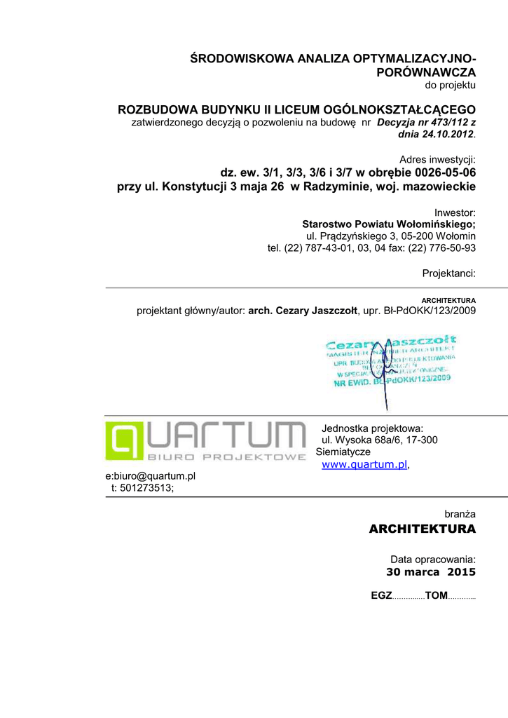 ŚRODOWISKOWA ANALIZA OPTYMALIZACYJNOPORÓWNAWCZA do projektu ROZBUDOWA BUDYNKU II LICEUM OGÓLNOKSZTAŁCĄCEGO zatwierdzonego decyzją o pozwoleniu na budowę nr Decyzja nr 473/112 z dnia 24.10.2012. Adres inwestycji: dz. ew. 3/1, 3/3, 3/6 i 3/7 w obrębie 0026-05-06 przy ul. Konstytucji 3 maja 26 w Radzyminie, woj. mazowieckie Inwestor: Starostwo Powiatu Wołomińskiego; ul. Prądzyńskiego 3, 05-200 Wołomin tel. (22) 787-43-01, 03, 04 fax: (22) 776-50-93 Projektanci: ARCHITEKTURA projektant główny/autor: arch. Cezary Jaszczołt, upr. Bł-PdOKK/123/2009 Jednostka projektowa: ul. Wysoka 68a/6, 17-300 Siemiatycze www.quartum.pl, e:[email protected] t: 501273513; branża ARCHITEKTURA Data opracowania: 30 marca 2015 EGZ………...…TOM……….... Spis treści: 1. Dane budynku 2. Zestawienie rocznego zapotrzebowania na energię użytkową 3. Dostępne nośniki energii 4. Warunki przyłączenia do sieci zewnętrznych 5. Opis systemów zapotrzebowania w energię do analizy porównawczej 6. Charakterystyka źródeł energii systemu przygotowania ciepłej wody 7. Wykresy porównawcze zużycia nośników energii 8. Wskaźniki emisji zanieczyszczeń poszczególnych systemów i nośników energii 9. Emisja zanieczyszczeń poszczególnych systemów w budynku 10. Obliczenia optymalizacyjno-porównawcze emisji zanieczyszczeń (aspekt środowiskowy) 11. Wyniki analizy porównawczej i wybór systemu zapotrzebowania na energię 1. Dane budynku Przeznaczenie budynku: Użyteczności publicznej Strefa klimatyczna: III Stacja meteorologiczna: Warszawa - Okęcie Powierzchnia zabudowy Az=1536,08,00 m 2 Powierzchnia o regulowanej temperaturze f=3224,47m2 Liczba kondygnacji: 3 2. Zestawienie rocznego zapotrzebowania na energię użytkową 2.1. Zestawienie rocznego zapotrzebowania na energię użytkową dla systemu przygotowania ciepłej wody 2.1.1. System projektowany Lp. 1 Rodzaj paliwa Miejscowe wytwarzanie energii w budynku - Gaz ziemny Udział % 100,0 QW,nd [kWh/rok] 26764,5 Rodzaj paliwa Udział % QW,nd [kWh/rok] Miejscowe wytwarzanie energii w budynku - Gaz ziemny Odnawialne źródła energii - Energia słoneczna 60,0 40,0 16058,7 10705,8 2.1.2. System alternatywny 1 2 3. Dostępne nośniki energii W chwili sporządzenia analizy dostępne źródła to energia elektryczna 4. Warunki przyłączenia do sieci zewnętrznych Podłączenie do sieci gminnych 5. Opis systemów zapotrzebowania w energię do analizy porównawczej 1 Nazwa systemu Wariant projektowany System ciepłej wody TAK, Źródło o udziale procentowym 40,00 % na paliwo Odnawialne źródła energii - Energia słoneczna, oraz o sprawności wytwarzania r|W,g=0,96, Centr. podgrz. wody — sys. z obiegami cyrkulacyjnymi z pionami instalacyjnymi i przew. rozprowadzającymi izolowanymi o sprawności przesyłu r|W,d=0,60, System przygotowania ciepłej wody użytkowej bez zasobnika ciepłej wody użytkowej o sprawności akumulacji rW,s=1,00. 6. Charakterystyka źródeł energii systemu przygotowania ciepłej wody 6.1. Budynek projektowany Rodzaj paliwa Miejscowe wytwarzanie energii w budynku - Gaz ziemny Udział % 100,0 TlW.tot 0,53 Hu 9,97 Jedn. kWh/m 3 QK,W [kWh/rok] Zużycie paliwa B Jedn. 50521,9 5067,4 m /rok 3 6.2. Budynek z alternatywnymi źródłami Rodzaj paliwa Miejscowe wytwarzanie energii w budynku - Gaz ziemny Odnawialne źródła energii Energia słoneczna Udział % TlW.tot Hu Jedn. 60,0 0,38 9,97 kWh/m 40,0 0,58 1,00 MJ/kg 3 QK,W [kWh/rok] Zużycie paliwa B Jedn. 42438,4 4256,6 m /rok 18586,5 66910,7 kWh/ro k 6.3. Porównanie zużycia nośników energii dla budynku projektowanego i źródła alternatywnego Wykres porównawczy zużycia nośników energii dla systemu przygotowania ciepłej wody 7.Wykresy porównawcze zużycia nośników energii Wykres zużycia nośników energii dla wszystkich systemów m w budynku projektowanym Wykres zużycia nośników energii dla wszystkich systemów w budynku ze źródłami alternatywnymi 3 Wykres porównawczy zużycia nośników energii dla wszystkich systemów w budynku 8. Wskaźniki emisji zanieczyszczeń poszczególnych systemów i nośników energii 8.1. Budynek projektowany Rodzaj paliwa Miejscowe wytwarzanie energii w budynku - Gaz ziemny System przygotowania ciepłej wody CO PYŁ Jedn. kg/1,0E6« 3 m 1,880000 1520,000 000 300,0000 00 2000000, 000000 0,500000 SADZA B-a-P 0,000000 0,000000 SADZA B-a-P 8.2. Budynek z alternatywnymi źródłami Rodzaj paliwa Miejscowe wytwarzanie energii w budynku - Gaz ziemny Odnawialne źródła energii - Energia słoneczna Jedn. NOX System przygotowania ciepłej wody CO PYŁ kg/1,0E6« 3 m 1,880000 1520,000 000 300,0000 00 2000000, 000000 0,500000 0,000000 0,000000 kg/GJ 0,000000 0,000000 0,000000 0,000000 0,000000 0,000000 0,000000 9. Emisja zanieczyszczeń poszczególnych systemów w budynku 9.1. Budynek projektowany System System przygotowania ciepłej wody Całkowita emisja w budynku Jedn. SO2 kg/rok 0,0095 Jedn. kg/rok 0,0095 CO CO2 PYŁ SADZA B-a-P 7,7024 1,5202 10134,78 91 0,0025 0,0000 0,0000 NOX CO PYŁ SADZA B-a-P 7,7024 1,5202 0,0025 0,0000 0,0000 10134,78 91 9.2. Budynek z alternatywnymi źródłami System Jedn. System przygotowania ciepłej wody kg/rok Całkowita emisja w budynku Jedn. kg/rok NOX CO 0,0080 6,4700 1,2770 0,0080 NOX 6,4700 CO 1,2770 PYŁ SADZA B-a-P 8513,222 8 0,0021 0,0000 0,0000 8513,222 8 PYŁ 0,0021 SADZA 0,0000 B-a-P 0,0000 10. Bezpośredni efekt ekologiczny 10.1. Tabela bezpośredniego efektu ekologicznego Emitowane zanieczyszczenie NOX CO PYŁ SADZA B-a-P Budynek z Budynek alternatywnymi źródłami Efekt ekologiczny[kg/rok] projektowany [kg/rok] [kg/rok] 0,009527 0,008002 0,001524 7,702440 6,470049 1,232390 1,520218 1,276983 0,243235 10134,789084 8513,222831 1621,566253 0,002534 0,002128 0,000405 0,000000 0,000000 0,000000 0,000000 0,000000 10.2. Wykresy bezpośredniego efektu ekologicznego 0,000000 Redukcja emisji [%] 16,00 16,00 16,00 16,00 16,00 11. Wyniki analizy porównawczej i wybór systemu zaopatrzenia w energi