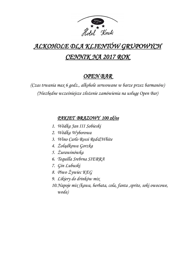 ALKOHOLE DLA KLIENTÓW GRUPOWYCH CENNIK NA 2017 ROK OPEN BAR (Czas trwania max 6 godz., alkohole serwowane w barze przez barmanów) (Niezbędne wcześniejsze złożenie zamówienia na usługę Open Bar) PAKIET BRĄZOWY 100 zł/os 1. Wódka Jan III Sobieski 2. Wódka Wyborowa 3. Wino Carlo Rossi Red&White 4. Żołądkowa Gorzka 5. Żurawinówka 6. Tequilla Srebrna SIERRA 7. Gin Lubuski 8. Piwo Żywiec KEG 9. Likiery do drinków mix 10.Napoje mix (kawa, herbata, cola, fanta ,sprite, soki owocowe, woda) PAKIET SREBRNY 115 zł/os 1. Wódka Jan III Sobieski 2. Wódka Wyborowa 3. Wino Carlo Rossi Red&White 4. Żołądkowa Gorzka 5. Żurawinówka 6. Żubrówka 7. Tequilla Złota OLMECA 8. Gin Seagram’s 9. Piwo Żywiec KEG 10.Likiery do drinków mix 11.Napoje mix (kawa, herbata, cola, fanta ,sprite, soki owocowe, woda) PAKIET ZŁOTY 130 zł/os 1. Wódka Jan III Sobieski 2. Wódka Wyborowa 3. Marques de Castilla Sauvignon Chardonnay (White) 4. Marques de Castilla Tinto (Red) 5. Żubrówka 6. Żołądkowa Gorzka 7. Żurawinówka 8. Tequilla Srebrna OLMECA 9. Tequilla Złota OLMECA 10.Gin Seagram’s 11.Whisky Johnnie Walker Red Label 12.Piwo Żywiec KEG 13.Likiery do drinków mix 14.Napoje mix (kawa, herbata, cola, fanta ,sprite, soki owocowe, woda) PAKIET PLATYNOWY 150 zł/os 1. Wódka Jan III Sobieski 2. Wódka Wyborowa 3. Martini Bianco, Extra Dry, Rosso 4. Marques de Castilla Sauvignon Chardonnay (White) 5. Marques de Castilla Tinto (Red) 6. Malibu 7. Bacardi Rum 8. Żubrówka 9. Żołądkowa Gorzka 10.Żurawinówka 11.Śliwowica 12.Tequilla Srebrna OLMECA 13.Tequilla Złota OLMECA 14.Gin Seagram’s 15.Whisky Johnnie Walker Red Label 16.Whisky Jack Daniels 17.Piwo Żywiec KEG 18.Likiery do drinków mix 19.Napoje mix (kawa, herbata, cola, fanta ,sprite, soki owocowe, woda) CENY ALKOHOLU-DETAL PODAWANEGO W BUTELKACH DLA KLIENTÓW GRUPOWYCH (Wystawiany na stoły przez kelnerów) (Niezbędne wcześniejsze złożenie zamówienia na usługę Alkohol-Detal w butelkach) 1. Wódka Luksusowa 0,5 L. 40,00 zł 2. Wódka Wyborowa 0,5 L. 40,00 zł 3. Wódka Jan III Sobieski 0,5 L. 40,00 zł 4. Wódka Bols 0,5 L. 50,00 zł 5. Wódka Finlandia 0,5 L. 60,00 zł 6. Wódka Absolut 0,5 L. 60,00 zł 7. Wino Carlo Rossi (USA) White/Red/Rose 0,75 L 40,00 zł 8. Wino Marques de Castilla (Spain) Dry White/Dry Red 50,00 zł 9. Piwo Żywiec o,5 L. But 7,00 zł 10. Piwo Żywiec KEG 30 L. na Grillowisko 300,00 zł 11. Piwo Żywiec KEG 20 L. w Sali Bankietowej lub Restauracji 200,00 zł Podane ceny zawierają 23 % VAT
