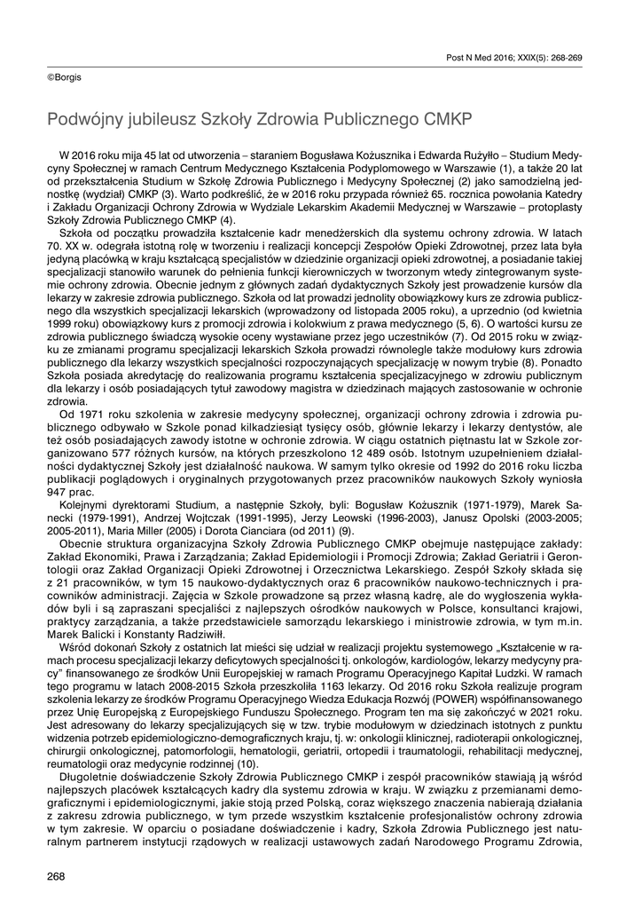 Post N Med 2016; XXIX(5): 268-269 ©Borgis Podwójny jubileusz Szkoły Zdrowia Publicznego CMKP W 2016 roku mija 45 lat od utworzenia – staraniem Bogusława Kożusznika i Edwarda Rużyłło – Studium Medycyny Społecznej w ramach Centrum Medycznego Kształcenia Podyplomowego w Warszawie (1), a także 20 lat od przekształcenia Studium w Szkołę Zdrowia Publicznego i Medycyny Społecznej (2) jako samodzielną jednostkę (wydział) CMKP (3). Warto podkreślić, że w 2016 roku przypada również 65. rocznica powołania Katedry i Zakładu Organizacji Ochrony Zdrowia w Wydziale Lekarskim Akademii Medycznej w Warszawie – protoplasty Szkoły Zdrowia Publicznego CMKP (4). Szkoła od początku prowadziła kształcenie kadr menedżerskich dla systemu ochrony zdrowia. W latach 70. XX w. odegrała istotną rolę w tworzeniu i realizacji koncepcji Zespołów Opieki Zdrowotnej, przez lata była jedyną placówką w kraju kształcącą specjalistów w dziedzinie organizacji opieki zdrowotnej, a posiadanie takiej specjalizacji stanowiło warunek do pełnienia funkcji kierowniczych w tworzonym wtedy zintegrowanym systemie ochrony zdrowia. Obecnie jednym z głównych zadań dydaktycznych Szkoły jest prowadzenie kursów dla lekarzy w zakresie zdrowia publicznego. Szkoła od lat prowadzi jednolity obowiązkowy kurs ze zdrowia publicznego dla wszystkich specjalizacji lekarskich (wprowadzony od listopada 2005 roku), a uprzednio (od kwietnia 1999 roku) obowiązkowy kurs z promocji zdrowia i kolokwium z prawa medycznego (5, 6). O wartości kursu ze zdrowia publicznego świadczą wysokie oceny wystawiane przez jego uczestników (7). Od 2015 roku w związku ze zmianami programu specjalizacji lekarskich Szkoła prowadzi równolegle także modułowy kurs zdrowia publicznego dla lekarzy wszystkich specjalności rozpoczynających specjalizację w nowym trybie (8). Ponadto Szkoła posiada akredytację do realizowania programu kształcenia specjalizacyjnego w zdrowiu publicznym dla lekarzy i osób posiadających tytuł zawodowy magistra w dziedzinach mających zastosowanie w ochronie zdrowia. Od 1971 roku szkolenia w zakresie medycyny społecznej, organizacji ochrony zdrowia i zdrowia publicznego odbywało w Szkole ponad kilkadziesiąt tysięcy osób, głównie lekarzy i lekarzy dentystów, ale też osób posiadających zawody istotne w ochronie zdrowia. W ciągu ostatnich piętnastu lat w Szkole zorganizowano 577 różnych kursów, na których przeszkolono 12 489 osób. Istotnym uzupełnieniem działalności dydaktycznej Szkoły jest działalność naukowa. W samym tylko okresie od 1992 do 2016 roku liczba publikacji poglądowych i oryginalnych przygotowanych przez pracowników naukowych Szkoły wyniosła 947 prac. Kolejnymi dyrektorami Studium, a następnie Szkoły, byli: Bogusław Kożusznik (1971-1979), Marek Sanecki (1979-1991), Andrzej Wojtczak (1991-1995), Jerzy Leowski (1996-2003), Janusz Opolski (2003-2005; 2005-2011), Maria Miller (2005) i Dorota Cianciara (od 2011) (9). Obecnie struktura organizacyjna Szkoły Zdrowia Publicznego CMKP obejmuje następujące zakłady: Zakład Ekonomiki, Prawa i Zarządzania; Zakład Epidemiologii i Promocji Zdrowia; Zakład Geriatrii i Gerontologii oraz Zakład Organizacji Opieki Zdrowotnej i Orzecznictwa Lekarskiego. Zespół Szkoły składa się z 21 pracowników, w tym 15 naukowo-dydaktycznych oraz 6 pracowników naukowo-technicznych i pracowników administracji. Zajęcia w Szkole prowadzone są przez własną kadrę, ale do wygłoszenia wykładów byli i są zapraszani specjaliści z najlepszych ośrodków naukowych w Polsce, konsultanci krajowi, praktycy zarządzania, a także przedstawiciele samorządu lekarskiego i ministrowie zdrowia, w tym m.in. Marek Balicki i Konstanty Radziwiłł. Wśród dokonań Szkoły z ostatnich lat mieści się udział w realizacji projektu systemowego „Kształcenie w ramach procesu specjalizacji lekarzy deficytowych specjalności tj. onkologów, kardiologów, lekarzy medycyny pracy” finansowanego ze środków Unii Europejskiej w ramach Programu Operacyjnego Kapitał Ludzki. W ramach tego programu w latach 2008-2015 Szkoła przeszkoliła 1163 lekarzy. Od 2016 roku Szkoła realizuje program szkolenia lekarzy ze środków Programu Operacyjnego Wiedza Edukacja Rozwój (POWER) współfinansowanego przez Unię Europejską z Europejskiego Funduszu Społecznego. Program ten ma się zakończyć w 2021 roku. Jest adresowany do lekarzy specjalizujących się w tzw. trybie modułowym w dziedzinach istotnych z punktu widzenia potrzeb epidemiologiczno-demograficznych kraju, tj. w: onkologii klinicznej, radioterapii onkologicznej, chirurgii onkologicznej, patomorfologii, hematologii, geriatrii, ortopedii i traumatologii, rehabilitacji medycznej, reumatologii oraz medycynie rodzinnej (10). Długoletnie doświadczenie Szkoły Zdrowia Publicznego CMKP i zespół pracowników stawiają ją wśród najlepszych placówek kształcących kadry dla systemu zdrowia w kraju. W związku z przemianami demograficznymi i epidemiologicznymi, jakie stoją przed Polską, coraz większego znaczenia nabierają działania z zakresu zdrowia publicznego, w tym przede wszystkim kształcenie profesjonalistów ochrony zdrowia w tym zakresie. W oparciu o posiadane doświadczenie i kadry, Szkoła Zdrowia Publicznego jest naturalnym partnerem instytucji rządowych w realizacji ustawowych zadań Narodowego Programu Zdrowia, 268 Podwójny jubileusz Szkoły Zdrowia Publicznego CMKP w tym m.in. w zakresie monitorowania i oceny stanu zdrowia i związanej z nim jakości życia społeczeństwa; identyfikacji i analizy rozpowszechnienia czynników stanowiących zagrożenie stanu zdrowia społeczeństwa; identyfikacji przyczyn nierówności w zdrowiu wynikających z uwarunkowań społeczno-ekonomicznych; inicjowania i prowadzenia badań naukowych (11). dr hab. med. Dorota Cianciara PIŚMIENNICTWO 1. 2. 3. 4. 5. 6. 7. 8. 9. 10. 11. Rozporządzenie Rady Ministrów z 9 października 