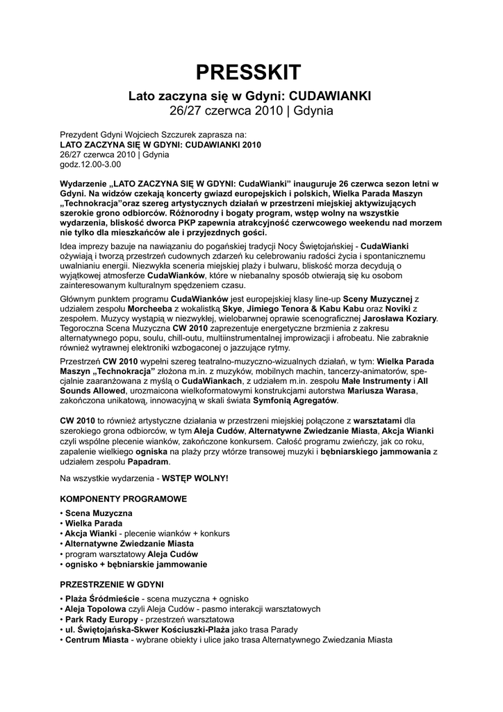 PRESSKIT Lato zaczyna się w Gdyni: CUDAWIANKI 26/27 czerwca 2010 | Gdynia Prezydent Gdyni Wojciech Szczurek zaprasza na: LATO ZACZYNA SIĘ W GDYNI: CUDAWIANKI 2010 26/27 czerwca 2010 | Gdynia godz.12.00-3.00 Wydarzenie „LATO ZACZYNA SIĘ W GDYNI: CudaWianki” inauguruje 26 czerwca sezon letni w Gdyni. Na widzów czekają koncerty gwiazd europejskich i polskich, Wielka Parada Maszyn „Technokracja”oraz szereg artystycznych działań w przestrzeni miejskiej aktywizujących szerokie grono odbiorców. Różnorodny i bogaty program, wstęp wolny na wszystkie wydarzenia, bliskość dworca PKP zapewnia atrakcyjność czerwcowego weekendu nad morzem nie tylko dla mieszkańców ale i przyjezdnych gości. Idea imprezy bazuje na nawiązaniu do pogańskiej tradycji Nocy Świętojańskiej - CudaWianki ożywiają i tworzą przestrzeń cudownych zdarzeń ku celebrowaniu radości życia i spontanicznemu uwalnianiu energii. Niezwykła sceneria miejskiej plaży i bulwaru, bliskość morza decydują o wyjątkowej atmosferze CudaWianków, które w niebanalny sposób otwierają się ku osobom zainteresowanym kulturalnym spędzeniem czasu. Głównym punktem programu CudaWianków jest europejskiej klasy line-up Sceny Muzycznej z udziałem zespołu Morcheeba z wokalistką Skye, Jimiego Tenora & Kabu Kabu oraz Noviki z zespołem. Muzycy wystąpią w niezwykłej, wielobarwnej oprawie scenograficznej Jarosława Koziary. Tegoroczna Scena Muzyczna CW 2010 zaprezentuje energetyczne brzmienia z zakresu alternatywnego popu, soulu, chill-outu, multiinstrumentalnej improwizacji i afrobeatu. Nie zabraknie również wytrawnej elektroniki wzbogaconej o jazzujące rytmy. Przestrzeń CW 2010 wypełni szereg teatralno-muzyczno-wizualnych działań, w tym: Wielka Parada Maszyn „Technokracja” złożona m.in. z muzyków, mobilnych machin, tancerzy-animatorów, specjalnie zaaranżowana z myślą o CudaWiankach, z udziałem m.in. zespołu Małe Instrumenty i All Sounds Allowed, urozmaicona wielkoformatowymi konstrukcjami autorstwa Mariusza Warasa, zakończona unikatową, innowacyjną w skali świata Symfonią Agregatów. CW 2010 to również artystyczne działania w przestrzeni miejskiej połączone z warsztatami dla szerokiego grona odbiorców, w tym Aleja Cudów, Alternatywne Zwiedzanie Miasta, Akcja Wianki czyli wspólne plecenie wianków, zakończone konkursem. Całość programu zwieńczy, jak co roku, zapalenie wielkiego ogniska na plaży przy wtórze transowej muzyki i bębniarskiego jammowania z udziałem zespołu Papadram. Na wszystkie wydarzenia - WSTĘP WOLNY! KOMPONENTY PROGRAMOWE • Scena Muzyczna • Wielka Parada • Akcja Wianki - plecenie wianków + konkurs • Alternatywne Zwiedzanie Miasta • program warsztatowy Aleja Cudów • ognisko + bębniarskie jammowanie PRZESTRZENIE W GDYNI • Plaża Śródmieście - scena muzyczna + ognisko • Aleja Topolowa czyli Aleja Cudów - pasmo interakcji warsztatowych • Park Rady Europy - przestrzeń warsztatowa • ul. Świętojańska-Skwer Kościuszki-Plaża jako trasa Parady • Centrum Miasta - wybrane obiekty i ulice jako trasa Alternatywnego Zwiedzania Miasta SZCZEGÓŁOWY PROGRAM 12.00 start CudaWianki 2010 12.00-17.00 | Aleja Topolowa + Park Rady Europy Aleja Cudów + Akcja Wianki - warsztaty i akcje 12.00-17.00 | Centrum Miasta Alternatywne Zwiedzanie Miasta 12.00-14.30 | Projekt specjalny Jazz dla dzieci 17.30-19.30 | od ul.Świętojańskiej do Skweru Kościuszki Parada „Technokracja” 20.00 | Plaża Śródmieście start scena koncertowa - koncert Noviki 21.00 | Plaża Śródmieście koncert Jimiego Tenora & Kabu Kabu „ 22.30 | Plaża Śródmieście koncert Morcheeba & Skye 00.00 | Plaża Śródmieście zapalenie ogniska + muzyka na żywo Papadram 3.00 zakończenie programu Więcej informacji: www.cudawianki.eu www.gdyniakulturalna.pl Organizator: Miasto Gdynia Sponsor: Grupa Lotos Patroni medialni: Gazeta Wyborcza, Radio Chilli Zet, Metro, gazeta.pl, TVP Kultura, 4Fun.TV, dlaStudenta.pl, muzikanova.pl, Empik, ICC PKP, trojmiasto.pl, Radio Gdańsk, przewodnik TheVisitor, City Channel Kontakt: Joanna Dąbrowska PR Manager [email protected] T: +48 517 417 263 Produkcja: Stowarzyszenie A KuKu Sztuka ARTYŚCI | OPIS PROGRAMU SCENA MUZYCZNA: MORCHEEBA & SKYE | JIMI TENOR & KABU KABU | NOVIKA Miejsce: Gdynia | Plaża Śródmieście Czas: start godz. 20.00 SCENA MUZYCZNA CW 2010 to najważniejszy komponent programowy wydarzenia. Wielka scena koncertowa, która stanie na gdyńskiej Plaży Śródmieście, bliskość morza, niezwykła oprawa scenograficzno- -świetlna autorstwa uznanego artysty Jarosława Koziary, efekty multimedialne, a przede wszystkim obecność gwiazd polskich i zagranicznych gwarantują przeżycie niezapomnianego powitania lata. CudaWianki to jedyny koncert w Polsce kultowego zespołu Morcheeba, który po siedmioletnim rozstaniu z wokalistką Skye, wydaje w czerwcu 2010 nową płytę w oryginalnym składzie pt: „Blood Like Lemonade“. Specjalnie dla publicznośći CudaWianków Morcheeba zaprezentuje nie tylko przeboje, ale także premierowe w Polsce wykonanie utworów z nowego krążka. CudaWianki to także jedyny koncert w Polsce króla muzycznego pop artu Jimiego Tenora, który wystąpi w towarzystwie legendy afrobeatu i sceny zachodniej Afryki, 7-osobowego zespołu Kabu Kabu. Tenor, należący do najbardziej oryginalnych i nieprzewidywalnych artystów live, znany z niezwykłego show i abawy na scenie z pewnością podgrzeje atmosferę CudaWiankowego koncertu. Dopełnieniem line-up‘u bedzie równie ciekawie zapowiadający się występ Noviki. Uznana polska artystka wystąpi z 7-osobowym zespołem, w tym dwiema dodatkowymi wokalistkami - Izą Kowalewską z Muzykoterapii oraz Kasią Kurzawską z Sofy. TECHNOKRACJA WIELKA PARADA MASZYN UNDER-CONSTRUCTION Trasa parady: od ul. Świętojańskiej (skrzyżowanie z Al. Marszałka Piłsudskiego) do Skweru Kościuszki (skrzyżowanie z ul. Żeromskiego) Czas: godz.: 17.30-19.30 Udział bior