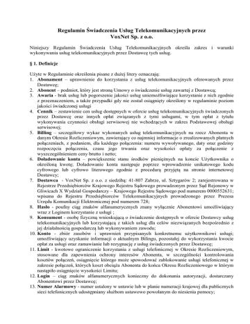 Regulamin Świadczenia Usług Telekomunikacyjnych przez VoxNet Sp. z o.o. Niniejszy Regulamin Świadczenia Usług Telekomunikacyjnych określa zakres i warunki wykonywania usług telekomunikacyjnych przez Dostawcę tych usług. § 1. Definicje Użyte w Regulaminie określenia pisane z dużej litery oznaczają: 1. Abonament – uprawnienie do korzystania z usług telekomunikacyjnych oferowanych przez Dostawcę; 2. Abonent – podmiot, który jest stroną Umowy o świadczenie usług zawartej z Dostawcą; 3. Awaria - brak usług lub pogorszenie jakości usług uniemożliwiające korzystanie z nich zgodnie z przeznaczeniem, a także przypadki gdy nie został osiągnięty określony w regulaminie poziom jakości świadczonej usługi 4. Cennik – zestawienie cen usług dostępnych w ofercie usług telekomunikacyjnych świadczonych przez Dostawcę oraz innych opłat związanych z tymi usługami, w tym opłat z tytułu wykonywania czynności obsługi serwisowej nie wchodzących w zakres Podstawowej obsługi serwisowej; 5. Billing – szczegółowy wykaz wykonanych usług telekomunikacyjnych na rzecz Abonenta w danym Okresie Rozliczeniowym, zawierający co najmniej informacje o zrealizowanych płatnych połączeniach, z podaniem, dla każdego połączenia: numeru wywoływanego, daty oraz godziny rozpoczęcia połączenia, czasu jego trwania oraz wysokości opłaty za połączenie z wyszczególnieniem ceny brutto i netto; 6. Doładowanie konta – powiększenie stanu środków pieniężnych na koncie Użytkownika o określoną kwotę; Doładowanie konta następuje poprzez wprowadzenie unikatowego kodu cyfrowego lub cyfrowo literowego zgodnie z procedurą przyjętą na stronie internetowej Dostawcy; 7. Dostawca - VoxNet Sp. z o.o. z siedzibą: 41-807 Zabrze, ul. Sztygarów 2; zarejestrowana w Rejestrze Przedsiębiorców Krajowego Rejestru Sądowego prowadzonym przez Sąd Rejonowy w Gliwicach X Wydział Gospodarczy – Krajowego Rejestru Sądowego pod numerem 0000552631; wpisana do Rejestru Przedsiębiorców Telekomunikacyjnych prowadzonego przez Prezesa Urzędu Komunikacji Elektronicznej pod numerem 728; 8. Hasło - poufny ciąg znaków alfanumerycznych znany wyłącznie Abonentowi umożliwiający wraz z Loginem korzystanie z usługi ; 9. Konsument - osobę fizyczną wnioskującą o świadczenie dostępnych w ofercie Dostawcy usług telekomunikacyjnych lub korzystającą z takich usług dla celów niezwiązanych bezpośrednio z jej działalnością gospodarczą lub wykonywaniem zawodu; 10. Konto - zbiór zasobów i uprawnień przypisanych konkretnemu użytkownikowi usługi; umożliwiający uzyskanie informacji o aktualnym Bilingu, pozostałej do wykorzystania kwocie opłat za usługi oraz zamawianie lub rezygnację z usług świadczonych przez Dostawcę; 11. Limit - kwotowe ograniczenie korzystania z usługi telefonicznej w Okresie Rozliczeniowym, stosowane dla zapewnienia ochrony interesów Abonenta, w szczególności kontrolowania kosztów połączeń, osiągnięcie którego może spowodować zablokowanie usługi telefonicznej w zakresie połączeń, których koszt obciąża Abonenta do końca Okresu Rozliczeniowego w którym nastąpiło osiągnięcie wysokości Limitu; 12. Login – ciąg znaków alfanumerycznych konieczny do dokonania autoryzacji, dostarczany Abonentowi przez Dostawcę; 13. Numer Alarmowy - numer ustalony w ustawie lub w planie numeracji krajowej dla publicznych sieci telefonicznych udostępniany służbom ustawowo powołanym do niesienia pomocy; 14. Numer Geograficzny - numer ustalony w planie numeracji krajowej, w którym część ciągu cyfr zawiera wskaźnik obszaru geograficznego, wykorzystywany do kierowania połączeń do stałej lokalizacji zakończenia sieci; 15. Numer Niegeograficzny - numer ustalony w planie numeracji krajowej, który nie zawiera ciągu cyfr określającego wskaźnik obszaru geograficznego, w szczególności numer zakończenia ruchomej publicznej sieci telefonicznej, numer do którego połączenia są bezpłatne albo o podwyższonej opłacie; 16. Okres Karencji – czas od momentu upływu Okresu Ważności, w którym Użytkownik zachowuje numer telefonu udostępniony przez Dostawcę oraz może dokonać Doładowania konta; Okres Karencji podany jest w Cenniku; 17. Okres Rozliczeniowy – okres, za który dokonywane są rozliczenia zobowiązań Abonenta wobec Dostawcy z tytułu świadczonych przez niego na rzecz Abonenta usług telekomunikacyjnych objętych Umową, rozpoczynający się i kończący we wskazanych przez Dostawcę dniach miesiąca kalendarzowego; 18. Okres Uprawnień – okres, w którym Użytkownik może korzystać z przyznanych mu bezpłatnych minut; Okres Uprawnień i ilość przyznanych bezpłatnych minut podane są w Cenniku i są zróżnicowane w zależności od kwoty Doładowania Konta; 19. Okres Ważności – okres, w którym Użytkownik może w pełni korzystać z usług; Okres Ważności podany jest w Cenniku a jego długość jest zróżnicowana w zależności od kwoty Doładowania Konta; w przypadku kolejnych Doładowań Konta Okres Ważności przedłużany jest licząc od dnia upłynięcia ostatniego Okresu Ważności; 20. Operator – przedsiębiorca telekomunikacyjny którego sieć telekomunikacyjna została udostępniona Dostawcy w celu świadczenia usług telekomunikacyjnych; 21. Opłata abonamentowa – opłata ryczałtowa pobierana za każdy Okres Rozliczeniowy, za możliwość korzystania z usług telekomunikacyjnych świadczonych przez Dostawcę; 22. PIN - indywidualny numer nadawany Abonentowi przez Dostawcę, umożliwiający identyfikację Abonenta oraz jego autoryzację przy dostępie do usług telekomunikacyjnych świadczonych przez Dostawcę; 23. Podstawowa obsługa serwisowa - obejmuje usługi w zakresie prawidłowości funkcjonowania sieci i Urządzeń Końcowych udostępnionych Abonentowi, a pozostających własnością Dostawcy, w zakresie wskazanym w § 6 Regulaminu, w tym nieodpłatną (nie dotyczy opłat