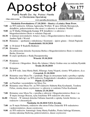17 października 2010 Nr 177 www.parafia.chroscina.eu Niedziela Powołaniowa 17.10.2010 – Siostry z Leśnicy Dom Prow. 7.00 za rodziców Alfonsa Agnieszkę Wróbel, ojca Alfreda Skrzypczyk, dziadków, pokrewieństwo obu stron i o zdrowie w rodzinie Wróbel 9.00 za Matkę Hildegardę Kampa dziadków i o zdrowie i błogosławieństwo Boże w rodzinie Dajczak 10.30 w intencji nowożeńców Artura i Anny o błogosławieństwo Boże w rodzinie Jambor Spik i Wrzód 14.30 Różaniec – spotkanie z młodzieżą i Siostrami – śpiew gitara – Dzień Papieski Poniedziałek 18.10.2010 7.00 w 30 dzień Rudolfa Bednorz 17.30 Różaniec Za ochrzczone dziecko Szymona Berka o błogosławieństwo Boże w rodzinie Berka, Krawiec 19.00 II część spotkania z Radą Duszpasterską Wtorek 19.10.2010 17.30 Różaniec O zdrowie i błogosław. Boże dla Adama i Marty Grabas oraz za rodzinę Ryndak Środa 20.10.2010 17.30 Różaniec Za rodz. Jana Marię Buhl, Hilarego Annę Nicpoń, siostry pokrew, d.cz. Czwartek 21.10.2010 17.30 Różaniec oraz Msza Św. z podzięk. Bogu za otrzymane łaski z prośbą o opiekę Bożą dla Jadwigi i za rodziców Podgórskich i dziadków i pokrewieństwo Piątek 22.10.2010 7.00 za Parafian i uczestników tej Mszy Św. 17.30 Różaniec oraz Msza Św. za rodziców Huberta Ritę Kochanek, Teodora Firlus, siostrę dusze czyśćcowe i o zdrowie w rodzinie Firlus Kochanek Sobota 23.10.2010 7.00 Różaniec oraz Msza Św. z prośbą o zdrowie i błogosławieństwo Boże i za męża Jerzego Brzoza, syna Joachima rodziców obu stron 16.00 Chrzest - W intencji dziecka Fabiana Jauernik o opiekę Anioła Stróża i za rodziców i chrzestnych Niedziela 24.10.2010 XXX Zwykła 7.00 za męża Helmuta, rodziców obu stron Firlus Zmarzlik rodzeństwo i pokrewieństwo, dusze czyśćcowe 9.00 za rodziców Antoniego Annę Marię Pudełko, Piotra Jadwigę Klemens, siostrę zakonną Hedwinę, pokrewieństwo, dusze czyśćcowe 10.30 z podziękowaniem Bogu za odebrane łaski z prośbą o zdrowie i błogosławieństwo Boże w rodzinie Baron Wolny, rodziców obu stron 14.30 przygotowanie do bierzmowania dla młodzieży III klas i Rodziców Poniedziałek 25.10.2010 17.30 Różaniec oraz Msza Św. za żonę Annelizę Pudełko, rodziców Pudełko Gala, pokrewieństwo i o zdrowie i błogosławieństwo Boże w rodzinie Wtorek 26.10.2010 17.30 Różaniec oraz Msza Św. z podziękowaniem Bogu za odebrane łaski z prośbą o zdrowie i błogosławieństwo Boże w rodzinie Krystyny i Gintra Piechaczek Środa 27.10.2010 7.00 za Parafian i uczestników tej Mszy Św. 17.30 Różaniec oraz Msza Św. za rodziców Ingrid Karola Pudełko, ojca Ryszarda Marcinkiewicz, dziadków Pudełko Gogolok Bias, ciocie wujka dusze czyśćcowe Czwartek 28.10.2010 7.00 za rodziców Pudełko Jańczyk siostrę, brata, bratową, szwagrów i o zdrowie i błogosławieństwo Boże w rodzinie 17.00 spowiedź dzieci Piątek 29.10.2010 7.00 za rodziców Józefa Gertrudę Mój pokrewieństwo dusze czyśćcowe 17.00 spowiedź młodzieży Sobota 30.10.2010 7.30 I rocznica męża Wernera Richwald 16.00 spowiedź dorosłych Niedziela 31.10.2010 XXXI zwykła 7.00 za rodziców Franciszka Franciszkę Bernard, Pawła Franciszkę Gertrudę Przywara, dziadków obu stron, pokrewieństwo, dusze czyśćcowe 9.00 na podziękowanie Bogu za otrzymane łaski z prośbą o zdrowie i błogosław. Boże w rodzinie Kołodziej, ojców Jana i Konrada, brata, d.cz. 10.30 za rodziców Elżbietę Piotra Langner, Klarę Jana Rzany pokrew. 14.30 Różaniec Poniedziałek 01.11.2010 WSZYSTKICH ŚWIĘTYCH 7.00 za rodziców Antoniego Marię Annę Pudełko, Hilarego Annę Nicpoń pokrewieństwo, dusze czyśćcowe ( w języku niemieckim) 9.00 za syna Tomasza rodziców Jerzego Marię Bauman, Pawła Annę Kluczny, pokrewieństwo 10.30 za męża Pawła Stach, rodziców Stach Kuc, rodzeństwo obu stron, pokrewieństwo Stach Kuc Anioł, dusze czyśćcowe 14.00 nabożeństwo żałobne i procesja na cmentarz Wtorek 02.11.2010 DZIEŃ ZADUSZNY 7.00 I rocznica Ryszarda Warzic 9.00 w intencji wskazanej przez Ojca Świętego 17.30 za wszystkich zmarłych, za zalecanych w wypominkach Środa 03.11.2010 7.00 za wszystkie zmarłe matki z Bractwa Matek z Mechnic 17.30 za Parafian i uczestników tej Mszy Św. Czwartek 04.11.2010 7.00 O powołania kapłańskie i zakonne z naszej parafii i rodzin oraz za żyjące i zmarłe Matki nasze Bractwa Matek Do Chorych Piątek 05.11.2010 7.00 Ku czci Najświętszego Serca Pana Jezusa na wynagrodzenie za grzechy własne oraz za żyjących i zmarłych ojców naszych Bractwa Ojców 17.30 Msza szkolna. Za parafian i uczestników tej Mszy Św. Sobota 06.11.2010 7.30 ku czci Niepokalanego Serca NMPanny na wynagrodzenie za grzechy świata oraz za nasze rodziny aby były Bogiem silne Niedziela 07.11.2010 XXXII 7.00 z podziękowaniem Bogu za otrzymane łaski z prośbą o błogosławieństwo Boże i zdrowie w rodzinie Mika Giza rodziców obu stron, dusze czyśćcowe (w języku niemieckim) 9.00 z okazji urodzin 80 lat Lidii Mróz na podziękowanie Bogu za odebrane łaski z prośbą o zdrowie i błogosławieństwo Boże oraz za męża Erharda, rodziców obu stron i krewnych 10.30 w intencji osób ze Wspólnoty bł. Edmunda Bojanowskiego 14.30 różaniec za zmarłych – zalecki, wypominki Poniedziałek 08.11.2010 7.00 z podziękowaniem Bogu za otrzymane łaski z prośbą o zdrowie i błogosław. Boże w rodzinie Hildegardy Karola Golec z okazji 60-lecia Sakramentu Małżeństwa Wtorek 09.11.2010 7.00 o zdrowie i błogosławieństwo Boże dla osób z 8 Róży Różańcowej i ich rodzin oraz za Annę Jurek, Mariannę Okos, Agnieszkę Fonfara, Agnieszkę Giza, Martę Kuc, Annelizę Pudelko Środa 10.11.2010 7.00 Z podziękowaniem Bogu za odebrane łaski z prośbą o opiekę Bożą w rodzinie i za rodziców obu stron, pokrewieństwo, dusze czyśćcowe Czwartek 11.11.2010 7.00 z podziękowaniem Bogu za otrzymane łaski z prośbą o zdrowie w rodzinie Pudelko Przywara Biene