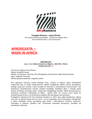 Przegląd filmowy – opisy filmów VII Festiwal Filmów Afrykańskich - AfryKamera Repliki 2012 19-22 kwietnia 2012 r./ Kino Kameralne AFROSELEKTA – MADE IN AFRICA RESTLESS CITY scen. i reż. Andrew Dosunmu, Nigeria , USA 2011, 76min. Polska premiera !!! Scenariusz: Eugene Gussenhoven Zdjęcia: Bradford Young Obsada: Sy Alassane, Sky Grey, Tony Okungbowa, Danai Gurira, Babs Olusanmonkun Język: angielski, francuski Wersje językowe pokazów: angielski, polski Film pokazuje nieznaną stronę Nowego Jorku, miasta, w którym wielu afrykańskich imigrantów żyje na skraju społeczeństwa. Młody Senegalczyk, Djibril, uliczny sprzedawca, którego pasją jest muzyka i śpiew przybył do Ameryki w poszukiwaniu iluzorycznych i jak dotychczas niespełnionych marzeń. Zarabia sprzedając nielegalne płyty z muzyką, które kupuje od Bekay, ciemnego typka i właściciela nielegalnego burdelu. Djibril poznaje jedną z pracownic przybytku należącego do Bekay - piękną Midi. Ich uczucie zmusi oboje do przedefiniowania życia i nie pozostanie obojętne dla otaczającej rzeczywistości. Przepięknie nakręcony film był rewelacją Sundance w 2011 roku, gdzie podziwiano zdjęcia oraz fakt, że odkryto Nowy Jork na nowo – coś co wydawało się już niemożliwe. Wepchnięci w getto wielkiego miasta poznajemy jego brudy i alternatywne struktury społeczne. Oszczędny w słowach „Restless City” oczarowuje niezwykle skrojonymi, chciałoby się powiedzieć, obrazami. Genialny i bezlitosny wgląd w życie afrykańskiego imigranta w Nowym Jorku. Reżyser Andrew Dosunmu dostarcza intensywne i nietypowe spojrzenie na 'Amerykański Sen'. DUANE BYGRE, Hollywood Reporter Wydawałoby się, że przewiercony ze wszystkich stron kamerami Manhattan nie chowa już żadnych sekretów, ale niesamowicie piękny „Restless City” objawia nam dwie tajemnice – kinetyczny pejzaż samego miasta oraz świat senegalskich imigrantów, których codzienna walka o chleb toczy się tuż obok miejsc, które widzi zwykły Nowojorczyk. JOHN ANDERSON, Variety Festiwale, nagrody m.in.: 2011: MFF Sundance 2012: Afrykański Nagrody Filmowe AMAA (Nominacja za Najlepszy Film Diaspory) Biografia reżysera: Andrew Dosunmu – ur. w Nigerii. Dorastał i kształcił się w Nigerii i do dnia dzisiejszego dzieli swój czas między ojczyznę a Nowy Jork, gdzie pracuje w sektorze mody jako dyrektor kreatywny i fotograf (m.in. dla takich czasopism jak Vibe, Clam, Vogue czy Ebony Magazine). Karierę rozpoczął jako asystent ds. designu w domu mody Yves Saint Laurent. Przez cały ten czas pozostawał aktywny w sferze filmu, a jego dokument „Hot Irons” [Gorące żelaza] (1999) wygrał główną nagrodę na FESPACO i na Reel Awards w Toronto. Pracował także w RPA, gdzie reżyserował szereg odcinków najbardziej renomowanego serialu w historii, czyli „Yizo, Yizo”. Dosunmu projektował też okładki płyt dla takich artystów jak Erykah Badu czy Public Enemy oraz reżyserował wideoklipy dla Isaac Hayes, Angie Stone, Common, Wyclef Jean, Kelis, Tracy Chapman czy Talib Kweli. W 2010 roku ukazał się jego dokument „The African Game” [Afrykańska gra] o piłce nożnej w Afryce. „Restless City” to jego debiut reżyserski. Obecnie kończy post produkcję drugiego filmu „Ma' George”, również osadzonego w środowisku nowojorskich imigrantów. LUCKY scen. i reż. Avie Luthra, RPA 2011, 100min. Polska premiera !!! Zdjęcia: Willie Nel Obsada: Jayashree Basavaraj, Sihle Dlamini, Vusi Kunene, Mduduzi Mabaso, James Ngcobo Muzyka: Phillip Miller Język: hinduski, angielski, zuluski Wersje językowe pokazów: angielski, polski Wzruszający dramat, który jest rozwinięciem krótkiego metrażu o tej samej nazwie (nominowany do BAFTA w 2006 roku). Chłopiec o imieniu Lucky po śmierci matki wyrusza do Durbanu w poszukiwaniu wujka, który obiecał się nim zająć. Ze strony krewnego spotyka go tylko obojętność i egoizm. Chłopiec, pozostawiony własnemu losowi, szuka oparcia w starej sąsiadce, Hindusce Padmie. Lucky, oszołomiony po śmierci matki i Padma, którą paraliżuje strach przed Afrykanami, tworzą niezwykły niemy duet. Ich współistnieniu nie przeszkadza fakt, że nie rozumieją nawzajem języków, którymi się posługują. Przejmujący portret życia osieroconego dziecka i zalęknionej staruszki. Film nie ucieka się do tanich chwytów, tylko wznosi wysoko ponad standard produkcji o podobnej tematyce. Poza wszystkim, to ciekawe studium wielokulturowości Południowej Afryki. Rzadko kiedy duet aktorski jest tak prowokacyjny jak w filmie „Lucky”, wzruszający portret współczesnej Republiki Południowej Afryki, a także opowieść miłosna między czarną AIDSsierotą, a upartą hinduską kobietą, która przybywa mu na ratunek. Znakomita rola Jayashree Basavaraj przekracza zarówno bariery językowe, jak i geograficzne. JOHN ANDERSON, Variety Festiwale, nagrody m.in.: 2011: MFF Abu Dhabi (Najlepsza Aktorka – Jayashree Basavaraj), MFF Bangalore (Najlepszy Film), MFF Toronto, MFF Busan 2012: MFF Santa Barbara, MFF Palm Springs Biografia reżysera: Avie Luthra – ur. w Rochdale w Anglii. Absolwent National Film and Television School w Wielkiej Brytanii, a także licencjonowany psychiatra z praktyką w Londynie. W 2003 wygrał Nagrodę BBC im. Dennisa Pottera za 60-minutowy dokument „Indian Dream” [Hinduskie marzenie], przez co znalazł sie na liście Screen International 'Gwiazd Jutra'. Krótki metraż „Lucky” (2006) był nominowany do nagrody BAFTA w 2006 roku, znalazł się na krótkiej liście do Oskarów i łącznie zgarnął aż 43 nagrody filmowe na całym świecie. Jego debiut fabularny „Mad, Sad and Bad” [Wściekły, smutny i zły] (2009) miał premierę podczas MFF w Edynburgu. KOUYATÉ GENEZA reż. Cheick Oumar Sissoko, Francja, Mali 1999, 102min. Scenariusz: Jean-Louis Sagot-Durvaroux Zdjęcia: Robert Millié Obsada: Sotigui Kouyaté, Salif Keita, Balla Moussa Keita, Fatoumata Diawara, M