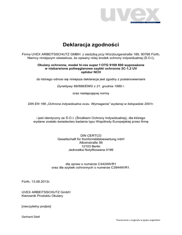 Deklaracja zgodności Firma UVEX ARBEITSSCHUTZ GMBH z siedzibą przy Würzburgerstraße 189, 90766 Fürth, Niemcy niniejszym oświadcza, że opisany niżej środek ochrony indywidualnej (Ś.O.I), Okulary ochronne, model hi-res super f OTG 9169 800 wyposażone w niebarwione poliwęglanowe szybki ochronne 2C-1,2 UV optidur NCH do którego odnosi się niniejsza deklaracja jest zgodny z postanowieniami Dyrektywy 89/686/EWG z 21. grudnia 1989 r. oraz następującej normy DIN EN 166 „Ochrona indywidualna oczu. Wymagania” wydanej w listopadzie 2001r. i jest identyczny ze Ś.O.I. (Środkiem Ochrony Indywidualnej), dla którego wydane zostało świadectwo badania typu Wspólnoty Europejskiej przez firmę DIN CERTCO Gesellschaft für Konformitätsbewertung mbH Alboinstraße 56 12103 Berlin Jednostka Notyfikowana 0196 dla opraw o numerze C4424W/R1 oraz dla szybek ochronnych o numerze C3944W/R1. Fürth, 13.08.2013r. UVEX ARBEITSSCHUTZ GmbH Kierownik Produktu Okulary [nieczytelny podpis] Gerhard Dietl Tłumaczenie z oryginału w języku angielskim Informacja dodatkowa od Hilti Poland Sp. z o.o. do tłumaczenia na język polski: Przywołana norma DIN EN 166 ma status Polskiej Normy PN-EN 166 „Ochrona indywidualna oczu. Wymagania”. Ww. środek ochrony indywidualnej jest zgodny z postanowieniami Rozporządzenia Ministra Gospodarki z dn. 21.12.2005 r. w sprawie zasadniczych wymagań dla środków ochrony indywidualnej, § 36, ust. 2, p. 3 (Dz. U. nr 259 poz. 2173). Tłumaczenie z oryginału w języku angielskim