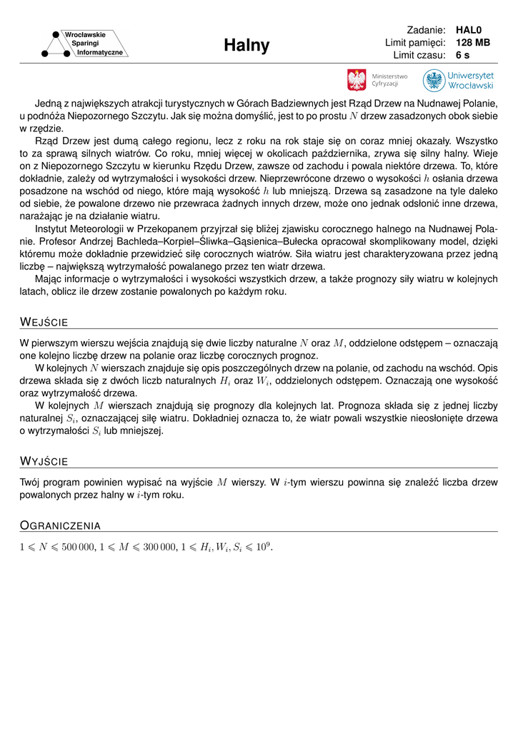 Halny Zadanie: Limit pamieci: ˛ Limit czasu: HAL0 128 MB 6s Jedna˛ z najwiekszych ˛ atrakcji turystycznych w Górach Badziewnych jest Rzad ˛ Drzew na Nudnawej Polanie, u podnóża Niepozornego Szczytu. Jak sie˛ można domyślić, jest to po prostu N drzew zasadzonych obok siebie w rz˛edzie. Rzad ˛ Drzew jest duma˛ całego regionu, lecz z roku na rok staje sie˛ on coraz mniej okazały. Wszystko to za sprawa˛ silnych wiatrów. Co roku, mniej wiecej ˛ w okolicach października, zrywa sie˛ silny halny. Wieje on z Niepozornego Szczytu w kierunku Rz˛edu Drzew, zawsze od zachodu i powala niektóre drzewa. To, które dokładnie, zależy od wytrzymałości i wysokości drzew. Nieprzewrócone drzewo o wysokości h osłania drzewa posadzone na wschód od niego, które maja˛ wysokość h lub mniejsza. ˛ Drzewa sa˛ zasadzone na tyle daleko od siebie, że powalone drzewo nie przewraca żadnych innych drzew, może ono jednak odsłonić inne drzewa, narażajac ˛ je na działanie wiatru. Instytut Meteorologii w Przekopanem przyjrzał sie˛ bliżej zjawisku corocznego halnego na Nudnawej Polanie. Profesor Andrzej Bachleda–Korpiel–Śliwka–Gasienica–Bułecka ˛ opracował skomplikowany model, dzieki ˛ któremu może dokładnie przewidzieć siłe˛ corocznych wiatrów. Siła wiatru jest charakteryzowana przez jedna˛ liczbe˛ – najwieksz ˛ a˛ wytrzymałość powalanego przez ten wiatr drzewa. Majac ˛ informacje o wytrzymałości i wysokości wszystkich drzew, a także prognozy siły wiatru w kolejnych latach, oblicz ile drzew zostanie powalonych po każdym roku. W EJ ŚCIE W pierwszym wierszu wejścia znajduja˛ sie˛ dwie liczby naturalne N oraz M , oddzielone odstepem ˛ – oznaczaja˛ one kolejno liczbe˛ drzew na polanie oraz liczbe˛ corocznych prognoz. W kolejnych N wierszach znajduje sie˛ opis poszczególnych drzew na polanie, od zachodu na wschód. Opis drzewa składa sie˛ z dwóch liczb naturalnych Hi oraz Wi , oddzielonych odstepem. ˛ Oznaczaja˛ one wysokość oraz wytrzymałość drzewa. W kolejnych M wierszach znajduja˛ sie˛ prognozy dla kolejnych lat. Prognoza składa sie˛ z jednej liczby naturalnej Si , oznaczajacej ˛ siłe˛ wiatru. Dokładniej oznacza to, że wiatr powali wszystkie nieosłoniete ˛ drzewa o wytrzymałości Si lub mniejszej. W YJ ŚCIE Twój program powinien wypisać na wyjście M wierszy. W i-tym wierszu powinna sie˛ znaleźć liczba drzew powalonych przez halny w i-tym roku. O GRANICZENIA 1 ¬ N ¬ 500 000, 1 ¬ M ¬ 300 000, 1 ¬ Hi , Wi , Si ¬ 109 . P RZYKŁAD Wejście Wyjście 5 5 4 30 4 20 3 10 6 10 3 20 9 10 20 30 30 0 1 0 4 0 Wiatr w pierwszym roku jest za słaby, by powalić jakiekolwiek drzewo. Wiatr w drugim roku powala tylko najwyższe, czwarte drzewo. Nie powala on trzeciego drzewa, które jest osłaniane przez pierwsze i drugie drzewo. Wiatr w roku czwartym jest w końcu wystarczajaco ˛ silny, aby powalić wszystkie pozostałe drzewa.