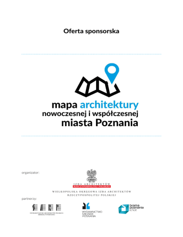 Oferta sponsorska organizator: partnerzy: Oferta sponsorska – Mapa architektury nowoczesnej i współczesnej miasta Poznania Szanowni Państwo, Wielkopolska Okręgowa Izba Architektów, w porozumieniu z Oddziałem Poznańskim Stowarzyszenia Architektów Polskich, serdecznie zaprasza do zapoznania się z ofertą sponsorską, z nadzieją na podjęcie owocnej i obustronnie korzystnej współpracy. Niniejsza oferta daje możliwość współtworzenia Mapy architektury nowoczesnej i współczesnej miasta Poznania, której celem jest prezentacja i promocja najbardziej wartościowych budynków i zespołów urbanistycznych zrealizowanych w granicach miasta po roku 1945. Inicjatywa jest odpowiedzią na istotny brak podobnego opracowania w ofercie poznańskich publikacji oraz stanowi realizację nadrzędnego celu statutowego Izby Architektów RP, którym jest ochrona przestrzeni i architektury jako dobra publicznego. Zapraszamy do współpracy! Krzysztof Frąckowiak architekt Przewodniczący Rady Wielkopolskiej Okręgowej Izby Architektów RP wielkopolska.iarp.pl Poznań 2016 str. 2 Oferta sponsorska – Mapa architektury nowoczesnej i współczesnej miasta Poznania Cel i przedmiot opracowania Przedmiotem zadania jest publikacja w formie drukowanej oraz wdrożenie w wersji elektronicznej „Mapy architektury nowoczesnej i współczesnej miasta Poznania”. Opracowanie prezentować ma najważniejsze przykłady obiektów architektonicznych i zespołów urbanistycznych zrealizowanych w Poznaniu po roku 1945 w przystępnej formie kieszonkowej mapy, jak również aplikacji na urządzenia mobilne. Podstawowym celem przedsięwzięcia jest kształtowanie świadomości przestrzeni jako kluczowego elementu dziedzictwa kulturowego oraz dobra publicznego poprzez promocję najbardziej wartościowych współczesnych poznańskich obiektów architektonicznych i zespołów urbanistycznych. Równolegle popularyzowana będzie wiedza na temat twórców dzieł architektury współczesnej związanych z Poznaniem. Pomimo licznych przykładów udokumentowania i prezentacji obiektów zabytkowych, w chwili obecnej brakuje na rynku zbiorczego opracowania ujmującego najnowszy dorobek architektoniczny miasta - zwłaszcza w przystępnej formie kieszonkowej mapy lub darmowej aplikacji na urządzenia mobilne. Potrzeba promocji najlepszych przykładów poznańskich realizacji oraz wskazywania pozytywnych wzorców rozwoju przestrzennego leżą u podstaw niniejszego projektu. Wersja drukowana obejmować będzie listę ok. 150 obiektów i zespołów, z których każdy zostanie zlokalizowany na mapie Poznania i opatrzony informacją dotyczącą: adresu, daty realizacji, przeznaczenia pierwotnego i obecnego oraz nazwisk autorów. Dodatkowo ok. 30 wybranych obiektów uzyska szczegółowy opis wraz z fotografią lub grafiką. Treść uzupełniać będą indeksy wyszukiwania wg: nazw ulic, funkcji i nazwisk twórców. Wersja cyfrowa mapy będzie miała formę interaktywnej aplikacji na urządzenia mobilne – tj. telefony i tablety, obsługujące najbardziej popularne systemy operacyjne (iOS, Android). Początkowo zakres informacji zawartych w aplikacji będzie pokrywał się z wersją drukowaną, jednak przewidywane zastosowanie intuicyjnego systemu zarządzania treścią (CMS) umożliwi uzupełnianie programu o kolejne obiekty, wprowadzanie dodatkowych opisów i grafik, a wręcz dodawanie kompletnych list obiektów z innych epok historycznych. Kluczowa dla wersji cyfrowej będzie interaktywność umożliwiająca filtrowanie listy obiektów wg wybranego klucza (np. daty, funkcji, miejsca, autora), jak również automatyczne wskazywanie obiektów zlokalizowanych w zadanej bliskości użytkownika na podstawie danych z GPS. Wybór i opis obiektów zostanie powierzony badaczom o bogatym dorobku naukowym oraz dużej wiedzy z zakresu historii urbanistyki i architektury Poznania. Dla zwiększenia grupy docelowej użytkowników, opracowanie zostanie wydane w formie dwujęzycznej: polskiej i angielskiej. Forma publikacji, jako kieszonkowej mapy i aplikacji na urządzenia mobilne, zachęcać ma do aktywnego uczestnictwa w kulturze szerokie kręgi społeczne poprzez zwiedzanie miasta, bezpośrednie doświadczenie przedmiotu i naoczną weryfikacje zdobytej wiedzy. Mapę, zarówno w formie drukowanej jak i aplikacji na urządzenia mobilne, będzie można pozyskać bezpłatnie. Pierwszy nakład wersji drukowanej planowany jest w ilości 8000 egzemplarzy. wielkopolska.iarp.pl Poznań 2016 str. 3 Oferta sponsorska – Mapa architektury nowoczesnej i współczesnej miasta Poznania Odbiorcy opracowania oraz punkty dystrybucji Sieć dystrybucji wersji drukowanej „Mapy…” obejmować będzie istotne z punktu widzenia ruchu turystycznego i kulturalnego lokalizacje w mieście: Siedziba główna Centrum Informacji Miejskiej Centrum Informacji Turystycznej (filia CIM) Port Lotniczy Poznań – Ławica (filia CIM) Dworzec Główny (filia CIM) Międzynarodowe Targi Poznańskie (filia CIM) Interaktywne Centrum Historii Ostrowa Tumskiego (Brama Poznania) Galeria Malarstwa i Rzeźby Muzeum Narodowego Muzeum Archeologiczne Biblioteka Raczyńskich Centrum Kultury Zamek Siedziba Oddziału Poznańskiego SARP oraz Wielkopolskiej Okręgowej Izby Architektów Wydział Architektury Politechniki Poznańskiej Wydział Architektury i Wzornictwa Uniwersytetu Artystycznego Centrum wykładowe Politechniki Poznańskiej Siedziby lub inne punkty wskazane przez sponsorów Lista punktów dystrybucyjnych może ulec zwiększeniu. Mapę będzie można pozyskać bezpłatnie w punktach dystrybucyjnych. Informacja o możliwości pobrania i instalacji aplikacji na urządzenia mobilne dostępna będzie na stronie internetowej Wielkopolskiej Izby Architektów RP oraz SARP o/Poznań, stronach internetowych partnerów, w punktach dystrybucji wersji drukowanej mapy oraz w treści wersji drukowanej mapy. Program zostanie dodany do baz danych aplikacji głównych dostawców urządzeń mobiln