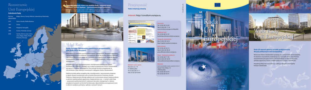 Budynek, w którym mieści się siedziba Rady, nazwany został imieniem Justusa Lipsiusa – szesnastowiecznego humanisty. Pochodzący z Overijse Justus Lipsius (1547–1606) był znanym uczonym, historykiem i humanistą schyłku epoki renesansu, który podróżował i nauczał w całej Europie. Członkowie Rady Rada instytucją otwartą Internet http://consilium.europa.eu Państwa Belgia, Niemcy, Francja, Włochy, Luksemburg, Niderlandy założycielskie 1973 Przejrzystość QC-74-06-289-PL-D Rozszerzenie Unii Europejskiej RADA UNII EUROPEJSKIEJ Dania, Irlandia, Wielka Brytania 1981 Grecja 1986 Hiszpania, Portugalia 1995 Austria, Finlandia, Szwecja 2004 Czechy, Estonia, Cypr, Łotwa, Litwa, Węgry, Malta, Polska, Słowenia, Słowacja PL SEKRETARIAT GENERALNY Dyrekcja Generalna F Prasa Komunikacja Protokół Informacja Tel. 32 (0)2 281 56 50 Faks 32 (0)2 281 71 36 www.consilium.europa.eu/infopublic Publikacje Rady Tel. 32 (0)2 281 61 07 [email protected] Skład Rady Biuro prasowe Tel. 32 (0)2 281 63 19 Faks 32 (0)2 281 80 26 [email protected] Każde Państwo Członkowskie uczestniczy w przygotowaniu prac Rady i w jej decyzjach. Rada składa się z ministrów poszczególnych Państw Członkowskich. Obraduje w dziewięciu różnych konfiguracjach w zależności od przedmiotu obrad. Na przykład, Rada ds. Ogólnych i Stosunków Zewnętrznych składa się z ministrów spraw zagranicznych, a Rada ds. Wymiaru Sprawiedliwości i Spraw Wewnętrznych – z ministrów sprawiedliwości i ministrów spraw wewnętrznych. Wszystkie prace Rady są przygotowywane i koordynowane przez Komitet Stałych Przedstawicieli (COREPER), składający się ze stałych przedstawicieli Państw Członkowskich pracujących w Brukseli i ich zastępców. Pracę samego Komitetu przygotowuje ok. 250 komitetów i grup roboczych utworzonych z delegatów Państw Członkowskich. Niektóre komitety pełnią szczególną rolę w koordynowaniu i opracowywaniu ekspertyz w danym obszarze tematycznym, jak np. Komitet Ekonomiczno-Finansowy, Komitet Polityczny i Bezpieczeństwa (którego zadaniem jest monitorowanie sytuacji międzynarodowej w zakresie wspólnej polityki zagranicznej i bezpieczeństwa oraz – w ramach zadań Rady – sprawowanie politycznej kontroli i wytyczanie kierunków strategicznych w zakresie zarządzania kryzysami) czy Komitet Koordynacyjny odpowiedzialny za przygotowanie prac w zakresie współpracy policyjnej i sądowej w sprawach karnych. Wizyty - Wydarzenia publiczne Tel. 32 (0)2 281 71 92 Faks 32 (0)2 281 66 09 [email protected] Bâtiment Justus Lipsius Rue de la Loi, 175 B-1048 Bruxelles Tel. 32 (0)2 281 61 11 Faks 32 (0)2 281 69 99 Zdjęcia: obsługa fotograficzna Sekretariatu Generalnego Rady Dostęp do dokumentów Faks 32 (0)2 281 63 61 http://register.consilium.europa.eu Rada Unii Europejskiej Wola Rady Unii Europejskiej Rada UE stanowi główny ośrodek podejmowania decyzji politycznych Unii Europejskiej. Ministrowie Państw Członkowskich spotykają się w ramach Rady Unii Europejskiej. W zależności od przedmiotu znajdującego się w porządku obrad, dane Państwo reprezentowane jest przez ministra odpowiedzialnego za właściwą dziedzinę (polityka zagraniczna, finanse, polityka społeczna, transport, rolnictwo itd.). Prezydencja Rady trwa sześć miesięcy i pełnią ją rotacyjnie poszczególne Państwa Członkowskie. Biblioteka Czynna od poniedziałku do piątku, w godzinach od 9 do 17. Square Frère-Orban, 10 1040 Bruxelles Tel. 32 (0)2 281 65 75 Tel. 32 (0)2 281 65 41 2006 Rada pełni rolę decyzyjną i koordynacyjną. • Rada Unii Europejskiej uchwala akty prawne, na ogół w drodze procedury współdecyzji z Parlamentem Europejskim. • Rada koordynuje ogólną politykę gospodarczą Państw Członkowskich. • Rada UE określa i wdraża wspólną politykę zagraniczną i bezpieczeństwa Unii na podstawie ogólnych wytycznych Rady Europejskiej. • Rada zawiera w imieniu Wspólnoty i Unii umowy międzynarodowe pomiędzy Wspólnotą a innymi krajami lub organizacjami międzynarodowymi. • Rada koordynuje działania Państw Członkowskich i przyjmuje środki w zakresie współpracy policyjnej i sądowej w sprawach karnych. • Rada i Parlament Europejski są uprawnione do uchwalania budżetu Wspólnoty. Sekretariat Generalny Rady Akty prawne Rady Sekretariat pod kierownictwem Sekretarza Generalnego przygotowuje prace Rady i zapewnia sprawność funkcjonowania i ciągłość jej prac. Akty prawne Rady mogą mieć formę rozporządzeń, dyrektyw, decyzji, wspólnych działań lub stanowisk, zaleceń lub opinii. Rada może także przyjmować konkluzje, deklaracje i rezolucje. Podczas gdy Rada pełni funkcję prawodawczą, wnioski co do aktów prawnych zgłaszane są w zasadzie przez Komisję Europejską. Są one następnie rozpatrywane przez Radę, która może je zmienić przed uchwaleniem. Javier Solana Madariaga – pierwszy Sekretarz Generalny Rady / Wysoki Przedstawiciel ds. Wspólnej Polityki Zagranicznej i Bezpieczeństwa UE. Parlament Europejski jest aktywnym uczestnikiem procesu legislacyjnego. W bardzo wielu sprawach prawodawstwo wspólnotowe uchwalane jest wspólnie przez Parlament i Radę w drodze tzw. procedury współdecyzji. Zwykła większość głosów, większość kwalifikowana i jednomyślność Rada Europejska Liczbę głosów przysługujących poszczególnym Państwom Członkowskim określają Traktaty. Traktaty określają również, w jakich przypadkach wymagana jest zwykła większość głosów, większość kwalifikowana lub jednomyślność. Od 1 listopada 2004 roku kwalifikowana większość głosów wymaga spełnienia następujących dwóch warunków: • większość Państw Członkowskich głosuje «za» (w niektórych przypadkach większość dwóch trzecich głosów); • minimum 232 głosów «za», tzn. 72,3% wszystkich głosów (mniej więcej taki sam procent jak w poprzednim systemie). Ponadto Państwo Członkowskie może zażądać potwierdzenia, że gł