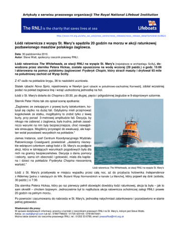 Łód ratownicza z wyspy St. Mary's spdziła 20 godzin na morzu w akcji ratunkowej pozbawionego masztów polskiego aglowca. Data: 30 padziernika 2010. Autor: Steve Watt, społeczny rzecznik prasowy RNLI. Łód ratownicza The Whiteheads, ze stacji RNLI na wyspie St. Mary's [najwiksza w archipelagu Scilly], dowodzona przez sternika Petera Hicksa, została opuszczona na wod wczoraj (29 padz.) o godz. 15:06 i skierowana na pomoc polskiemu aglowcowi Fryderyk Chopin, który stracił maszty i dryfował 93 mile na południowy zachód od Wysp Scilly. Z 47 osób na pokładzie brygu, 36 to nastoletni uczniowie. Statek rybacki Nova Spiro, rejestrowany w Newlyn [port rybacki w południowo-zachodniej Kornwalii], zdołał wczeniej poda na pokład aglowca lin i wzi uszkodzon jednostk na hol. Łód z St. Mary's dotarła do Chopina o 20:30, po długiej, picio i półgodzinnej egludze w 9-stopniowym sztormie. Sternik Peter Hicks tak oto opisał scen spotkania: „aglowiec ze zwisajcym z prawej burty takielunkiem, kołysał si ciko na duej fali. Gdybymy mieli przejmowa kogokolwiek ze statku, moglibymy to zrobi tylko z lewej burty, przy ponad 3-metrowej amplitudzie fali. Decyzja, by nikogo nie zabiera z aglowca, była trudna, jednak zasadniczo warunki na nim były bezpieczniejsze, cho niewtpliwie stresujce. Moglimy przystpi do ewakuacji, ale kapitan wolał pozostawi wszystkich na pokładzie." James Instance, szef Centrum Koordynacyjnego Wydziału Ratowniczego Coastguard, powiedział: „Jestemy niezwykle wdziczni członkom załogi łodzi z St. Mary's za podjcie akcji, która w istniejcych warunkach pogodowych była dla nich na granicy bezpieczestwa. Decyzja o daniu pomocy i eskorty, sama ich obecno i gotowo, miała dla kapitana i dzieci na pokładzie Fryderyka Chopina nieocenion warto." Łód ratownicza The Whiteheads, ze stacji RNLI na wyspie St. Mary's Łód z St. Mary's przebywała w miejscu wypadku przez cał noc, a do przybycia holownika Independence z Alderney [jedna z nalecych do Wlk. Brytanii Wysp Normandzkich w kanale La Manche], który pojawił si dzi (sobota, 30 padz.) o 7:30. Dla sternika Petera Hicksa, który po raz pierwszy pełnił obowizki dowódcy łodzi ratunkowej, akcja ta była – jak to sam okrelił – chrztem bojowym. Jednoczenie był to najdłusza akcja ratownicza ochotniczej załogi RNLI: prawie 20 godzin na pełnym morzu. Po powrocie i zacumowaniu do nabrzea w St. Mary's, jednostk natychmiast zatankowano i pozostawiono w stanie pełnej gotowoci. Wiadomoci dla prasy: W sprawie dodatkowych informacji, prosimy o kontakt z rzecznikiem prasowym RNLI na St. Mary's, którym jest Steve Watts. Adres: [email protected] lub tel.: 07867796022 / 01720 423103 / 07818515401. Mona take dzwoni do rzecznika prasowego RNLI, tel.: 01202 33 6789, email: [email protected] Łodzie ratownicze RNLI eskortuj pozbawiony masztów polski aglowiec. Data: 30 padziernika 2010. Autor: Becky King, rzecznik prasowy RNLI. Łód ratownicza z Sennen Cove [osada w Kornwalii, ok. 1,5 km N od Land's End] z załog złoon z ochotników wypłynła dzi (sobota, 30 padz.) o godz. 15:00, by eskortowa pozbawiony masztów polski aglowiec Fryderyk Chopin, holowany przez statek rybacki Nova Spiro w kierunku Falmouth. Jest to kontynuacja akcji podjtej wczeniej przez łod ratownicz z orodka RNLI na wyspie St. Mary's. Kapitan aglowca wezwał na pomoc Stra Brzegow wczoraj (pitek, 29 padz.) rano, gdy Fryderyk Chopin stracił maszty w silnej wichurze i dryfował 93 mile na południowy zachód od Wysp Scilly. Łód ratownicza z Sennen Cove bdzie towarzyszyła obu jednostkom przez cał noc, póki nie min przyldka Lizzard, co nastpi prawdopodobnie jutro rano. Wtedy asyst przejm łodzie ratownicze RNLI z Falmouth, które towarzyszy bd aglowcowi a do bezpiecznego zacumowania. W tej chwili pogoda jest niekorzystna, a wiatr ma sił 8 stopni. Łodzie ratownicze RNLI, obsadzane przez ochotnicze załogi, bd asekurowa aglowiec i jego 47-osobow załog, w której znajduje si 36 nastoletnich eglarzy. Akcj podjt przez łód z Sennen Cove ubezpiecza trwajca w pogotowiu załoga łodzi ze stacji RNLI w Penlee, która w razie potrzeby wyruszy natychmiast, zwłaszcza w godzinach nocnych. Łód z St.Mary's spdziła ostatniej nocy 20 godzin na morzu, uczestniczc w akcji ratunkowej. Kontakt: W sprawie dodatkowych informacji, prosimy o kontakt z rzecznikiem prasowym RNLI w Sennen Cove, którym jest Brian Simpson, tel. 07762 057127 lub z rzecznikiem prasowym RNLI, tel. 01202 33 6789. RNLI (Royal National Lifeboat Institution) jest organizacj charytatywn chronic ycie na morzu. Ochotnicy z jej szeregów przez cał dob pełni słub poszukiwawcz i ratunkow wokół wybrzey Zjednoczonego Królestwa i Irlandii. RNLI ma do dyspozycji ponad 230 stacji ratunkowych, w których znajduje si ponad 150 jednostek ratowniczych. RNLI działa niezalenie od Stray Brzegowej (Coastguard) i organizacji rzdowych, a jej działalno jest moliwa wyłcznie dziki dotacjom i darowiznom społeczestwa. Od chwili załoenia w roku 1824, załogi i słuby RNLI ocaliły ycie ponad 139 000 osób.