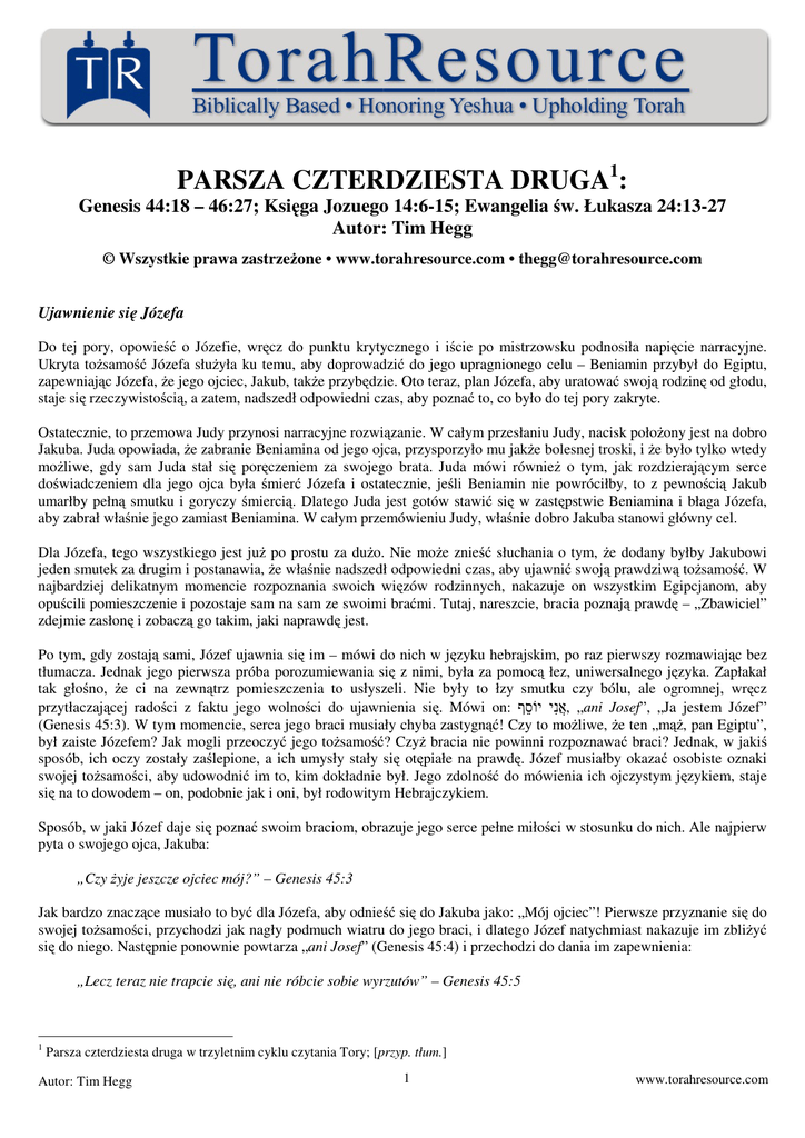 PARSZA CZTERDZIESTA DRUGA1: Genesis 44:18 – 46:27; Księga Jozuego 14:6-15; Ewangelia św. Łukasza 24:13-27 Autor: Tim Hegg © Wszystkie prawa zastrzeżone • www.torahresource.com • [email protected] Ujawnienie się Józefa Do tej pory, opowieść o Józefie, wręcz do punktu krytycznego i iście po mistrzowsku podnosiła napięcie narracyjne. Ukryta tożsamość Józefa służyła ku temu, aby doprowadzić do jego upragnionego celu – Beniamin przybył do Egiptu, zapewniając Józefa, że jego ojciec, Jakub, także przybędzie. Oto teraz, plan Józefa, aby uratować swoją rodzinę od głodu, staje się rzeczywistością, a zatem, nadszedł odpowiedni czas, aby poznać to, co było do tej pory zakryte. Ostatecznie, to przemowa Judy przynosi narracyjne rozwiązanie. W całym przesłaniu Judy, nacisk położony jest na dobro Jakuba. Juda opowiada, że zabranie Beniamina od jego ojca, przysporzyło mu jakże bolesnej troski, i że było tylko wtedy możliwe, gdy sam Juda stał się poręczeniem za swojego brata. Juda mówi również o tym, jak rozdzierającym serce doświadczeniem dla jego ojca była śmierć Józefa i ostatecznie, jeśli Beniamin nie powróciłby, to z pewnością Jakub umarłby pełną smutku i goryczy śmiercią. Dlatego Juda jest gotów stawić się w zastępstwie Beniamina i błaga Józefa, aby zabrał właśnie jego zamiast Beniamina. W całym przemówieniu Judy, właśnie dobro Jakuba stanowi główny cel. Dla Józefa, tego wszystkiego jest już po prostu za dużo. Nie może znieść słuchania o tym, że dodany byłby Jakubowi jeden smutek za drugim i postanawia, że właśnie nadszedł odpowiedni czas, aby ujawnić swoją prawdziwą tożsamość. W najbardziej delikatnym momencie rozpoznania swoich więzów rodzinnych, nakazuje on wszystkim Egipcjanom, aby opuścili pomieszczenie i pozostaje sam na sam ze swoimi braćmi. Tutaj, nareszcie, bracia poznają prawdę – „Zbawiciel” zdejmie zasłonę i zobaczą go takim, jaki naprawdę jest. Po tym, gdy zostają sami, Józef ujawnia się im – mówi do nich w języku hebrajskim, po raz pierwszy rozmawiając bez tłumacza. Jednak jego pierwsza próba porozumiewania się z nimi, była za pomocą łez, uniwersalnego języka. Zapłakał tak głośno, że ci na zewnątrz pomieszczenia to usłyszeli. Nie były to łzy smutku czy bólu, ale ogromnej, wręcz przytłaczającej radości z faktu jego wolności do ujawnienia się. Mówi on: ֲאנִי יוֹסֵף, „ani Josef”, „Ja jestem Józef” (Genesis 45:3). W tym momencie, serca jego braci musiały chyba zastygnąć! Czy to możliwe, że ten „mąż, pan Egiptu”, był zaiste Józefem? Jak mogli przeoczyć jego tożsamość? Czyż bracia nie powinni rozpoznawać braci? Jednak, w jakiś sposób, ich oczy zostały zaślepione, a ich umysły stały się otępiałe na prawdę. Józef musiałby okazać osobiste oznaki swojej tożsamości, aby udowodnić im to, kim dokładnie był. Jego zdolność do mówienia ich ojczystym językiem, staje się na to dowodem – on, podobnie jak i oni, był rodowitym Hebrajczykiem. Sposób, w jaki Józef daje się poznać swoim braciom, obrazuje jego serce pełne miłości w stosunku do nich. Ale najpierw pyta o swojego ojca, Jakuba: „Czy żyje jeszcze ojciec mój?” – Genesis 45:3 Jak bardzo znaczące musiało to być dla Józefa, aby odnieść się do Jakuba jako: „Mój ojciec”! Pierwsze przyznanie się do swojej tożsamości, przychodzi jak nagły podmuch wiatru do jego braci, i dlatego Józef natychmiast nakazuje im zbliżyć się do niego. Następnie ponownie powtarza „ani Josef” (Genesis 45:4) i przechodzi do dania im zapewnienia: „Lecz teraz nie trapcie się, ani nie róbcie sobie wyrzutów” – Genesis 45:5 1 Parsza czterdziesta druga w trzyletnim cyklu czytania Tory; [przyp. tłum.] Autor: Tim Hegg 1 www.torahresource.com Józef prawdziwie troszczy się o nich, a nie o samo wymierzenie im sprawiedliwości za ich przestępstwo popełnione przeciwko niemu. Jego prawdziwa miłość do swoich braci, zakryła ich winę. Po raz kolejny, nie wydaje się to zbyt daleko idące, aby użyć historii Józefa jako ilustracji dla znacznie szerszej rzeczywistości – bracia Mesjasza Jeszuy, nie zdają sobie sprawy z Jego tożsamości, ale pewnego dnia zobaczą Go takim, jaki naprawdę jest – umiłowanym Swojego Ojca. Jednak to nie nadejdzie, zanim Jeszua Sam nie objawi im Swojej tożsamości. Jakże wrażliwe jest serce Mesjasza wobec Jego wybrańców – jakże w pełni współczujący będzie Święty, kiedy zgromadzi do Siebie Swoje zagubione owce! I, jeśli z naszej ograniczonej perspektywy, wolno nam rozmyślać nad zamysłem Jeszuy, to możemy zastanowić się nad tym, jakże musi On pragnąć, aby dać poznać Swoją prawdziwą tożsamość. Koniecznym jest, aby na razie pozostał zakryty dla Swoich braci, aby doprowadzić do Swojego pożądanego planu, ale pewnego dnia Jego ogromna miłość do Izraela będzie okazana w Jego słowach: ָשׁי ַח ִ ֲאנִי מ, „ani Maszijah”, „Ja jestem Mesjaszem”. Dowód, który im pokaże, będzie daleko bardziej znaczący niż Jego żydowska tożsamość – pokaże im rany miłości, które nosi przez całą wieczność. Z otwartymi oczami oraz usuniętą zasłoną, Jego bracia zapłaczą, ale On otrze łzy z ich oczu i pocieszy ich Swoimi przebaczającymi, pełnymi miłości słowami. „I w ten sposób będzie zbawiony cały Izrael” – List św. Pawła do Rzymian 11:26 Nie można powstrzymać się przed podkreśleniem tego, jak całkowicie odmienne jest serce Jeszuy wobec Swoich braci, w porównaniu z haniebną zbrodnią antysemityzmu. Często ci, którzy okazują pogardę dla narodu żydowskiego, czynią to pod szyldem „miłości do Jezusa”. Jednakże, jak bardzo się mylą! Gdyby tylko mogli uświadomić sobie, że Mesjasz – w tej chwili zakryty dla Swoich braci – z tak wielkim oczekiwaniem tęskni za dniem, w którym się objawi i pocie