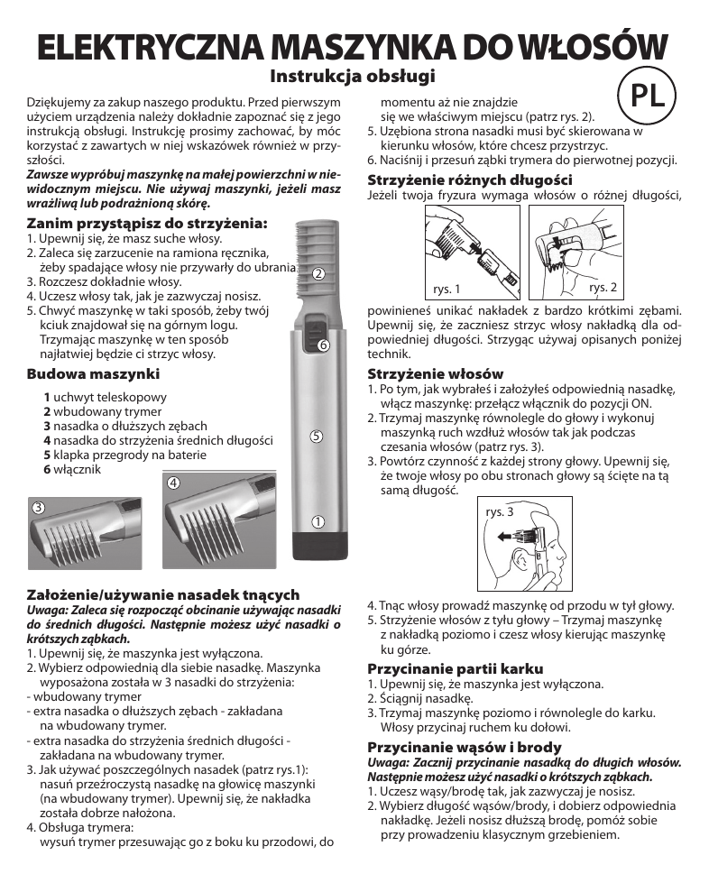 ELEKTRYCZNA MASZYNKA DO WŁOSÓW Instrukcja obsługi Dziękujemy za zakup naszego produktu. Przed pierwszym użyciem urządzenia należy dokładnie zapoznać się z jego instrukcją obsługi. Instrukcję prosimy zachować, by móc korzystać z zawartych w niej wskazówek również w przyszłości. Zawsze wypróbuj maszynkę na małej powierzchni w niewidocznym miejscu. Nie używaj maszynki, jeżeli masz wrażliwą lub podrażnioną skórę. PL momentu aż nie znajdzie się we właściwym miejscu (patrz rys. 2). 5. Uzębiona strona nasadki musi być skierowana w kierunku włosów, które chcesz przystrzyc. 6. Naciśnij i przesuń ząbki trymera do pierwotnej pozycji. Strzyżenie różnych długości Jeżeli twoja fryzura wymaga włosów o różnej długości, Zanim przystąpisz do strzyżenia: 1. Upewnij się, że masz suche włosy. 2. Zaleca się zarzucenie na ramiona ręcznika, żeby spadające włosy nie przywarły do ubrania. 3. Rozczesz dokładnie włosy. 4. Uczesz włosy tak, jak je zazwyczaj nosisz. 5. Chwyć maszynkę w taki sposób, żeby twój kciuk znajdował się na górnym logu. Trzymając maszynkę w ten sposób najłatwiej będzie ci strzyc włosy. 2 6 Strzyżenie włosów Budowa maszynki 1 uchwyt teleskopowy 2 wbudowany trymer 3 nasadka o dłuższych zębach 4 nasadka do strzyżenia średnich długości 5 klapka przegrody na baterie 6 włącznik 4 3 Założenie/używanie nasadek tnących rys. 2 rys. 1 powinieneś unikać nakładek z bardzo krótkimi zębami. Upewnij się, że zaczniesz strzyc włosy nakładką dla odpowiedniej długości. Strzygąc używaj opisanych poniżej technik. 5 1 Uwaga: Zaleca się rozpocząć obcinanie używając nasadki do średnich długości. Następnie możesz użyć nasadki o krótszych ząbkach. 1. Upewnij się, że maszynka jest wyłączona. 2. Wybierz odpowiednią dla siebie nasadkę. Maszynka wyposażona została w 3 nasadki do strzyżenia: - wbudowany trymer - extra nasadka o dłuższych zębach - zakładana na wbudowany trymer. - extra nasadka do strzyżenia średnich długości zakładana na wbudowany trymer. 3. Jak używać poszczególnych nasadek (patrz rys.1): nasuń przeźroczystą nasadkę na głowicę maszynki (na wbudowany trymer). Upewnij się, że nakładka została dobrze nałożona. 4. Obsługa trymera: wysuń trymer przesuwając go z boku ku przodowi, do 1. Po tym, jak wybrałeś i założyłeś odpowiednią nasadkę, włącz maszynkę: przełącz włącznik do pozycji ON. 2. Trzymaj maszynkę równolegle do głowy i wykonuj maszynką ruch wzdłuż włosów tak jak podczas czesania włosów (patrz rys. 3). 3. Powtórz czynność z każdej strony głowy. Upewnij się, że twoje włosy po obu stronach głowy są ścięte na tą samą długość. rys. 3 4. Tnąc włosy prowadź maszynkę od przodu w tył głowy. 5. Strzyżenie włosów z tyłu głowy – Trzymaj maszynkę z nakładką poziomo i czesz włosy kierując maszynkę ku górze. Przycinanie partii karku 1. Upewnij się, że maszynka jest wyłączona. 2. Ściągnij nasadkę. 3. Trzymaj maszynkę poziomo i równolegle do karku. Włosy przycinaj ruchem ku dołowi. Przycinanie wąsów i brody Uwaga: Zacznij przycinanie nasadką do długich włosów. Następnie możesz użyć nasadki o krótszych ząbkach. 1. Uczesz wąsy/brodę tak, jak zazwyczaj je nosisz. 2. Wybierz długość wąsów/brody, i dobierz odpowiednia nakładkę. Jeżeli nosisz dłuższą brodę, pomóż sobie przy prowadzeniu klasycznym grzebieniem. 3. Zacznij strzyżenie pod brodą i przesuwaj maszynkę w kierunku uszu i linii brody. Żeby osiągnąć różną długość brody kieruj maszynkę w różnych kierunkach. 4. Lekko przeczesz brzegi wąsa do dołu. Przycinanie włosków 1. Przyłóż maszynkę pod kątem 45° w kierunku skóry i strzyż prowadząc maszynkę pod włos (patrz rys. 4). 2. Kontynuuj strzyżenie prowadząc maszynkę pod włos. Nie naciskaj zbyt mocno na ostrze, ponieważ możesz je uszkodzić oraz się zranić. 3. Jeżeli chcesz osiągnąć jak najlepszy efekt, podczas używania maszynki napnij drugą ręką skórę (patrz rys. 5). rys. 4 Nigdy nie ładuj zwykłych lub alkalicznych baterii! Baterie mogą się wylać lub eksplodować. Ładuj wyłącznie baterie Ni-Cd. Baterii nie narażaj na działanie wysokich temperatur, promieni słonecznych lub innych źródeł ciepła! Nie wrzucaj baterii do ognia! Baterie trzymaj w miejscu niedostępnym dla dzieci. Jeśli przez dłuższy okres czasu nie używasz urządzenia wyjmij z niego baterie. Baterie alkaliczne Jeżeli z baterii wycieknie elektrolit – chroń oczy przed kontaktem z elektrolitem! W przypadku jakiegokolwiek kontaktu elektrolitu baterii z oczami należy niezwłocznie kierować się niniejszymi instrukcjami: * Przy dostaniu się do oczu niezwłocznie dokładnie przepłukać wodą i skontaktuj się z lekarzem! rys. 5 Użycie uchwytu przedłużającego Maszynka posiada możliwość przedłużenia uchwytu, dzięki czemu dostaniesz się do trudniej dostępnych miejsc. Zanim zaczniesz przedłużać uchwyt najpierw wyłącz maszynkę. Jedna ręką chwyć uchwyt a drugą głowicę maszynki. Ostrożnie pociągnij uchwyt ku górze. Przed włączeniem maszynki upewnij się, że głowica jest dobrze osadzona w nowej pozycji (1 – usłyszysz charakterystyczny dźwięk, 2 – pojemnik na wewnętrzne części maszynki będzie skierowany ku końcowi uchwytu, patrz rys. 6). rys. 6 Instalacja i wymiana baterii 1. Upewnij się, że włącznik znajduje się w pozycji wyłączone i ściągnij uchwyt. 2. Włóż 2 baterie 1,5V typu AAA. Wkładając baterie stosuj się do oznaczeń (+ -) wewnątrz komory (patrz rys. 7). 3. Załóż z powrotem uchwyt. rys. 8 rys. 9 OSTRZEŻENIE: ŁADUJ WYŁĄCZNIE BATERIE Ni-Cd LUB NiMH.NIGDY NIE ŁADUJ BATERII INNEGO TYPU NIŻ WYMIENIOWE POWYŻEJ! ISTNIEJE NIEBEZPIECZEŃSWTO WYBUCHU LUB POWAŻNEGO ZRANIENIA OSÓB! Czyszczenie i konserwacja 1. Wyłącz maszynkę i wyciągnij baterie. 2. Chwyć maszynkę tak, aby tyl