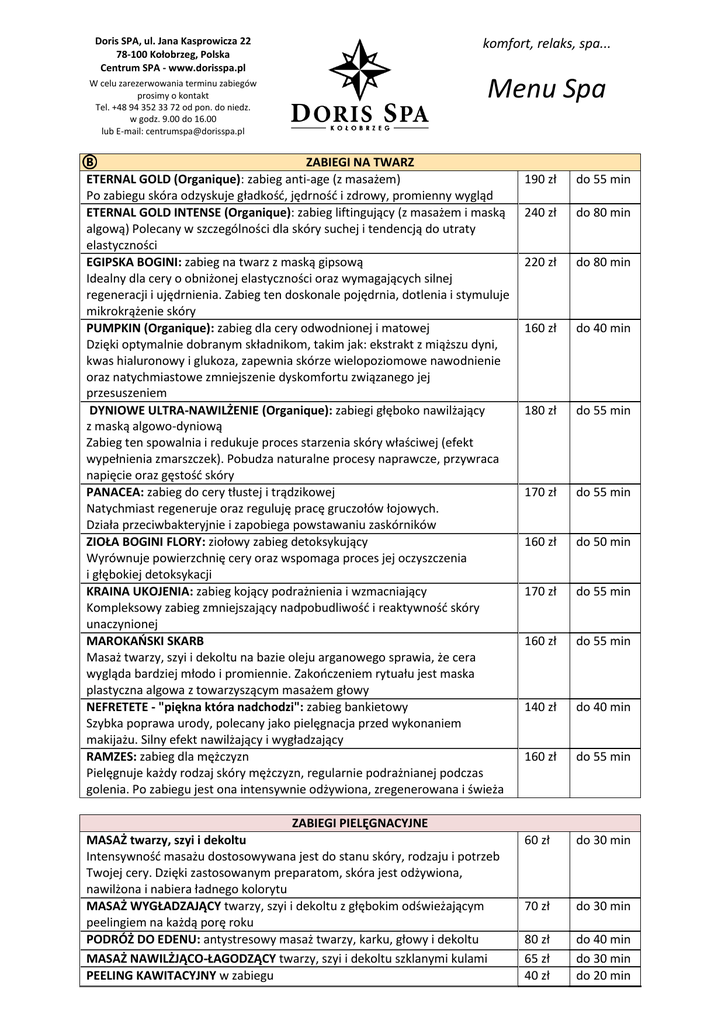 Doris SPA, ul. Jana Kasprowicza 22 78-100 Kołobrzeg, Polska Centrum SPA - www.dorisspa.pl komfort, relaks, spa... W celu zarezerwowania terminu zabiegów prosimy o kontakt Tel. +48 94 352 33 72 od pon. do niedz. w godz. 9.00 do 16.00 lub E-mail: [email protected] Menu Spa ZABIEGI NA TWARZ ETERNAL GOLD (Organique): zabieg anti-age (z masażem) Po zabiegu skóra odzyskuje gładkość, jędrność i zdrowy, promienny wygląd ETERNAL GOLD INTENSE (Organique): zabieg liftingujący (z masażem i maską algową) Polecany w szczególności dla skóry suchej i tendencją do utraty elastyczności EGIPSKA BOGINI: zabieg na twarz z maską gipsową Idealny dla cery o obniżonej elastyczności oraz wymagających silnej regeneracji i ujędrnienia. Zabieg ten doskonale pojędrnia, dotlenia i stymuluje mikrokrążenie skóry PUMPKIN (Organique): zabieg dla cery odwodnionej i matowej Dzięki optymalnie dobranym składnikom, takim jak: ekstrakt z miąższu dyni, kwas hialuronowy i glukoza, zapewnia skórze wielopoziomowe nawodnienie oraz natychmiastowe zmniejszenie dyskomfortu związanego jej przesuszeniem DYNIOWE ULTRA-NAWILŻENIE (Organique): zabiegi głęboko nawilżający z maską algowo-dyniową Zabieg ten spowalnia i redukuje proces starzenia skóry właściwej (efekt wypełnienia zmarszczek). Pobudza naturalne procesy naprawcze, przywraca napięcie oraz gęstość skóry PANACEA: zabieg do cery tłustej i trądzikowej Natychmiast regeneruje oraz reguluję pracę gruczołów łojowych. Działa przeciwbakteryjnie i zapobiega powstawaniu zaskórników ZIOŁA BOGINI FLORY: ziołowy zabieg detoksykujący Wyrównuje powierzchnię cery oraz wspomaga proces jej oczyszczenia i głębokiej detoksykacji KRAINA UKOJENIA: zabieg kojący podrażnienia i wzmacniający Kompleksowy zabieg zmniejszający nadpobudliwość i reaktywność skóry unaczynionej MAROKAŃSKI SKARB Masaż twarzy, szyi i dekoltu na bazie oleju arganowego sprawia, że cera wygląda bardziej młodo i promiennie. Zakończeniem rytuału jest maska plastyczna algowa z towarzyszącym masażem głowy NEFRETETE - "piękna która nadchodzi": zabieg bankietowy Szybka poprawa urody, polecany jako pielęgnacja przed wykonaniem makijażu. Silny efekt nawilżający i wygładzający RAMZES: zabieg dla mężczyzn Pielęgnuje każdy rodzaj skóry mężczyzn, regularnie podrażnianej podczas golenia. Po zabiegu jest ona intensywnie odżywiona, zregenerowana i świeża ZABIEGI PIELĘGNACYJNE MASAŻ twarzy, szyi i dekoltu Intensywność masażu dostosowywana jest do stanu skóry, rodzaju i potrzeb Twojej cery. Dzięki zastosowanym preparatom, skóra jest odżywiona, nawilżona i nabiera ładnego kolorytu MASAŻ WYGŁADZAJĄCY twarzy, szyi i dekoltu z głębokim odświeżającym peelingiem na każdą porę roku PODRÓŻ DO EDENU: antystresowy masaż twarzy, karku, głowy i dekoltu MASAŻ NAWILŻJĄCO-ŁAGODZĄCY twarzy, szyi i dekoltu szklanymi kulami PEELING KAWITACYJNY w zabiegu 190 zł do 55 min 240 zł do 80 min 220 zł do 80 min 160 zł do 40 min 180 zł do 55 min 170 zł do 55 min 160 zł do 50 min 170 zł do 55 min 160 zł do 55 min 140 zł do 40 min 160 zł do 55 min 60 zł do 30 min 70 zł do 30 min 80 zł 65 zł 40 zł do 40 min do 30 min do 20 min PEELING KAWITACYJNY z ampułką i maseczką Bezbolesne oczyszczanie skóry za pomocą wibracji ultradźwiękowych, wzbogacone o mikromasaż poprawiający dotlenienie komórkowe EKSPRESOWY ZABIEG NA TWARZ z maską kremową (nawilżenie, wygładzenie, regeneracja) 130 zł do 55 min 85 zł do 30 min 20 zł 20 zł 20 zł 50 zł do 25 min do 25 min do 25 min do 40 min 90 zł do 30 min 110 zł do 30 min 160 zł do 45 min 190 zł do 50 min DROBNE ZABIEGI UPIĘKSZAJĄCE Henna brwi Henna rzęs Regulacja brwi Pełna henna z regulacją PEELINGI CIAŁA PEELING CUKROWY: przeznaczony do każdego rodzaju skóry Pobudza mikrocyrkulację, wygładza, wzmacnia i ujędrnia skórę, delikatnie nawilża. Pozostawia skórę jedwabiście gładką i miękką. Do wcześniejszego wyboru: winogronowy, żurawinowy, kawowy, czekoladowy, mleczny, nasturcja&granat PEELING SOLNY: natłuszcza, zmiękcza i wygładza skórę Sól morska, stanowiąca czynnik ścierający, idealnie usuwa obumarłe komórki naskórka oraz dostarcza skórze cenne minerały. Peeling wzbogacony jest masłem shea i olejami; kokosowym i sojowym Maski na ciało CZARNE ZŁOTO ZIEMI Nadaje ona skórze korzystny odczyn, wspomagając naturalny płaszcz wodnolipidowy. Powoduje głębokie oczyszczanie, długotrwałe nawilżanie. Rozluźnia mięśnie, likwiduje bóle i redukuje stres. Ponadto ma właściwości aromaterapeutyczne, odmładza oraz relaksuje skórę CZEKOLADOWA PRALINKA Czekoladowy body wrapping to doskonała propozycja dla osób dbających o dobre samopoczucie oraz piękny wygląd. Podczas relaksu w czekoladowym kokonie na skórę głowy i włosy nakładana jest specjalna maska czekoladowa która, dogłębnie regeneruje włosy RYTUAŁY SPA - ekskluzywne zabiegi na ciało pobudzające zmysły RYTUAŁ KLEOPATRY: ukojenie, regeneracja 220 zł Zabieg stworzony z myślą dla skóry suchej, wrażliwej i skłonnej do podrażnień. Specjalny zestaw surowców działa kojąco, odżywczo i przeciwstarzeniowo zapewniając długotrwałe poczucie komfortu ŻURAWINOWY OGRÓD: odmłodzenie, rewitalizacja 220 zł Zabieg intensywnie odmładzający, przeznaczony dla skóry zmęczonej, dojrzałej i naczyniowej. Przebarwienia oraz niedoskonałości skóry ulegają redukcji, a skóra uzyskuje jędrność i witalność RYTUAŁ CAFFE ESPRESSO: wyszczuplenie, detoks 220 zł Zabieg w towarzystwie zapachu świeżo palonych ziaren kawy. Duże stężenie zintegrowanych substancji czynnych, takich jak kawa, algi i wyciąg z hebanu gwarantuje skuteczność i oraz szybko widoczne efekty CZEKOLADOWA POKUSA: ujędrnienie, relaks 220 zł Brązująco-ujędrniający zabieg o apetycznym, pobudzającym zmysły zapachu. Zastosowane w niej substancje działają pozytywnie na redukcję cellulitu, wygła