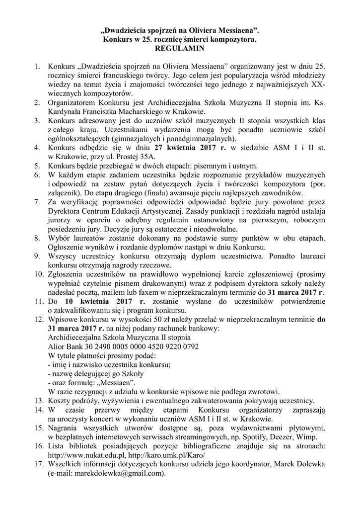 „Dwadzieścia spojrzeń na Oliviera Messiaena”. Konkurs w 25. rocznicę śmierci kompozytora. REGULAMIN 1. Konkurs „Dwadzieścia spojrzeń na Oliviera Messiaena” organizowany jest w dniu 25. rocznicy śmierci francuskiego twórcy. Jego celem jest popularyzacja wśród młodzieży wiedzy na temat życia i znajomości twórczości tego jednego z najważniejszych XXwiecznych kompozytorów. 2. Organizatorem Konkursu jest Archidiecezjalna Szkoła Muzyczna II stopnia im. Ks. Kardynała Franciszka Macharskiego w Krakowie. 3. Konkurs adresowany jest do uczniów szkół muzycznych II stopnia wszystkich klas z całego kraju. Uczestnikami wydarzenia mogą być ponadto uczniowie szkół ogólnokształcących (gimnazjalnych i ponadgimnazjalnych). 4. Konkurs odbędzie się w dniu 27 kwietnia 2017 r. w siedzibie ASM I i II st. w Krakowie, przy ul. Prostej 35A. 5. Konkurs będzie przebiegać w dwóch etapach: pisemnym i ustnym. 6. W każdym etapie zadaniem uczestnika będzie rozpoznanie przykładów muzycznych i odpowiedź na zestaw pytań dotyczących życia i twórczości kompozytora (por. załącznik). Do etapu drugiego (finału) awansuje pięciu najlepszych zawodników. 7. Za weryfikację poprawności odpowiedzi odpowiadać będzie jury powołane przez Dyrektora Centrum Edukacji Artystycznej. Zasady punktacji i rozdziału nagród ustalają jurorzy w oparciu o odrębny regulamin ustanowiony na pierwszym, roboczym posiedzeniu jury. Decyzje jury są ostateczne i nieodwołalne. 8. Wybór laureatów zostanie dokonany na podstawie sumy punktów w obu etapach. Ogłoszenie wyników i rozdanie dyplomów nastąpi w dniu Konkursu. 9. Wszyscy uczestnicy konkursu otrzymają dyplom uczestnictwa. Ponadto laureaci konkursu otrzymają nagrody rzeczowe. 10. Zgłoszenia uczestników na prawidłowo wypełnionej karcie zgłoszeniowej (prosimy wypełniać czytelnie pismem drukowanym) wraz z podpisem dyrektora szkoły należy nadesłać pocztą, mailem lub faxem w nieprzekraczalnym terminie do 31 marca 2017 r. 11. Do 10 kwietnia 2017 r. zostanie wysłane do uczestników potwierdzenie o zakwalifikowaniu się i program konkursu. 12. Wpisowe konkursu w wysokości 50 zł należy przelać w nieprzekraczalnym terminie do 31 marca 2017 r. na niżej podany rachunek bankowy: Archidiecezjalna Szkoła Muzyczna II stopnia Alior Bank 30 2490 0005 0000 4520 9220 0792 W tytule płatności prosimy podać: - imię i nazwisko uczestnika konkursu; - nazwę delegującej go Szkoły - oraz formułę: „Messiaen”. W razie rezygnacji z udziału w konkursie wpisowe nie podlega zwrotowi. 13. Koszty podróży, wyżywienia i ewentualnego zakwaterowania pokrywają uczestnicy. 14. W czasie przerwy między etapami Konkursu organizatorzy zapraszają na uroczysty koncert w wykonaniu uczniów ASM I i II st. w Krakowie. 15. Nagrania wszystkich utworów dostępne są, poza wydawnictwami płytowymi, w bezpłatnych internetowych serwisach streamingowych, np. Spotify, Deezer, Wimp. 16. Lista bibliotek posiadających pozycje bibliograficzne znajduje się na stronach: http://www.nukat.edu.pl, http://karo.umk.pl/Karo/ 17. Wszelkich informacji dotyczących konkursu udziela jego koordynator, Marek Dolewka (e-mail: [email protected]). WYMAGANIA KONKURSOWE DZIEŁA FORTEPIANOWE 1. Preludia (Huit préludes) [1928-29] 2. Dwadzieścia spojrzeń na Dzieciątko Jezus (Vingt regards sur l’Enfant-Jésus), cz. I-X [1944] 3. Cztery etiudy rytmiczne (Quatre études de rythme) [1949-50] 4. Małe szkice ptaków (Les petites esquisses d’oiseaux) [1985] DZIEŁA ORGANOWE 1. Uczta niebiańska (Le banquet céleste) [1926-28] 2. Msza na Zielone Święta (Messe de la Pentecôte) [1950] 3. Księga organowa (Livre d’orgue) [1951] 4. Monodia (Monodie) [1963] DZIEŁA KAMERALNE 1. Temat z wariacjami (Thème et variations) na skrzypce i fortepian [1932] 2. Święto pięknych wód (Fête des belles eaux) na sekstet fal Martenota [1937] 3. Kwartet na koniec Czasu (Quatuor pour la fin du Temps) na skrzypce, klarnet, wiolonczelę i fortepian [194041] 4. Melodia w stylu Mozarta (Chant donné dans le style de Mozart) na klarnet i fortepian [1986] DZIEŁA ORKIESTROWE 1. Symfonia „Turangalîla” (Turangalîla-Symphonie) na fortepian, fale Martenota i wielką orkiestrę [1946-48] 2. Ptaki egzotyczne (Oiseaux exotiques) na fortepian i orkiestrę [1955-56] 3. Siedem haikai. Szkice japońskie (Sept haïkaï. Esquisses japonaises) na fortepian i małą orkiestrę [1962] 4. Uśmiech (Un sourire) na orkiestrę [1989] DZIEŁA WOKALNE I WOKALNO-INSTRUMENTALNE 1. Wokaliza-etiuda (Vocalise-Étude) na głos wysoki (i fortepian) [1935] 2. Pieśni o ziemi i niebie (Chants de terre et de ciel) na sopran i fortepian do sł. O. Messiaena [1938] 3. Trzy małe Liturgie o Obecności Bożej (Trois petites liturgies de la Présence Divine) na fortepian, fale Martenota, czelestę, wibrafon, perkusję, chór żeński i orkiestrę smyczkową [1943-44] 4. Pięć refrenów (Cinq rechants) na 12 głosów mieszanych do sł. O. Messiaena [1948] BIBLIOGRAFIA 1. Stankiewicz Jerzy, Olivier Messiaen, [w:] Encyklopedia Muzyczna PWM. Red. Elżbieta Dziębowska, t. M. Kraków 2000, s. 201–214. 2. Stankiewicz Jerzy, Olivier Messiaen. Człowiek i artysta w Stalagu VIII A w Görlitz. Przewodnik biograficzny na otwarcie Europejskiego Centrum Edukacyjno-Kulturalnego Meetingpoin Music Messiaen, ZgorzelecGoerlitz, Kraków, s. 10–76. (rozdział: Kim był Olivier Messiaen?)
