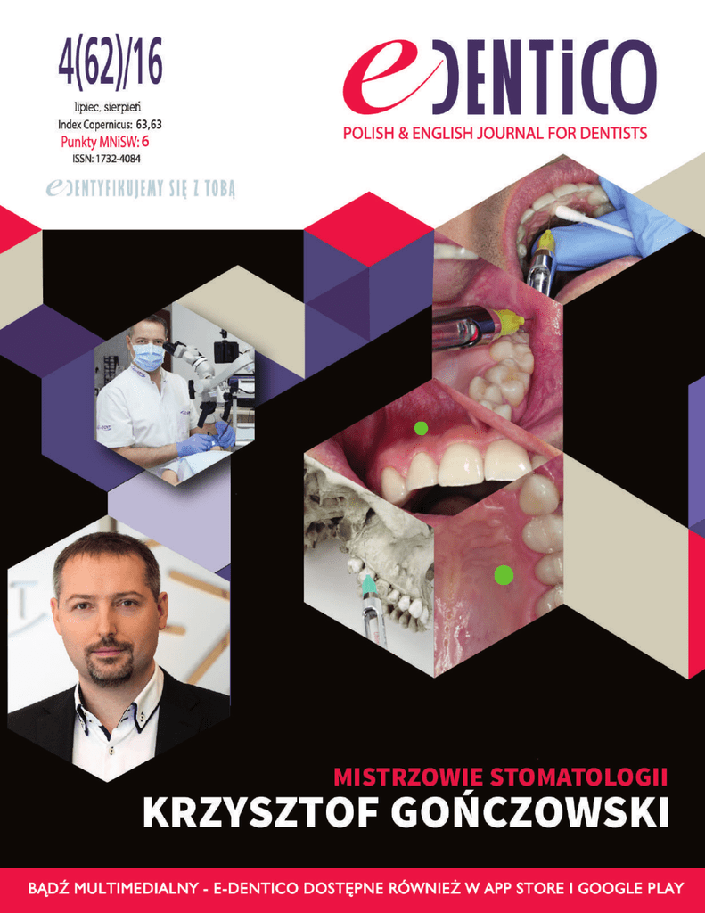 Mimo letniej kanikuły i – mam nadzieję – sukcesów, jakie odnoszą Bestom DENTOnet.pl Sp. z o.o. ul. Wigury 15a, 90-302 Łódź tel.: (42) 637 02 77, fax: (42) 676 28 27 www.edentico.pl, [email protected] Państwo w życiu zawodowym i osobistym, wydarzenia wokół nas nie napawają optymizmem. Chyba definitywnie skończył się relatyw- Redaktor naczelny Editor-in-Chief dr n. med. Tomasz Maria Kercz nie bezpieczny świat, jaki znaliśmy i w jakim wyrastaliśmy. Pewnie [email protected] przynajmniej niektórzy z Państwa zastanawiają się, co z wakacyjnymi Redaktor prowadzący Executive Editor mgr Tomasz Hankiewicz planami. Czy to wciąż dobry po- [email protected] Redaktorzy tematyczni Feature Editors dzianki” nieujętej w żadnym przewodniku turystycznym? A kto powiedział, że swoj- Redaktor graficzny, fotoedytor, DTP Graphic designer, photo editor, DTP mgr Krzysztof Dybalski że nastała era Europy „bez znieczulenia”. Byle nie na długo, bo przynajmniej ja do Redaktor statystyczny Statistical editor mgr Piotr Łukaszewicz Redaktorzy językowi Language editors język polski – mgr Agnieszka Goszczyńska język angielski – Jonathan E. Lilly Korekta Editor’s revision Tomasz Hankiewicz Marketing i reklama Marketing and advertisement AT I O NA L kę? Albo czy w upalnym o tej porze roku Rzymie ktoś aby nie przygotowuje „niespo- dr hab n. med. Jan Pietruski (protetyka), dr n. med. Aneta Grochowina (radiologia), dr n. med. Paweł Niewada (periodontologia), dr n. med. Aleksander Przygoński (chirurgia), [email protected] INTERN mysł, by lecieć na francuską Korsy- Journal ski „Monciak” w Sopocie będzie wolny od zagrożeń, nie tylko takich, jak nagie torsy poza strefami plażowania, z którymi miasto próbuje od pewnego czasu walczyć?! Bez dwóch zdań, nie ma już miejsc bezpiecznych i chyba czas pogodzić się z faktem, takiego stanu nie mam zamiaru przyzwyczajać się zanadto, a obiecałem sobie, że od 2018 zacznę jeździć na urlopy... Á propos znieczuleń, w najnowszym wydaniu „e-Dentico” proponujemy spotkanie z Autorem dobrze znanym w naszym środowisku od lat, choć wciąż młodym wiekiem – dr. Krzysztofem Gończowskim. Muszę się przyznać, że na materiały przygotowane przez Mistrza patrzę z pewną ...zazdrością. Nie żebym czyjś sukces odbierał w kategoriach własnej porażki, nic z tego! Rzecz w tym, że Autor porusza tematykę szczególnie mi bliską, którą omawiałem dawno temu na zajęciach ze studentami. Nie każdy stomatolog przeprowadza implantacje, tylko niektórzy podejmują się tel.: (42) 637 02 77, 665 37 00 66 Ariel Jarosz, [email protected] Dorota Percha, [email protected] skomplikowanych procedur chirurgicznych, ale nie ma w naszym fachu osoby, która Prenumerata Subscription wprowadzić do jamy ustnej choćby lusterka. Jeśli boi się pacjent (w większości przy- [email protected] padków bezzasadnie), to jeszcze pół biedy, ale gdy lęk odczuwa lekarz, to już mamy Dział sprzedaży Sales department problem! Czego obawia się stomatolog? Ano właśnie analgezji, a tak naprawdę po- tel.: (42) 676 28 25 numery archiwalne, tel.: 601 55 78 79 wikłań i konsekwencji prawnych tych niewłaściwie podanych. Aby ich uniknąć, lekarz M a ster Lis t Pismo indeksowane w Index Copernicus: 63,63 pkt. Punktacja MNiSW: 6 pkt. Nakład 6500 egz. Wersja pierwotna – drukowana by nie stosowała znieczuleń. A przy tym chyba każdy z nas ma przynajmniej jednego pacjenta „pod szczególną ochroną”, który bez uprzedniego znieczulenia nie pozwoli powinien mieć wiedzę, umiejętności i przy każdym podawanym znieczuleniu dużo pokory zawodowej. Z tym większym przekonaniem polecam Państwu lekturę trzech artykułów dr. Gończowskiego. Wszystkie wymienione produkty i nazwy są używane wyłącznie w celach identyfikacyjnych i mogą być zastrzeżonymi znakami towarowymi odpowiednich właścicieli. Redakcja nie zwraca materiałów niezamówionych oraz zastrzega sobie prawo do adjustacji, doboru tytułów i skracania nadsyłanych materiałów. Redakcja nie ponosi odpowiedzialności za treść reklam. 2 Dwumiesięcznik Stomatologa Praktyka Polish & English Journal for Dentists PRAKTYKA 58 IMPLANTACJA NATYCHMIASTOWA PO URAZOWYM ZŁAMANIU SIEKACZA W SZCZĘCE. OPIS PRZYPADKU lek. dent. Łukasz Podlewski dr hab. n. med. Jan Pietruski 64 STRES A ZMIANY NA BŁONIE ŚLUZOWEJ JAMY USTNEJ – PRZEGLĄD PIŚMIENNICTWA THE IMPACT OF STRESS ON LESIONS OF THE ORAL MUCOSA – LITERATURE REVIEW lek. dent. Michalina Szymczak-Paluch dr hab. n. med. Sebastian Kłosek 74 ZASTOSOWANIE WOLNYCH PRZESZCZEPÓW TKANEK MIĘKKICH W CELU AUGMENTACJI DZIĄSŁA W KONTEKŚCIE LECZENIA ORTODONTYCZNEGO – CZĘŚĆ I THE USE OF FREE SOFT TISSUE GRAFTS IN GINGIVAL AUGMENTATION IN THE COURSE OF ORTHODONTIC TREATMENT – PART I lek. dent. Bartłomiej Górski lek. dent. Edyta Ciok dr n. med. Maciej Zaremba MISTRZOWIE STOMATOLOGII KRZYSZTOF GOŃCZOWSKI 8 BRAK BÓLU I STRESU PODCZAS LECZENIA ATRAUMATYCZNA TECHNIKA WYKONYWANIA ZNIECZULEŃ MIEJSCOWYCH W STOMATOLOGII WYBRANE TECHNIKI ZNIECZULANIA 38 MIEJSCOWEGO W STOMATOLOGII 6 Dwumiesięcznik Stomatologa Praktyka Polish & English Journal for Dentists STAN HIGIENY JAMY USTNEJ OSÓB Z DYSFUNKCJAMI WZROKU CONDITION OF ORAL HYGIENE IN THE PEOPLE WITH VISION DYSFUNCTIONS STOMATOLOGICZNEGO – FIKCJA CZY RZECZYWISTOŚĆ? NO PAIN AND STRESS DURING DENTAL TREATMENT – FICTION OR REALITY? 24 82 lek. dent. Aryan Khaleel 88 LECZENIE PULPOPATII ZĘBÓW MLECZNYCH – PRZEGLĄD PIŚMIENNICTWA TREATING PULP DISEASES IN DECIDUOUS TEETH – LITERATURE REVIEW lek. dent. Paulina Pieniążek-Adamiec dr n. med. Daria Pietraszewska dr hab. n. med. Lidia Postek-Stefańska SPIS TREŚCI EDUKACJA 98 WŁAŚCIWOŚCI FIZYKOCHEMICZNE RÓŻNYCH PREPARATÓW NA BAZIE MTA – PRZEGLĄD PIŚMIENNICTWA. CZĘŚĆ 2: WŁAŚCIWOŚCI FIZYCZNE THE PHYSICOCHEMICAL PROPERTIES OF DIFFERENT MTA-BASED FORMULATIONS – LITERATURE REVIEW. PART 2: PHYSICAL PROPERTIES l
