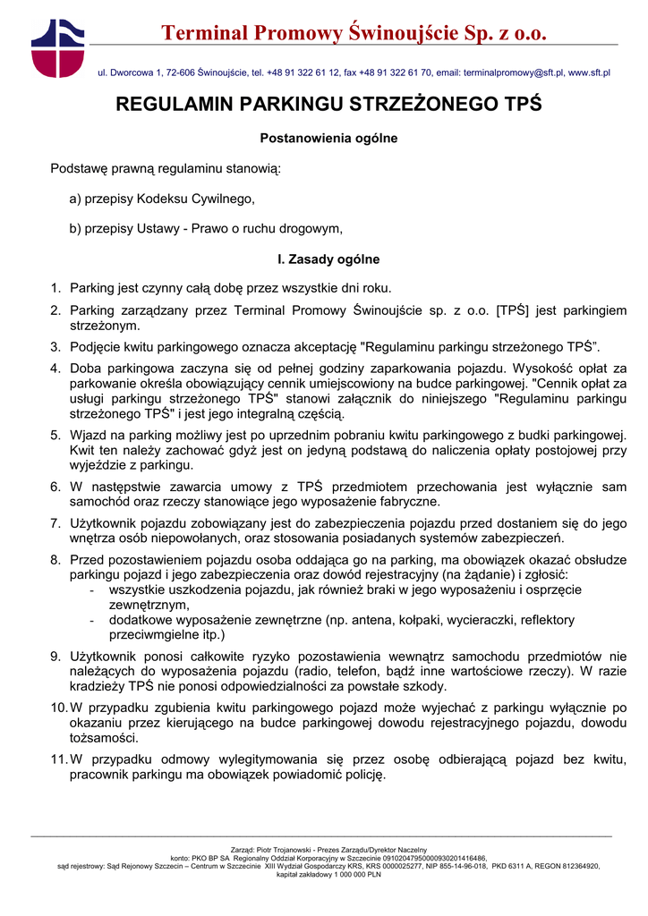 Terminal Promowy Świnoujście Sp. z o.o. ul. Dworcowa 1, 72-606 Świnoujście, tel. +48 91 322 61 12, fax +48 91 322 61 70, email: [email protected], www.sft.pl REGULAMIN PARKINGU STRZEśONEGO TPŚ Postanowienia ogólne Podstawę prawną regulaminu stanowią: a) przepisy Kodeksu Cywilnego, b) przepisy Ustawy - Prawo o ruchu drogowym, I. Zasady ogólne 1. Parking jest czynny całą dobę przez wszystkie dni roku. 2. Parking zarządzany przez Terminal Promowy Świnoujście sp. z o.o. [TPŚ] jest parkingiem strzeŜonym. 3. Podjęcie kwitu parkingowego oznacza akceptację "Regulaminu parkingu strzeŜonego TPŚ”. 4. Doba parkingowa zaczyna się od pełnej godziny zaparkowania pojazdu. Wysokość opłat za parkowanie określa obowiązujący cennik umiejscowiony na budce parkingowej. "Cennik opłat za usługi parkingu strzeŜonego TPŚ" stanowi załącznik do niniejszego "Regulaminu parkingu strzeŜonego TPŚ" i jest jego integralną częścią. 5. Wjazd na parking moŜliwy jest po uprzednim pobraniu kwitu parkingowego z budki parkingowej. Kwit ten naleŜy zachować gdyŜ jest on jedyną podstawą do naliczenia opłaty postojowej przy wyjeździe z parkingu. 6. W następstwie zawarcia umowy z TPŚ przedmiotem przechowania jest wyłącznie sam samochód oraz rzeczy stanowiące jego wyposaŜenie fabryczne. 7. UŜytkownik pojazdu zobowiązany jest do zabezpieczenia pojazdu przed dostaniem się do jego wnętrza osób niepowołanych, oraz stosowania posiadanych systemów zabezpieczeń. 8. Przed pozostawieniem pojazdu osoba oddająca go na parking, ma obowiązek okazać obsłudze parkingu pojazd i jego zabezpieczenia oraz dowód rejestracyjny (na Ŝądanie) i zgłosić: - wszystkie uszkodzenia pojazdu, jak równieŜ braki w jego wyposaŜeniu i osprzęcie zewnętrznym, - dodatkowe wyposaŜenie zewnętrzne (np. antena, kołpaki, wycieraczki, reflektory przeciwmgielne itp.) 9. UŜytkownik ponosi całkowite ryzyko pozostawienia wewnątrz samochodu przedmiotów nie naleŜących do wyposaŜenia pojazdu (radio, telefon, bądź inne wartościowe rzeczy). W razie kradzieŜy TPŚ nie ponosi odpowiedzialności za powstałe szkody. 10. W przypadku zgubienia kwitu parkingowego pojazd moŜe wyjechać z parkingu wyłącznie po okazaniu przez kierującego na budce parkingowej dowodu rejestracyjnego pojazdu, dowodu toŜsamości. 11. W przypadku odmowy wylegitymowania się przez osobę odbierającą pojazd bez kwitu, pracownik parkingu ma obowiązek powiadomić policję. _________________________________________________________________________________________ Zarząd: Piotr Trojanowski - Prezes Zarządu/Dyrektor Naczelny konto: PKO BP SA Regionalny Oddział Korporacyjny w Szczecinie 09102047950000930201416486, sąd rejestrowy: Sąd Rejonowy Szczecin – Centrum w Szczecinie XIII Wydział Gospodarczy KRS, KRS 0000025277, NIP 855-14-96-018, PKD 6311 A, REGON 812364920, kapitał zakładowy 1 000 000 PLN 12. W przypadku zgubienia kluczyków bądź zamknięcia ich wewnątrz pojazdu, próby dostania się do wnętrza samochodu mogą być podjęte przez klienta dopiero po okazaniu dowodu rejestracyjnego pojazdu oraz dowodu osobistego. 13. Pojazd moŜe pozostawać na parkingu wyłącznie celem jego parkowania. Bez zgody dyspozytora parkingu zabrania się prowadzenia jakiejkolwiek działalności handlowej z pojazdu, dokonywania napraw pojazdów, ich mycia, i.t.p. 14. Na parkingu obowiązuje bezwzględny zakaz wjazdu pojazdów: - przewoŜących materiały łatwopalne, Ŝrące, wybuchowe - innych, jeŜeli znajdujący się w nich niebezpieczny materiał nie jest zabezpieczony zgodnie z obowiązującymi przepisami 15. Na terenie parkingu obowiązuje całkowity zakaz spoŜywania alkoholu. 16. Osobom w stanie nietrzeźwym lub których stan wskazuje na spoŜycie alkoholu, obsługa parkingu moŜe odmówić przyjęcia na parking lub wydania z parkingu pojazdu. 17. W przypadku kolizji i wypadków drogowych powstałych na terenie parkingu obowiązują zasady prawa drogowego. 18. Wszelkie uwagi i wnioski uŜytkowników parkingu, a w szczególności dotyczące jego funkcjonowania proszę kierować do kierownika parkingu. Nazwisko i numer telefonu dostępny jest na budce parkingowej. IV. Postanowienia końcowe 1. UŜytkownik pojazdu odpowiada za wszelkie szkody wyrządzone osobom trzecim na terenie parkingu TPŚ przez niego samego, jego pracowników, zleceniobiorców lub jego osoby towarzyszące. Ponadto ponosi on odpowiedzialność za zawinione zanieczyszczenie parkingu. 2. TPŚ jest upowaŜnione do usunięcia pojazdu z parkingu w razie zaistnienia nagłego i uzasadnionego zagroŜenia. 3. TPŚ nie ponosi odpowiedzialności za skutki wynikające z działania siły wyŜszej oraz nieprzestrzegania przez korzystającego z parkingu postanowień niniejszego regulaminu. 4. W przypadku stwierdzenia powstania szkody w pojeździe, uŜytkownik winien zgłosić ten fakt niezwłocznie obsłudze parkingu bez uruchomienia pojazdu i podporządkować się ich zaleceniom. 5. Roszczenia dotyczące szkód powstałych na parkingu strzeŜonym regulowane są przez ubezpieczyciela parkingu, którego nazwę i adres moŜna uzyskać u dyspozytora parkingu. Regulamin obowiązuje od dnia 10 grudnia 2009r. Prezes Zarządu TPŚ – Piotr Trojanowski Strona 2 z 2