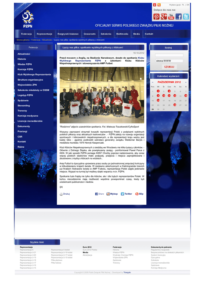 Wybierz język: PL | EN Dołącz do nas na: Strona główna / Federacja / Aktualności / Łączy nas piłka: spotkanie wybitnych piłkarzy z kibicami 19.10.2012 Aktualności Historia Władze PZPN Przed meczem z Anglią, na Stadionie Narodowym, doszło do spotkania Klubu Wybitnego Reprezentanta PZPN z członkami Klubu Kibiców Niepełnosprawnych i stowarzyszenia AMP Futbol. strona WWW Komisje PZPN Klub Wybitnego Reprezentanta Struktura organizacyjna ‹‹ PAŹDZIERNIK 2012 ›› Wojewódzkie ZPN Pon Szkolenie młodzieży w OSSM Wt 1 Logotyp PZPN Śr Czw 3 Pt So N 5 6 7 8 13 Sędziowie 15 17 18 Stewarding 22 23 24 25 29 30 31 Trenerzy 19 20 21 27 28 Komisja medyczna Licencje menedżerskie Dokumenty "Rodzinne" zdjęcie uczestników spotkania. Fot. Mateusz Trzuskowski/CyfraSport Przetargi Wszyscy zaproszeni otrzymali koszulki reprezentacji Polski z podpisami wybitnych polskich piłkarzy oraz aktualnych kadrowiczów . - PZPN zależy na rozwoju organizacji sportowych i kibicowskich niepełnosprawnych, a dla reprezentacji kraju ważny jest każdy kibic - zgodnie podkreślili sekretarz generalny związku Waldemar Baryło i medalista mundialu 1974 Henryk Kasperczak. CSR Kontakt Różne Klub Kibiców Niepełnosprawnych z siedzibą we Wrocławiu ma kilka tysięcy członków. Głównie z Dolnego Śląska, ale powiększamy zasięg - poinformował Paweł Parus z KKN. W jaki sposób PZPN pomaga KKN? Choćby poprzez nadzorowanie, aby coraz więcej polskich stadionów miało podjazdy, przejścia i miejsca zaprojektowane i zbudowane z myślą o kibicach na wózkach.. Amp Futbol to dyscyplina uprawiana przez osoby po jednostronnej amputacji kończyny w kilkudziesięciu krajach świata. W niedawno zakończonych w Kaliningradzie trzecich już finałach mistrzostw świata w AMP Futbolu, reprezentacja Polski zajęła jedenaste miejsce. Wyjazd na turniej był możliwy dzięki wsparciu m.in. PZPN. Spotkanie było frajdą nie tylko dla kibiców, ale i dla byłych reprezentantów Polski. W końcu niecodziennie mają możliwość wspólnie powspominać czasy, kiedy byli ulubieńcami publiczności i mediów. (jk) Drukuj Reprezentacje Reprezentacja A Reprezentacja U-21 Reprezentacja U-20 Reprezentacja U-19 Reprezentacja U-18 Reprezentacja U-17 Reprezentacja U-16 Reprezentacja U-15 Reprezentacja A kobiet Reprezentacja U-19 kobiet Reprezentacja U-17 kobiet Reprezentacja U-15 kobiet Piłka plażowa Piłka halowa Share Euro 2012 Euro 2012 Polska Media Akredytacje Wykop Twitter Federacja Historia Władze PZPN Wydziały i Komisje PZPN Wojewódzkie ZPN Sędziowie Trenerzy Copyright © 2009 Polski Związek Piłki Nożnej :: Developed by Triangolo Blip Dokumenty do pobrania Regulaminy rozgrywek Bezpieczeństwo na obiekatch piłkarskich System licencyjny Dyscyplina Szkolenie Licencje menedżerskie Sędziowie Komisja Medyczna