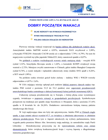 6 SIERPIEŃ 2013 PODSUMOWANIE LIPCA NA RYNKACH AKCJI DOBRY POCZĄTEK WAKACJI SILNE WZROSTY NA RYNKACH ROZWINIĘTYCH RYNKI WSCHODZĄCE TROCHĘ W TYLE POLSKA GIEŁDA DOŁĄCZA DO WZROSTÓW Pierwszy miesiąc wakacji rozpoczął się bardzo dobrze dla globalnych rynków akcji. Amerykański indeks S&P500 wzrósł o 4,95%, niemiecki DAX zwyżkował o 3,98%, a brytyjski FTSE250 i francuski CAC40 urosły aż o odpowiednio 7,79% i 6,79%. Na tym tle negatywnie wyróżnił się tylko japoński Nikkei225, który zanotował spadek o 0,07%. Na giełdach z rynków wschodzących wzrosty miały mniejszą skalę – rosyjski RTS zyskał 3,32%, brazylijska Bovespa urosła o 1,64%, a koreański KOSPI zwiększył swoją wartość o 2,72%. Mniejsze zwyżki zanotowano w Chinach, gdzie indeks Shanghai Composite zyskał 0,74%, a rynek indyjski i tajlandzki odnotowały straty (indeks SNX spadł o 0,26%, a SET stracił 1,98%). Na polskim rynku również gościł kolor zielony – indeksy WIG i WIG20 wzrosły odpowiednio o 4,87% i 3,6%. W USA mijający miesiąc upłynął pod znakiem lekkiej poprawy danych makro (np. indeks PMI wzrósł z poziomu 51,9 do 53,2 punktu) oraz zapewnień przedstawicieli amerykańskiego banku centralnego o dalszej kontynuacji luźnej polityki monetarnej (QE3). Ciekawiej sytuacja przedstawiała się w Europie, z której płyną coraz wyraźniejsze sygnały, świadczące o poprawie sytuacji w gospodarkach peryferyjnych. Symbolicznym przejawem tej tendencji jest spadek stopy bezrobocia w Hiszpanii, która z poziomu 27,16% spadła w II kwartale br. do 26,26%. Dodatkowo zatwierdzono kolejną transzę pakietu ratunkowego dla Grecji. W Azji napływające dane nie były tak optymistyczne. Indeks PMI w Chinach ciągle spada, a jego ostatni odczyt wyniósł 47,7, co świadczy o obniżeniu aktywności w chińskim sektorze produkcyjnym. Poza tym w Japonii zakończyły się wybory parlamentarne, które wygrała partia premiera Shinzo Abe. Inwestorzy mają nadzieję, że samodzielne rządy Partii Liberalno – Demokratycznej przyczynią się do wprowadzenia reform oraz zmian ekonomicznych, które zwiększą konkurencyjność kraju i wyrwą Japonię z długoletniego marazmu gospodarczego. 6 SIERPIEŃ 2013 Poniżej podsumowujemy wyniki naszych najpopularniejszych Strategii IFM w 2013 roku, na tle konkurencyjnych rozwiązań polskich: OKRES: 31 GRUDNIA 2012 r. – 31 LIPCA 2013 r. 6 SIERPIEŃ 2013 Jeśli możemy odpowiedzieć na Państwa dodatkowe pytania, pozostajemy do dyspozycji pod następującymi numerami telefonów: Dział Analiz IFM Katowice, tel. (32) 602 79 00 Warszawa, tel. (22) 319 57 60 Wrocław, tel. (71) 787 75 49 www.ifmpl.com Zapraszamy do śledzenia komentarzy dr Marka Mobiusa nt. rynków wschodzących na stronie Investment Fund Managers S.A.: „Podróże po rynkach wschodzących”, http://komentarzemobiusa.ifmpl.com/. Ostatnio ukazały się: Dzwony weselne w Rumunii; Brazylijskie społeczeństwo chce być wysłuchane; Witamy Grecję z powrotem w gronie krajów rozwijających się. Źródło: Investment Fund Managers S.A. Nota prawna: Niniejszy dokument sporządzono wyłącznie dla celów informacyjnych i nie stanowi on: 1) oferty kupna lub sprzedaży ani zachęty do kupna lub sprzedaży jakichkolwiek papierów wartościowych bądź instrumentów finansowych, o których mowa w niniejszym dokumencie, ani też nie ma charakteru: 2) doradztwa inwestycyjnego. Wszelkie decyzje o inwestycji w papiery wartościowe omówione w niniejszym dokumencie należy podejmować po zapoznaniu się z najbardziej aktualną wersją prospektu emisyjnego. Ponadto potencjalni inwestorzy powinni przeprowadzić stosowne analizy, jakie uznają za niezbędne oraz powinni skorzystać z usług doradztwa w kwestiach prawnych, księgowych i podatkowych w celu samodzielnego i świadomego ustalenia stosowności oraz konsekwencji i skutków inwestycji w papiery wartościowe. Opinie zawarte w niniejszym dokumencie mogą ulec zmianie bez uprzedniego powiadomienia. Osiągnięte w przeszłości przez zaprezentowane fundusze stopy zwrotu nie są gwarancją uzyskania podobnych stóp zwrotu w przyszłości.