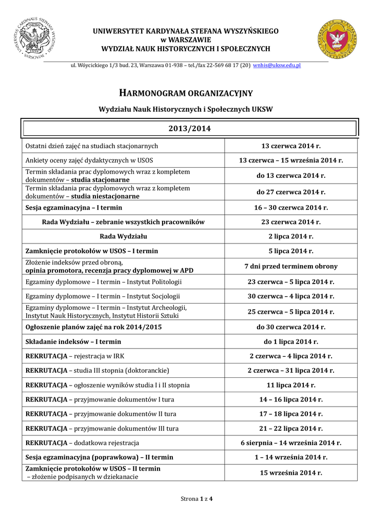 UNIWERSYTET KARDYNAŁA STEFANA WYSZYŃSKIEGO w WARSZAWIE WYDZIAŁ NAUK HISTORYCZNYCH I SPOŁECZNYCH ul. Wóycickiego 1/3 bud. 23, Warszawa 01-938 – tel./fax 22-569 68 17 (20) [email protected] HARMONOGRAM ORGANIZACYJNY Wydziału Nauk Historycznych i Społecznych UKSW 2013/2014 Ostatni dzień zajęć na studiach stacjonarnych 13 czerwca 2014 r. Ankiety oceny zajęć dydaktycznych w USOS 13 czerwca – 15 września 2014 r. Termin składania prac dyplomowych wraz z kompletem dokumentów – studia stacjonarne Termin składania prac dyplomowych wraz z kompletem dokumentów – studia niestacjonarne Sesja egzaminacyjna – I termin do 13 czerwca 2014 r. do 27 czerwca 2014 r. 16 – 30 czerwca 2014 r. Rada Wydziału – zebranie wszystkich pracowników 23 czerwca 2014 r. Rada Wydziału 2 lipca 2014 r. Zamknięcie protokołów w USOS – I termin 5 lipca 2014 r. Złożenie indeksów przed obroną, opinia promotora, recenzja pracy dyplomowej w APD 7 dni przed terminem obrony Egzaminy dyplomowe – I termin – Instytut Politologii 23 czerwca – 5 lipca 2014 r. Egzaminy dyplomowe – I termin – Instytut Socjologii 30 czerwca – 4 lipca 2014 r. Egzaminy dyplomowe – I termin – Instytut Archeologii, Instytut Nauk Historycznych, Instytut Historii Sztuki 25 czerwca – 5 lipca 2014 r. Ogłoszenie planów zajęć na rok 2014/2015 do 30 czerwca 2014 r. Składanie indeksów – I termin do 1 lipca 2014 r. REKRUTACJA – rejestracja w IRK 2 czerwca – 4 lipca 2014 r. REKRUTACJA – studia III stopnia (doktoranckie) 2 czerwca – 31 lipca 2014 r. REKRUTACJA – ogłoszenie wyników studia I i II stopnia 11 lipca 2014 r. REKRUTACJA – przyjmowanie dokumentów I tura 14 – 16 lipca 2014 r. REKRUTACJA – przyjmowanie dokumentów II tura 17 – 18 lipca 2014 r. REKRUTACJA – przyjmowanie dokumentów III tura 21 – 22 lipca 2014 r. REKRUTACJA – dodatkowa rejestracja 6 sierpnia – 14 września 2014 r. Sesja egzaminacyjna (poprawkowa) – II termin 1 – 14 września 2014 r. Zamknięcie protokołów w USOS – II termin – złożenie podpisanych w dziekanacie 15 września 2014 r. Strona 1 z 4 UNIWERSYTET KARDYNAŁA STEFANA WYSZYŃSKIEGO w WARSZAWIE WYDZIAŁ NAUK HISTORYCZNYCH I SPOŁECZNYCH ul. Wóycickiego 1/3 bud. 23, Warszawa 01-938 – tel./fax 22-569 68 17 (20) [email protected] Egzaminy dyplomowe – II termin 15 – 17 września 2014 r. Składanie indeksów – II termin do 15 września 2014 r. DZIEKANAT NIECZYNNY DLA STUDENTÓW 16 – 17 września 2014 r. REKRUTACJA – studia III stopnia (doktoranckie) – ogłoszenie wyników (historia, socjologia) 15 września 2014 r. REKRUTACJA – ogłoszenie wyników po dodatkowej rejestracji 17 września 2014 r. REKRUTACJA – przyjmowanie dokumentów 18 – 19 września 2014 r. Rada Wydziału – zebranie wszystkich pracowników 22 września 2014 r. Rejestracja na zajęcia w USOS na semestr zimowy 2014/2015 23 – 30 września 2014 r. REKRUTACJA – studia III stopnia (doktoranckie) – ogłoszenie wyników (nauki o polityce) 25 września 2014 r. 2014/2015 SEMESTR ZIMOWY Dzień organizacyjny dla studentów I roku studiów stacjonarnych I i II stopnia 26 września 2014 r. Pierwszy dzień na studiach niestacjonarnych 26 września 2014 r. Pierwszy dzień zajęć na studiach stacjonarnych 1 października 2014 r. Podpisywanie umów ze studentami 1 – 31 października 2014 r. Uroczysta inauguracja roku akademickiego 6 października 2014 r. Rada Wydziału 13 października 2014 r. Dzień wolny od zajęć 10 listopada 2014 r. Sprawdzenie przez dziekanat zgodności danych w systemie POL-ON do 15 listopada 2014 r. Rada Wydziału 17 listopada 2014 r. Rada Wydziału 8 grudnia 2014 r. Opłatek uniwersytecki 15 grudnia 2014 r. godz. 13.30 Przerwa świąteczna 22 grudnia 2014 r. – 2 stycznia 2015 r. Informacja o terminach egzaminów w sesji semestru zimowego do 10 stycznia 2015 r. Rada Wydziału 12 stycznia 2015 r. Ostatni dzień zajęć w semestrze zimowym na studiach stacjonarnych 29 stycznia 2015 r. Strona 2 z 4 UNIWERSYTET KARDYNAŁA STEFANA WYSZYŃSKIEGO w WARSZAWIE WYDZIAŁ NAUK HISTORYCZNYCH I SPOŁECZNYCH ul. Wóycickiego 1/3 bud. 23, Warszawa 01-938 – tel./fax 22-569 68 17 (20) [email protected] Ankiety oceny zajęć dydaktycznych w USOS 30 stycznia – 15 marca 2015 r. Sesja egzaminacyjna – I termin 30 stycznia – 8 lutego 2015 r. Zamknięcie protokołów w USOS – I termin 11 lutego 2015 r. Informacja o terminach egzaminów w sesji poprawkowej Rejestracja na zajęcia w USOS na semestr letni 2014/2015 Rada Wydziału do 13 lutego 2015 r. 11 – 15 lutego 2015 r. 9 lutego 2015 r. Przerwa semestralna dla studiów stacjonarnych 9 – 13 lutego 2015 r. SEMESTR LETNI Zajęcia na studiach niestacjonarnych według planów od 13 lutego 2015 r. Pierwszy dzień zajęć na studiach stacjonarnych 16 lutego 2015 r. Sesja egzaminacyjna (poprawkowa) – II termin 2 – 10 marca 2015 r. Rada Wydziału 9 marca 2015 r. Zamknięcie protokołów w USOS – II termin – złożenie podpisanych w dziekanacie 11 marca 2015 r. Sprawdzenie przez dziekanat zgodności danych w systemie POL-ON Przerwa świąteczna do 15 marca 2015 r. 1 – 7 kwietnia 2015 r. Rada Wydziału 13 kwietnia 2015 r. Rada Wydziału 11 maja 2015 r. Informacja o terminach egzaminów w sesji semestru letniego Święto UKSW i promocje doktorskie i habilitacyjne do 15 maja 2015 r. 28 maja 2015 r. Dzień wolny od zajęć 5 czerwca 2015 r. Rada Wydziału 8 czerwca 2015 r. Ostatni dzień zajęć w semestrze letnim 14 czerwca 2015 r. Ankiety oceny zajęć dydaktycznych w USOS 14 czerwca – 20 września 2015 r. Termin składania prac dyplomowych wraz z kompletem dokumentów – studia stacjonarne Termin składania prac dyplomowych wraz z kompletem dokumentów – studia niestacjonarne Sesja egzaminacyjna – I termin do 12 czerwca 2015 r. do 14 czerwca 2015 r. 15 – 30 czerwca 2015 r. Informacja o terminach egzaminów w sesji poprawkowej Strona 3 z 4 do 30 czerwca 2015 r. UNIWERSYTET KARDYNAŁA STEFANA