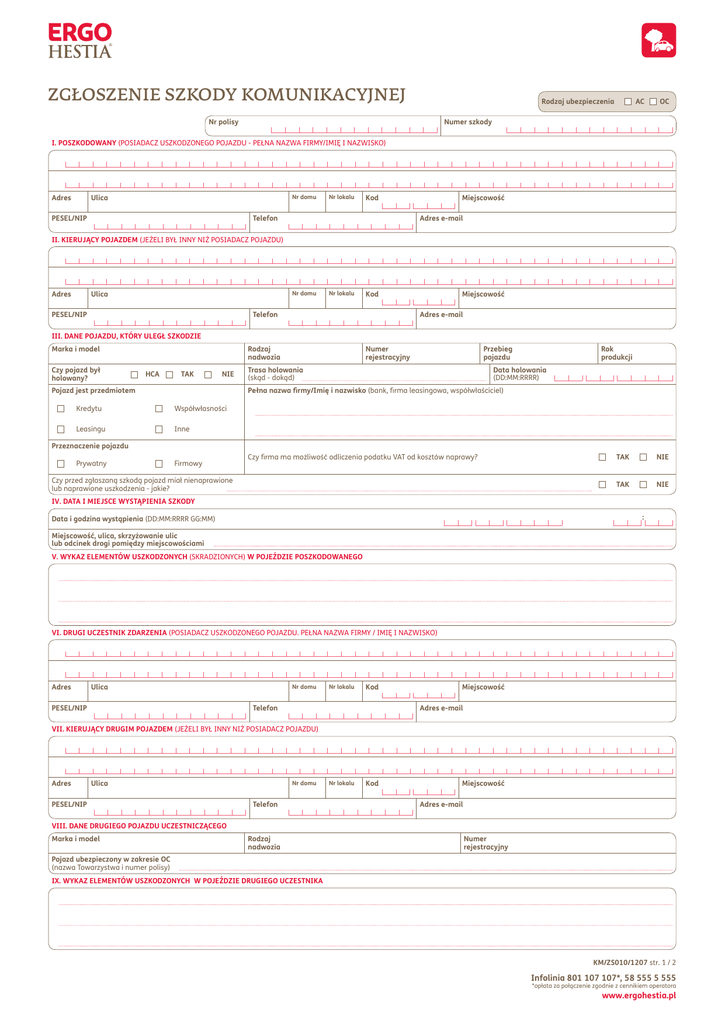 ZGŁOSZENIE SZKODY KOMUNIKACYJNEJ Rodzaj ubezpieczenia Nr polisy AC OC Numer szkody I. POSZKODOWANY (POSIADACZ USZKODZONEGO POJAZDU - PEŁNA NAZWA FIRMY/IMIĘ I NAZWISKO) Adres Ulica Nr domu PESEL/NIP Nr lokalu Kod Telefon Miejscowość Adres e-mail II. KIERUJĄCY POJAZDEM (JEŻELI BYŁ INNY NIŻ POSIADACZ POJAZDU) Adres Ulica Nr domu PESEL/NIP Nr lokalu Kod Telefon Miejscowość Adres e-mail III. DANE POJAZDU, KTÓRY ULEGŁ SZKODZIE Marka i model Czy pojazd był holowany? Rodzaj nadwozia HCA TAK NIE Pojazd jest przedmiotem Numer rejestracyjny Przebieg pojazdu Trasa holowania (skąd - dokąd) Rok produkcji Data holowania (DD:MM:RRRR) Pełna nazwa firmy/Imię i nazwisko (bank, firma leasingowa, współwłaściciel) Kredytu Współwłasności Leasingu Inne Przeznaczenie pojazdu Prywatny Firmowy Czy firma ma możliwość odliczenia podatku VAT od kosztów naprawy? Czy przed zgłaszaną szkodą pojazd miał nienaprawione lub naprawione uszkodzenia - jakie? TAK NIE TAK NIE IV. DATA I MIEJSCE WYSTĄPIENIA SZKODY : Data i godzina wystąpienia (DD:MM:RRRR GG:MM) Miejscowość, ulica, skrzyżowanie ulic lub odcinek drogi pomiędzy miejscowościami V. WYKAZ ELEMENTÓW USZKODZONYCH (SKRADZIONYCH) W POJEŹDZIE POSZKODOWANEGO VI. DRUGI UCZESTNIK ZDARZENIA (POSIADACZ USZKODZONEGO POJAZDU. PEŁNA NAZWA FIRMY / IMIĘ I NAZWISKO) Adres Ulica PESEL/NIP Nr domu Nr lokalu Kod Telefon Miejscowość Adres e-mail VII. KIERUJĄCY DRUGIM POJAZDEM (JEŻELI BYŁ INNY NIŻ POSIADACZ POJAZDU) Adres Ulica PESEL/NIP Nr domu Telefon Nr lokalu Kod Miejscowość Adres e-mail VIII. DANE DRUGIEGO POJAZDU UCZESTNICZĄCEGO Marka i model Rodzaj nadwozia Numer rejestracyjny Pojazd ubezpieczony w zakresie OC (nazwa Towarzystwa i numer polisy) IX. WYKAZ ELEMENTÓW USZKODZONYCH W POJEŹDZIE DRUGIEGO UCZESTNIKA KM/ZS010/1207 str. 1 / 2 Infolinia 801 107 107*, 58 555 5 555 *opłata za połączenie zgodnie z cennikiem operatora www.ergohestia.pl X. SZKODY POWSTAŁE POZA POJAZDEM (OSOBOWE I RZECZOWE) XI. POWIADOMIENIE POLICJI Czy o zdarzeniu powiadomiono policję? TAK NIE Nazwa, adres i telefon powiadomionej jednostki policji XII. ŚWIADKOWIE ZDARZENIA (IMIĘ I NAZWISKO, ADRES, TELEFON) XIII. SZCZEGÓŁOWY OPIS OKOLICZNOŚCI ZDARZENIA Kolizja: przyczyna, przebieg - zachowanie uczestników Kradzież - opis sposobu dokonania włamania, opis okoliczności w jakich pozostawiono pojazd oraz w jakich stwierdzono włamanie do pojazdu XIV. SZKIC SYTUACYJNY MIEJSCA ZDARZENIA Legenda 1 pojazd numer rejestracyjny 2 pojazd numer rejestracyjny 3 pojazd numer rejestracyjny ß kierunek jazdy XV. OŚWIADCZENIA (AKCEPTACJĘ TREŚCI PONIŻSZYCH OŚWIADCZEŃ NALEŻY POTWIERDZIĆ WPISUJĄC ZNAK „X” W ODPOWIEDNICH OKIENKACH) Oświadczam, że z tytułu zgłoszonej szkody nie otrzymałem odszkodowania z innego towarzystwa ubezpieczeń, jak również nie czynię starań, aby takie odszkodowanie uzyskać. Oświadczam, że gdyby dochodzenie prowadzone przez Sopockie Towarzystwo Ubezpieczeń Ergo Hestia SA wykazało, że zachodzą okoliczności wyłączające odpowiedzialność Ubezpieczyciela za przedmiotową szkodę lub nie potwierdziło podanych okoliczności lub rozmiaru szkody, zobowiązuję się zwrócić wypłacone odszkodowanie w terminie 14 dni od daty wezwania. Oświadczam, że kierujący pojazdem w momencie zdarzenia użytkował go za moją zgodą i wiedzą. Oświadczam, że prowadząc pojazd w chwili zdarzenia nie znajdowałem/am się w stanie pod wpływem alkoholu lub podobnie działających środków. Oświadczam, że uszkodzony pojazd był ubezpieczony w zakresie AC tylko w jednym zakładzie ubezpieczeń (dotyczy wyłącznie szkód z AC). Oświadczam, że wyrażam zgodę na prowadzenie korespondencji w sprawie zgłoszonej szkody za pośrednictwem poczty elektronicznej. ZGŁASZAJĄCY/KIERUJĄCY UDZIELIŁ POWYŻSZYCH INFORMACJI ZGODNIE Z PRAWDĄ I WEDŁUG NAJLEPSZEJ WIEDZY. Miejscowość Podpis zgłaszającego (czytelny) Podpis kierującego (czytelny) Data (DD:MM:RRRR) Dowód osobisty (seria i numer) Dowód osobisty (seria i numer) Potwierdzenie autentyczności podpisu Podpis i imienna pieczęć przyjmującego zgłoszenie XVI. OŚWIADCZENIE UBEZPIECZYCIELA Zgodnie z art. 24 ust.1 ustawy z dnia 29.08.1997r. o ochronie danych osobowych (t, jedn. Dz. U. Nr 101 z 2002 r., poz. 926 z późn. zmianami), Sopockie Towarzystwo Ubezpieczeń Ergo Hestia SA z siedzibą w Sopocie, przy ul. Hestii 1, informuje, że jest administratorem Pana/i danych osobowych, udostępnianych przez Pana/ią dobrowolnie na podstawie niniejszej zgody, które będą przez nas przetwarzane do celów marketingu bezpośredniego naszych własnych produktów (usług). Jednocześnie informujemy, iż służy Panu/i prawo wglądu do swoich danych osobowych oraz ich poprawiania, a przetwarzanie tych danych w celach innych niż wymienione powyżej inne cele prawnie usprawiedliwione lub statutowe naszego Towarzystwa albo osób trzecich, którym są przekazywane te dane - wymaga Pana/i uprzedniej zgody. KM/ZS010/1207 str. 2 / 2 Infolinia 801 107 107*, 58 555 5 555 *opłata za połączenie zgodnie z cennikiem operatora www.ergohestia.pl