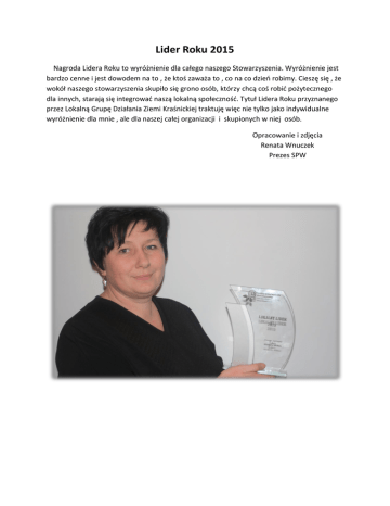 Lider Roku 2015 Nagroda Lidera Roku to wyróżnienie dla całego naszego Stowarzyszenia. Wyróżnienie jest bardzo cenne i jest dowodem na to , że ktoś zaważa to , co na co dzień robimy. Cieszę się , że wokół naszego stowarzyszenia skupiło się grono osób, którzy chcą coś robić pożytecznego dla innych, starają się integrować naszą lokalną społeczność. Tytuł Lidera Roku przyznanego przez Lokalną Grupę Działania Ziemi Kraśnickiej traktuję więc nie tylko jako indywidualne wyróżnienie dla mnie , ale dla naszej całej organizacji i skupionych w niej osób. Opracowanie i zdjęcia Renata Wnuczek Prezes SPW