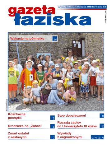 Nr Nr Nr 14-15 11 10(327) (326) (330-331) 15–30 1–151–31 czerwca sierpnia 2015 2015 Rok Rok15 15Cena Cena 22 zł zł 24 Fot. J. Pasierbek-Konieczny Wakacje na półmetku Kosztowne porządki 3 Kradzieże na „Żabce” Ruszają zapisy 4 do Uniwersytetu III wieku Zmarł ostatni z zesłanych Wywiady 7 z nagrodzonymi Stop dopalaczom! 11 15 17, 19, 20, 21 gazeta łaziska INFORMATOR NUMERY ALARMOWE Państwowa Straż Pożarna (998) 32 326 23 10 OSP Ł. Górne 32 224 21 20 OSP Ł. Średnie 32 224 21 22 OSP Ł. Dolne 32 224 21 21 Policja (997) 32 226 85 10 Straż Miejska (986) 32 224 44 71 POGOTOWIA Ratunkowe (999) 32 226 21 00 32 226 26 65 Centrum Medyczne 32 325 76 00 Gazowe (992) 32 227 31 24 Energetyczne (991) 32 303 21 55 Ciepłownicze 32 226 21 36 Wodno-kanalizacyjne 32 224 18 37 32 224 14 52 PGKiM 32 224 10 88 32 224 15 50 Punkt konsultacyjny Gminnej Komisji Rozwiązywania Problemów Alkoholowych 32 224 23 90 PRZYCHODNIE Proelmed (ul. Wyzwolenia 30)32 324 31 23 Przychodnia (ul. Staszica 4a)32 737 02 30 Przychodnia (ul. Chopina 17)32 736 76 70 32 736 76 55 APTEKI „Arnika” (os. Centrum 7) 32 224 38 39 „Novum” (ul. Dworcowa 10) 32 224 10 18 „Moja Apteka” (ul. Staszica 2/2) 32 736 80 90 „Moja Apteka” (ul. Barlickiego 2) 32 738 90 90 „Dbam o Zdrowie” (ul. Wiejska 13) 32 322 70 95 „Dbam o Zdrowie” (ul. Chopina 17) 32 736 76 37 INNE Urząd Miasta 32 324 80 00 Starostwo Powiatowe 32 324 81 00 MDK Ł. Górne 32 224 10 33 MDK Ł. Średnie 32 224 48 18 MDK Ł. Dolne 32 322 94 46 PiMBP (biblioteka) 32 224 14 12 Parafia Ł. Górne 32 224 10 13 Parafia Ł. Średnie 32 224 10 03 Parafia Ł. Dolne 32 224 18 42 MOSiR 32 221 11 38 ORS „Żabka” 32 322 93 82 Środowiskowy Dom 32 737 00 46 Samopomocy 698 639 036 OPS 32 326 23 40 32 326 23 42 SZKOŁY Szkoła Podstawowa nr 1 32 224 10 44 Szkoła Podstawowa nr 5 32 224 12 07 Szkoła Podstawowa nr 6 32 224 32 46 Gimnazjum nr 1 32 224 10 66 Gimnazjum nr 3 32 737 01 17 Zespół Szkół im. Piastów Śląskich 32 224 10 12 Zespół Szkół Energetycznych i Usługowych 32 224 24 15 2 1 - 31 sierpnia 2015 informator MDK zaprasza... …na kolejne zajęcia i wycieczki w ramach Akcji Lato. Przypominamy, że zajęcia na miejscu odbywają się w poniedziałki, wtorki, czwartki i piątki w godzinach 10.00–14.00. W środy zapraszamy na wycieczki: – 5 sierpnia – kino Cinema City w Katowicach, koszt 15 zł. – 12 sierpnia – Park Miniatur w Inwałdzie. Wyjazd o godz. 8.45, koszt 35 zł. – 19 sierpnia – Ogród Doświadczeń w Krakowie. Wyjazd o godz. 8.30, koszt 20 zł. – 26 sierpnia – Kopalnia Soli w Wieliczce. Zwiedzanie na trasie przygotowanej specjalnie dla dzieci, tzw. Solilandia. Wyjazd o godz. 9.00, koszt 40 zł. …27 września o godz. 16.00 do sali widowiskowej na występ kabaretu Nowaki. Bilety w cenie 45 i 40 zł do nabycia w sekretariacie MDK. Zapraszamy na wyjazdy Miejski Dom Kultury zaprasza na kolejne wyjazdy. W związku z bardzo dużym zainteresowaniem wyjazdem do Zoo i Afrykarium we Wrocławiu, odbędzie się kolejna taka wycieczka. Do stolicy Dolnego Śląska pojedziemy w czwartek 20 sierpnia. W programie: rejs statkiem po Odrze od Przystani Kardynalskiej do Przystani Zoo, wizyta w Afrykarium, powrót statkiem do Przystani Kardynalskiej, czas wolny w centrum. Wyjazd o godz. 8.00 z zatoczki przed MDK, powrót w godzinach wieczornych. Koszt – 80 zł. Dodatkowo płatny jest wstęp do Zoo i Afrykarium – emeryci i renciści 10 zł, bilet normalny 40 zł, ulgowy 30 zł. Zapisy i wpłaty przyjmowane są w sekretariacie MDK do 14 sierpnia. Kolejna propozycja to trzydniowy wyjazd na Węgry. Wycieczka zapla- nowana jest na pierwszy weekend września – od 4.09 do 6.09. Wyjazd z zatoczki przed MDK o godz. 6.00 . W programie zwiedzanie Egeru (możliwość skorzystania z basenów termalnych), znanej z węgierskich win Doliny Pięknej Pani i Doliny Tokaju. Koszt wyjazdu 90 euro i 180 zł. W cenie: 2 noclegi w hotelu Szent Istvan *** w Egerze, 2 śniadania, 1 obiadokolacja w restauracji hotelowej i 1 wieczorek węgierski w regionalnej czardzie Kulacs Csarda w Dolinie Pięknej Pani (3-daniowe regionalne menu, degustacja miejscowych win, muzyka i występy cygańskiej kapeli i tancerzy), usługa przewodnika, transport i ubezpieczenie. Dodatkowo płatne dla chętnych wejście do basenów termalnych. Zapisy i wpłaty przyjmowane są w sekretariacie MDK do 14 sierpnia. Dzień Pszczoły Odpust – na parkingu za MDK Stowarzyszenie „Batut”, w ramach projektu „Czary-mary z ekologią”, zaprasza 8 sierpnia w godz. 14.00–18.00 do Śląskiego Ogrodu Botanicznego na Dzień Pszczoły. W programie wykłady poruszające problematykę wymierania pszczół, korzyści płynące z zastosowania pożytecznych mikroorganizmów w gospodarce pasiecznej, wartość pszczelarska roślin miododajnych. Ponadto zaprzyjaźnieni pszczelarze zademonstrują żywy rój pszczół oraz ul pokazowy, będzie można skosztować różnego rodzaju miodów, ziołomiodów. Projekt jest dofinansowany ze środków Programu Fundusz Inicjatyw Obywatelskich. Wydział Mienia Komunalnego Urzędu Miejskiego w Łaziskach Górnych informuje, że w związku z budową ośrodka zdrowia, tegoroczny odpust parafialny w Parafii Matki Bożej Królowej Różańca Świętego w Łaziskach odbędzie się 4 października na parkingu za Miejskim Domem Kultury w Łaziskach Górnych przy ul. Świerczewskiego 2. Wnioski na rezerwacje miejsc pod ustawienie stanowisk handlowych, zgodnie z załącznikiem mapowym, można składać od 1 sierpnia do momentu wyczerpania miejsc. O rezerwacji miejsca decyduje kolejność składania wniosków. Urząd jest czynny od poniedziałku do piątku w godz. 7.30–15.30 (w poniedziałki do 17.00). W razie pytań prosimy o kontakt tel. 32 324 80 38. z życia miasta gazeta łaziska Znowu powiało… J w Łaziskach Średnich spadające na drogę drzewo zahaczyło o kable, co doprowadziło do przechylenia betonowego słupa energetycznego. Powalone drzewa 
