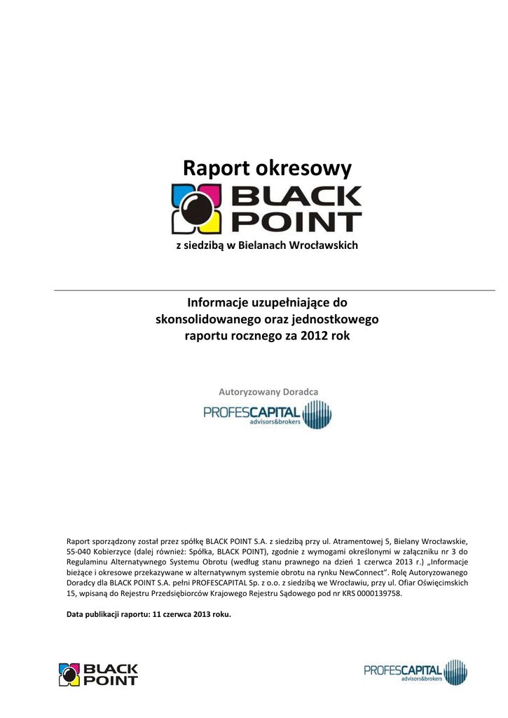Raport okresowy z siedzibą w Bielanach Wrocławskich Informacje uzupełniające do skonsolidowanego oraz jednostkowego raportu rocznego za 2012 rok Autoryzowany Doradca Raport sporządzony został przez spółkę BLACK POINT S.A. z siedzibą przy ul. Atramentowej 5, Bielany Wrocławskie, 55-040 Kobierzyce (dalej również: Spółka, BLACK POINT), zgodnie z wymogami określonymi w załączniku nr 3 do Regulaminu Alternatywnego Systemu Obrotu (według stanu prawnego na dzień 1 czerwca 2013 r.) „Informacje bieżące i okresowe przekazywane w alternatywnym systemie obrotu na rynku NewConnect”. Rolę Autoryzowanego Doradcy dla BLACK POINT S.A. pełni PROFESCAPITAL Sp. z o.o. z siedzibą we Wrocławiu, przy ul. Ofiar Oświęcimskich 15, wpisaną do Rejestru Przedsiębiorców Krajowego Rejestru Sądowego pod nr KRS 0000139758. Data publikacji raportu: 11 czerwca 2013 roku. Informacje uzupełniające do skonsolidowanego oraz jednostkowego raportu rocznego za 2012 rok Spis treści I. List Prezesa Zarządu BLACK POINT S.A. Pana Piotra Kolbusza do Akcjonariuszy i Inwestorów. ........................ 3 II. Oświadczenie Zarządu o prawidłowości danych ............................................................................................... 4 III. Oświadczenie Zarządu i wyborze biegłych rewidentów .................................................................................... 4 IV. Podstawowe informacje o Emitencie ............................................................................................................... 5 V. Opis organizacji grupy kapitałowej emitenta ze wskazaniem jednostek podlegających konsolidacji oraz opis zmian w organizacji grupy kapitałowej emitenta wraz z podaniem ich przyczyn. .................................................. 6 VI. Wybrane dane finansowe ................................................................................................................................ 8 1. Wybrane skonsolidowane dane finansowe .......................................................................................................... 8 2. Wybrane jednostkowe dane finansowe ............................................................................................................... 9 VII. Sprawozdanie z działalności Grupy Kapitałowej ............................................................................................. 10 1. Komentarz Zarządu Emitenta na temat czynników i zdarzeń, które miały wpływ na osiągnięte wyniki finansowe................................................................................................................................................................ 10 2. Charakterystyka struktury aktywów i pasywów skonsolidowanego bilansu. ..................................................... 11 3. Opis struktury głównych lokat kapitałowych lub głównych inwestycji kapitałowych dokonanych w ramach grupy kapitałowej emitenta w danym roku obrotowym. ....................................................................................... 12 4. Charakterystyka polityki w zakresie kierunków rozwoju grupy kapitałowej emitenta. ...................................... 12 5. Opis istotnych pozycji pozabilansowych w ujęciu podmiotowym, przedmiotowym i wartościowym. .............. 12 VIII. Oświadczenie na temat stosowanych zasad ładu korporacyjnego. ......................................................... 13 Strona 2 z 14 Autoryzowany Doradca Informacje uzupełniające do skonsolidowanego oraz jednostkowego raportu rocznego za 2012 rok I. List Prezesa Zarządu BLACK POINT S.A. Pana Piotra Kolbusza do Akcjonariuszy i Inwestorów. Szanowni Akcjonariusze i Inwestorzy, W imieniu Zarządu Black Point S.A. przedstawiam Państwu kolejny Raport Roczny Grupy Black Point. Miniony rok był dla Grupy Black Point niezwykle istotny. Zapisze się on w naszej historii, jako ten, w którym zakończone zostało jedno z najważniejszych przedsięwzięć w dotychczasowej działalności Spółki - strategiczny alians z krakowskim dystrybutorem IT oraz właścicielem jednej z bardziej znanych w Polsce marek Printé - spółką SCOT. Dzięki tej inwestycji Black Point zdywersyfikował znacząco swoje portfolio produktowe, i stał się po raz kolejny promotorem odważnych idei biznesowych. W 2012 roku program inwestycyjny objął także park maszynowy i procesy technologiczne, dzięki którym Black Point zapewnia, że nie tylko sprosta celom wyznaczonym w strategii, lecz także – za sprawą silnych fundamentów – będzie się dalej intensywnie rozwijał. W chwili obecnej tworzymy silną Grupę Kapitałową, o solidnych fundamentach, precyzyjnych celach oraz spójnej i konsekwentnie realizowanej strategii, a najważniejsze wyzwanie, jakie stoi przed Grupą to uzyskanie pozytywnych efektów konsolidacji ze spółką SCOT - wzrost zysków i wartości rynkowej spółek wchodzących w skład Grupy Kapitałowej Black Point, a także rozwój podstawowej działalności każdej ze spółek Grupy. Rozwój Black Point upatrujemy także w rozszerzeniu oferty produktowej, jak i zwiększeniu zasięgu dystrybucji w kraju i zagranicą. Zarząd dołoży wszelkich starań, aby wypracowanie efektywnego modelu zarządzania, optymalizacja i restrukturyzacja kosztowa, a także zmiany technologiczne i organizacyjne produkcji oraz skuteczna sprzedaż produktów marek własnych przełożyły się w kolejnych okresach rozliczeniowych na pozytywny wynik finansowy. Wierzymy, iż potencjał Grupy Black Point przyczyni się do dalszego rozwoju i generowania zysków Zapraszamy do lektury niniejszego raportu, gdzie bardziej szczegółowo zaprezentujemy osiągnięcia, inwestycje oraz plany rozwojowe Grupy Kapitałowej Black Point. Piotr Kolbusz Prezes Zarządu BLACK POINT S.A. Strona 3 z 14 Autoryzowany Doradca Informacje uzupełniające do skonsolidowanego oraz jednostkowego raportu rocznego za 2012 rok II. Oświadczenie Zarządu o prawidłowości danych Za