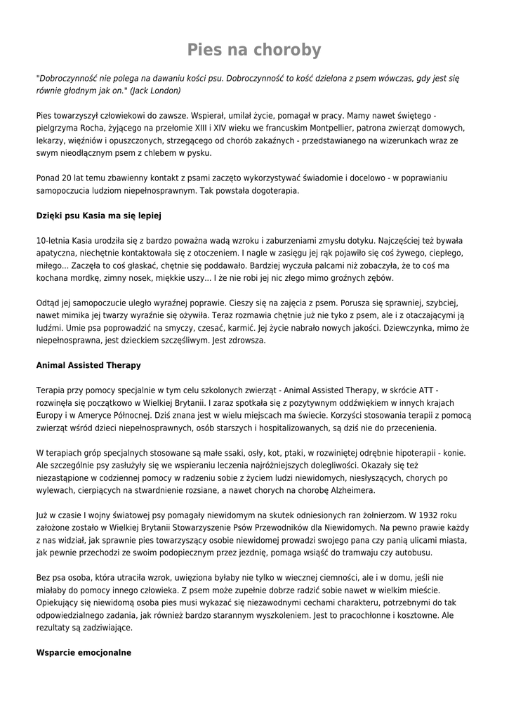Pies na choroby "Dobroczynność nie polega na dawaniu kości psu. Dobroczynność to kość dzielona z psem wówczas, gdy jest się równie głodnym jak on." (Jack London) Pies towarzyszył człowiekowi do zawsze. Wspierał, umilał życie, pomagał w pracy. Mamy nawet świętego pielgrzyma Rocha, żyjącego na przełomie XIII i XIV wieku we francuskim Montpellier, patrona zwierząt domowych, lekarzy, więźniów i opuszczonych, strzegącego od chorób zakaźnych - przedstawianego na wizerunkach wraz ze swym nieodłącznym psem z chlebem w pysku. Ponad 20 lat temu zbawienny kontakt z psami zaczęto wykorzystywać świadomie i docelowo - w poprawianiu samopoczucia ludziom niepełnosprawnym. Tak powstała dogoterapia. Dzięki psu Kasia ma się lepiej 10-letnia Kasia urodziła się z bardzo poważna wadą wzroku i zaburzeniami zmysłu dotyku. Najczęściej też bywała apatyczna, niechętnie kontaktowała się z otoczeniem. I nagle w zasięgu jej rąk pojawiło się coś żywego, ciepłego, miłego... Zaczęła to coś głaskać, chętnie się poddawało. Bardziej wyczuła palcami niż zobaczyła, że to coś ma kochana mordkę, zimny nosek, miękkie uszy... I że nie robi jej nic złego mimo groźnych zębów. Odtąd jej samopoczucie uległo wyraźnej poprawie. Cieszy się na zajęcia z psem. Porusza się sprawniej, szybciej, nawet mimika jej twarzy wyraźnie się ożywiła. Teraz rozmawia chętnie już nie tyko z psem, ale i z otaczającymi ją ludźmi. Umie psa poprowadzić na smyczy, czesać, karmić. Jej życie nabrało nowych jakości. Dziewczynka, mimo że niepełnosprawna, jest dzieckiem szczęśliwym. Jest zdrowsza. Animal Assisted Therapy Terapia przy pomocy specjalnie w tym celu szkolonych zwierząt - Animal Assisted Therapy, w skrócie ATT rozwinęła się początkowo w Wielkiej Brytanii. I zaraz spotkała się z pozytywnym oddźwiękiem w innych krajach Europy i w Ameryce Północnej. Dziś znana jest w wielu miejscach ma świecie. Korzyści stosowania terapii z pomocą zwierząt wśród dzieci niepełnosprawnych, osób starszych i hospitalizowanych, są dziś nie do przecenienia. W terapiach gróp specjalnych stosowane są małe ssaki, osły, kot, ptaki, w rozwiniętej odrębnie hipoterapii - konie. Ale szczególnie psy zasłużyły się we wspieraniu leczenia najróżniejszych dolegliwości. Okazały się też niezastąpione w codziennej pomocy w radzeniu sobie z życiem ludzi niewidomych, niesłyszących, chorych po wylewach, cierpiących na stwardnienie rozsiane, a nawet chorych na chorobę Alzheimera. Już w czasie I wojny światowej psy pomagały niewidomym na skutek odniesionych ran żołnierzom. W 1932 roku założone zostało w Wielkiej Brytanii Stowarzyszenie Psów Przewodników dla Niewidomych. Na pewno prawie każdy z nas widział, jak sprawnie pies towarzyszący osobie niewidomej prowadzi swojego pana czy panią ulicami miasta, jak pewnie przechodzi ze swoim podopiecznym przez jezdnię, pomaga wsiąść do tramwaju czy autobusu. Bez psa osoba, która utraciła wzrok, uwięziona byłaby nie tylko w wiecznej ciemności, ale i w domu, jeśli nie miałaby do pomocy innego człowieka. Z psem może zupełnie dobrze radzić sobie nawet w wielkim mieście. Opiekujący się niewidomą osoba pies musi wykazać się niezawodnymi cechami charakteru, potrzebnymi do tak odpowiedzialnego zadania, jak również bardzo starannym wyszkoleniem. Jest to pracochłonne i kosztowne. Ale rezultaty są zadziwiające. Wsparcie emocjonalne Wkrótce tez zauważono, że psy można wyszkolić do wielu innych tego typu zadań. Zaczęto baczniej obserwować szkolone zwierzęta, stosować coraz to nowe techniki szkolenia. Niedawno udało się zaobserwować, że niektóre psy potrafią rozpoznać wczesne sygnały ataków epilepsji, a także nadchodzący kryzys w chorobie cukrzycowej. Stały się one znane jako Psy Alarmujące Medycznie. Dziś psy pomagają ponadto osobom z zanikiem mięśni, artretyzmem, defektami neurologicznymi po mniej lub bardziej ciężkich uszkodzeniach mózgu i rdzenia kręgowego. Co takiego robią? Mogą odszukać i podawać osobie chorej wskazane (lub nazwane) przedmioty, potrafią otwierać i zamykać drzwi i szuflady, zapalić i gasić światło, ale przede wszystkim potrafią sprowadzić pomoc, gdy chory nieszczęśliwie upadnie lub zostanie unieruchomiony. Potrafią też pomagać przy poruszaniu się i zachowaniu równowagi. Ale najważniejsze w tym wszystkim jest podświadome wsparcie emocjonalne. Chory nie musi się obawiać, że znajdzie się w beznadziejnej sytuacji i będzie musiał czekać na przypadkową pomoc, która nadejść może, ale nie musi. Takie wyobrażenie jest największym koszmarem dla ludzi dotkniętych niepełnosprawnością ruchową. Założycielką odpowiedniej organizacji Psy dla Niepełnosprawnych (Dogs for the Disabled) w roku 1988 była nieżyjąca już chora na raka Frances Hay z hrabstwa Warwickshire w Wielkiej Brytanii. Po stracie nogi poruszała się za pomocą protezy. Wyszkoliła swojego psa tak, że stawiał się na każde jej wezwanie i pomagał w zachowaniu równowagi ciała. Z czasem jej funkcja rozrosła się i obecnie rokrocznie centra szkolenia psów dla niepełnosprawnych opuszcza kilkadziesiąt zwierząt rocznie. Psy starsze, "emerytowane", które już nie są w stanie wykonywać swoich obowiązków i same potrzebują opieki, najczęściej zostają ze swoimi właścicielami lub ich rodziną czy przyjaciółmi. Fundacja Przyjaźni Ludzi i Zwierząt W Polsce terapia przy pomocy zwierząt nazywa się animoterapią, a z pomocą psów - dogoterapią. Nazwę "dogoterapia" zaproponowała pani Maria Czerwińska, założycielka Fundacji Przyjaźni Ludzi i Zwierząt CZE-NE-KA, której głównym zadaniem jest upowszechnianie dogoterapii jako metody w wybranych schorzeniach dzieci i młodzieży, przygotowywanie dzieci, młodzieży i dorosłych w zawodach specjalnych, prowadzenie i finansowanie innych wspomagających metod leczenia, takic