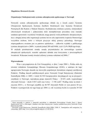 Magdalena Mosionek-Szweda Organizacja i funkcjonowanie systemu zabezpieczenia społecznego w Norwegii Norweski system zabezpieczenia społecznego składa się z trzech części: Systemu Ubezpieczeń Społecznych, Systemu Zasiłków Rodzinnych oraz Systemu Świadczeń Pieniężnych dla Rodzin z Małymi Dziećmi. Rozbudowana struktura systemu, różnorodność oferowanych świadczeń i jednocześnie dość skomplikowane procedury oraz warunki ustalania uprawnień i wysokości świadczeń, mogą sprawić wiele problemów ubezpieczonym, lecz z drugiej strony taka organizacja systemu ma na celu zapewnienie wsparcia finansowego wszystkim osobom, które z różnych przyczyn takiej pomocy potrzebują. Norwegia nieprzypadkowo uważana jest za państwo opiekuńcze – całkowite wydatki z publicznego systemu ubezpieczeń w 2009 r. wyniosły ponad 289 mld NOK, czyli 12,4% PKB tego kraju. W artykule przedstawione zostały zasady przynależności do norweskiego systemu ubezpieczeń społecznych, warunki opłacania składek oraz korzystania z poszczególnych świadczeń. Wskazane zostały również reformy systemu wdrażane od 2006 r.1 Wprowadzenie Wraz z przystąpieniem do Unii Europejskiej, w dniu 1 maja 2004 r., Polska stała się również członkiem Europejskiego Obszaru Gospodarczego (EOG), a należąca do tego ugrupowania Norwegia okazała się niezwykle popularnym kierunkiem migracji zarobkowej Polaków. Według danych publikowanych przez Norweski Urząd Statystyczny (Statistisk Sentralbyrås SSB), w 2009 r. wśród 36 530 Europejczyków decydujących się na przyjazd i osiedlenie w Norwegii, największą grupę stanowili Polacy – 10 451 osób, wyprzedzając obywateli Szwecji – około 6 033 osób oraz Litwy – 3 196 osób2. Według stanu na dzień 1 stycznia 2010 r., w Norwegii osiedliło się 46 707 obywateli Polski (w tym prawie 44 tys. Polaków wyemigrowało do tego kraju po 2004 r.), rok wcześniej liczba ta wynosiła 39 168 1 Praca powstała w oparciu o materiały pozyskane w oddziałach Norweskiego Urzędu Pracy i Spraw Społecznych NAV w Stavanger i Sandnes oraz dane statystyczne i analizy publikowane przez Norweski Urząd Statystyczny SSB. 2 Norweski Urząd Statytyczny, Statistisk Sentralbyrås (dalej SSB), Table 9, Immigration and emigration, by citizenship, 2009; http://www.ssb.no/english/subjects/ (13.09.2010). 1 osób3. Głównym powodem migracji było podjęcie zatrudnienia – wśród prawie 40 tys. Polaków mieszkających w 2009 r. w Norwegii, legalnie zatrudnionych było 30 110 osób4. Według statystyk podawanych przez polskie władze, liczba polskich pracowników w Norwegii jest znacznie wyższa od oficjalnych statystyk norweskich i może oscylować nawet w granicach 80 000 – 120 000 osób5. Rozbieżności te wynikają z przyjętej metodologii: dane publikowane przez Norweski Urząd Statystyczny nie obejmują polskich pracowników sezonowych, Polaków zatrudnionych w polskich firmach, zarejestrowanych na terenie Polski, wykonujących usługi w Norwegii, czy też świadczących usługi z terytorium innych państw (szczególnie Szwecji). Ponadto, nadal wielu Polaków nie rejestruje swojego pobytu i pracy w tym kraju (według szacunków norweskiej Inspekcji Pracy to blisko 50 tys. osób). Bez względu na źródło, przytaczane powyżej statystyki potwierdzają, że Norwegia stała się popularnym wśród Polaków kierunkiem migracji zarobkowej, zwłaszcza po 2007 r., kiedy nastąpił proces reemigracji polskich pracowników zatrudnionych dotychczas w Wielkiej Brytanii i Irlandii – gdzie wskutek kryzysu gospodarczego i finansowego pogorszyły się warunki na rynku pracy. Aktywność zawodowa wiąże się z koniecznością uczestnictwa w systemie ubezpieczeń społecznych. Biorąc pod uwagę coraz większe zainteresowanie Polaków norweskim rynkiem pracy, warto przedstawić zasady organizacji i funkcjonowania tego systemu w Norwegii – kraju uważanym powszechnie za państwo opiekuńcze, z rozbudowanym systemem opieki socjalnej. W artykule przedstawione zostały zasady przynależności do norweskiego systemu ubezpieczeń społecznych, warunki opłacania składek oraz korzystania z poszczególnych świadczeń. Wskazane zostały również reformy tego systemu, wdrażane od 2006 r. Praca powstała w oparciu o materiały pozyskane w oddziałach Norweskiego Urzędu Pracy i Spraw Społecznych NAV w Stavanger i Sandnes, dane statystyczne oraz analizy opracowane przez Norweski Urząd Statystyczny SSB, jak również informacje publikowane przez polskie Ministerstwo Pracy i Polityki Społecznej. 3 SSB, Table 33, Foreign citizens, by citizenship per 1 January 1975-2010; http://www.ssb.no/english/subjects/ (13.09.2010). 4 SSB, Table 9, Employed immigrants, by selected countries of birth and sex. Absolute figures and in per cent of persons aged 15-74 years within each group Q4 2009; http://www.ssb.no/innvregsys_en/ (13.09.2010). 5 Informacja w sprawie zatrudnienia obywateli polskich w państwach Europejskiego Obszaru Gospodarczego i Szwajcarii oraz obywateli państw EOG w Polsce, Ministerstwo Pracy i Polityki Społecznej, Departament Rynku Pracy, Warszawa, maj 2010, s. 26. 2 1. Organizacja norweskiego systemu zabezpieczenia społecznego Zaangażowanie państwa norweskiego w organizację zabezpieczenia socjalnego ludności rozpoczęło się, podobnie jak w większości krajów europejskich, dopiero w XVIII wieku. Do tego czasu, przez stulecia, aż do rewolucji przemysłowej, zabezpieczenie materialne osób starszych i biednych zapewniały ich rodziny, kościół oraz gminy. Rozwój opieki społecznej i państwowego ubezpieczenia jest ściśle związany z procesem industrializacji. W okresie „wielkiej rewolucji przemysłowej” w całej Europie zaczęły powstawać zmechanizowane fabryki zatrudniające rzesze najemnych robotników. Wykonywana przez nich praca charakteryzowała się dużą wypadkowością, przy czym uzyskiwane dochody były na tyle niskie, że indywidualne oszczędzan