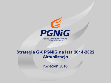 Strategia GK PGNiG na lata 2014-2022 Aktualizacja Kwiecień 2016 Agenda I Podsumowanie aktualizacji Strategii II Dotychczasowa sytuacja GK PGNiG III Kluczowe wyzwania stojące przed GK PGNiG IV Misja, wizja, cel nadrzędny oraz cele strategiczne V Filary Strategii GK PGNiG na lata 2014-2022 VI Inicjatywy operacyjne Strategii GK PGNiG na lata 2014-2022 VII Kluczowe aspiracje strategiczne 2 I. Podsumowanie aktualizacji Strategii W związku z istotnymi wahaniami cen ropy naftowej na światowych rynkach wystąpiła potrzeba przeprowadzenia przeglądu i aktualizacji dotychczas realizowanej Strategii: Przyczyny aktualizacji Strategii W drugiej połowie 2014 roku cena ropy naftowej spadła z poziomu ~105 USD/baryłkę do ~55 USD/baryłkę; Po początkowym odbiciu w 2 kwartale 2015 roku do ~65 USD/baryłkę, cena ropy na koniec 2015 roku spadła do poziomu ~30 USD/baryłkę. W wyniku przeprowadzonego przeglądu Strategii oraz weryfikacji dotychczasowych założeń, aktualizacja objęła następujące aspekty: aktualizację założeń makroekonomicznych (m.in. ceny ropy naftowej, gazu ziemnego i energii elektrycznej, kursy walutowe); Kluczowe założenia poddane aktualizacji aktualizację założeń rynkowych i operacyjnych, m.in.: ─ bilans gazu; ─ wolumen gazu przetransportowanego przez sieć dystrybucyjną; ─ wysokość nakładów inwestycyjnych w segmencie Wytwarzanie. zmianę ambicji strategicznych poprzez: ─ modyfikację istniejących inicjatyw operacyjnych; ─ wprowadzenie nowych inicjatyw operacyjnych. 3 II. Dotychczasowa sytuacja GK PGNiG Dotychczas pozycja rynkowa i finansowa Grupy była stabilna Stabilizacja wyników finansowych Bardzo niski poziom zadłużenia Wynik EBITDA: 5,6 mld PLN w 2013 r., 6,3 mld PLN w 2014 r., 6,1 mld PLN w 2015 r. Wynik EBITDA generowany głównie przez segment Poszukiwanie i Wydobycie oraz segment Dystrybucja. Niski poziom zadłużenia – na koniec 2015 r. wskaźnik dług netto / EBITDA ~0,02. Zagwarantowany dostęp do długoterminowych źródeł finansowania (dostępne programy na 14,7 mld PLN, w tym 9,7 mld PLN gwarantowane). Niekwestionowany lider produkcji gazu ziemnego oraz ropy naftowej w Polsce. Aktywny gracz na rynku wydobycia gazu ziemnego i ropy naftowej w Norwegii. Zdywersyfikowane przychody Grupy Główny importer gazu do Polski (ok. 9,3 mld m3 w 2015 r.). Największy producent ciepła oraz ósmy producent energii elektrycznej w Polsce pod względem wyprodukowanego wolumenu. Właściciel sieci dystrybucji gazu ziemnego oraz podziemnych magazynów gazu. ! 4 Dotychczasowa sytuacja finansowa i rynkowa Grupy Kapitałowej PGNiG była stabilna Jednakże w kolejnych latach stoi przed Grupą szereg wyzwań natury rynkowej i regulacyjnej, co bez realizacji założeń strategicznych może skutkować istotnym pogorszeniem EBITDA III. Kluczowe wyzwania stojące przed GK PGNiG (1/2) Kluczowe zmiany Potencjalne implikacje Radykalny spadek cen ropy naftowej – w latach 2014 – 2015 cena ropy brent spadła o ~70%. Główne implikacje zmian cen ropy naftowej: − niższy koszt pozyskania gazu w ramach kontraktów długoterminowych, co zwiększa atrakcyjność importu; Zmiany w otoczeniu rynkowym − niższa ekonomika zagranicznych projektów upstream z większym udziałem ropy w strukturze zasobów, a w konsekwencji niższa wycena zagranicznego segmentu poszukiwań i wydobycia. Zmianom na krajowym rynku gazu towarzyszy gwałtowny spadek cen gazu na rynkach europejskich. Ponadto od kilku lat pogłębia się na tych rynkach tendencja „odklejenia” rynkowych cen gazu od cen produktów ropopochodnych. W latach 2014 – 2015 spadki rynkowych cen gazu w dostawach spotowych w Niemczech oraz na innych rynkach europejskich przekroczyły 40%[1], co gwałtownie zwiększyło atrakcyjność cenową importu do Polski w stosunku do taryfy PGNiG. W chwili obecnej otoczenie regulacyjne, w którym działa Grupa ulega istotnym negatywnym zmianom, w szczególności w następujących obszarach: Zmiany w otoczeniu regulacyjnym ‒ opodatkowanie wydobycia węglowodorów, ‒ system koncesjonowania działalności upstream, ‒ obligo giełdowe, ‒ niepewność dotycząca modelu wsparcia kogeneracji gazowej, co w efekcie wpłynie na obniżenie przychodów z segmentów działalności Grupy. 5 [1] W oparciu o notowania spot TTF. III. Kluczowe wyzwania stojące przed GK PGNiG (2/2) Kluczowe zmiany Potencjalne implikacje W wyniku wprowadzenia tzw. „obliga giełdowego”, PGNiG SA jest zobowiązane sprzedawać nie mniej niż 55%[1] gazu ziemnego wysokometanowego na giełdach towarowych lub innym rynku regulowanym. Liberalizacja rynku gazu w Polsce Proces liberalizacji rynku połączony z wprowadzeniem obliga giełdowego niesie ryzyko utraty istotnej części klientów i ograniczenia przychodów z segmentu magazynowania. Decyzja UOKiK (31.12.2013 r.) nakazuje liberalizację umów z klientami w zakresie wielkości mocy umownej i ilości paliwa na dany rok gazowy oraz procedury zmiany sprzedawcy. Obecny portfel pozyskania gazu GK PGNiG zakłada pokrycie całego popytu na gaz w Polsce. Konieczność zmiany struktury portfela zakupu gazu z importu Biorąc pod uwagę ryzyko dalszej utraty części rynku przez GK PGNiG oraz niewystarczające zdywersyfikowanie istnieje ryzyko niezbilansowania portfela Grupy. Dodatkowo, portfel pozyskania gazu GK PGNiG składa się w istotnej części z kontraktów, w których cena opiera się o notowania produktów ropopochodnych (kontrakt jamalski i katarski). Zróżnicowanie formuł cenowych PGNiG SA oraz jego konkurentów niesie za sobą ryzyko presji cenowej. 6 [1] W 2014 r. obligo giełdowe wynosiło 40%. Pułap 55% zaczął obowiązywać od 2015 r. IV. Misja, wizja, cel nadrzędny oraz cele strategiczne Nowa wizja strategiczna GK PGNiG odpowiedzią na wyzwania W wyniku przeprowadzonego przeglądu Strategii GK PGNiG na lata 2014-2022 została zaktualizowana wizja GK PGNiG oraz cel nadrzędny Misja Wizja Cel nadrzędny Wzrost wartości PGNiG w o