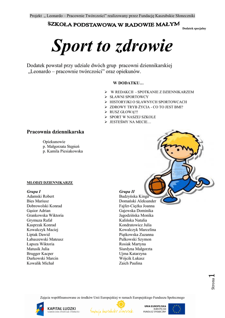 Projekt „ Leonardo – Pracownie Twórczości” realizowany przez Fundację Kaszubskie Słoneczniki Dodatek specjalny Sport to zdrowie Dodatek powstał przy udziale dwóch grup pracowni dziennikarskiej „Leonardo – pracownie twórczości” oraz opiekunów. W DODATKU… W REDAKCJI - SPOTKANIE Z DZIENNIKARZEM SŁAWNI SPORTOWCY HISTORYJKI O SŁAWNYCH SPORTOWCACH ZDROWY TRYB ŻYCIA - CO TO JEST BMI? RUSZ GŁOWĄ!!! SPORT W NASZEJ SZKOLE JESTEŚMY NA MECIE… Pracownia dziennikarska Opiekunowie p. Małgorzata Stępień p. Kamila Piesiakowska MŁODZI DZIENNIKARZE Grupa II Budzyńska Kinga Domański Aleksander Fajfer-Ciężka Joanna Gajewska Dominika Jagodzińska Monika Kalińska Natalia Kondratowicz Julia Kowalczyk Marcelina Piątkowska Zuzanna Pulkowski Szymon Rosiak Martyna Siurdyna Małgorzta Ujma Katarzyna Wójcik Łukasz Zaich Paulina Strona 1 Grupa I Adamski Robert Bies Mariusz Dobrowolski Konrad Gąsior Adrian Grankowska Wiktoria Grymuza Rafał Kasprzak Konrad Kowalczyk Maciej Liptak Dawid Łabaszewski Mateusz Łapsza Wiktoria Matusik Julia Brugger Kacper Durkowski Marcin Kowalik Michał Zajęcia współfinansowane ze środków Unii Europejskiej w ramach Europejskiego Funduszu Społecznego Projekt „ Leonardo – Pracownie Twórczości” realizowany przez Fundację Kaszubskie Słoneczniki W redakcji – spotkanie z dziennikarzem 19 maja odbyły się warsztaty w Pracowni Dziennikarstwa w ramach projektu „Leonardo – Pracownie Twórczości”. Tego dnia odwiedził nas nietypowy gość, dziennikarz gazety lokalnej, „Nowego tygodnika łobeskiego”, pan Zdzisław Kryżyn, który opowiedział o swojej pracy. Na początek otrzymaliśmy kilka egzemplarzy tygodnika. Dowiedzieliśmy się, m. in. jak zbudowana jest gazeta, jak napisać artykuł, który zaciekawi czytelników oraz jak go poprawnie zredagować. Dziennikarz opowiedział, jak wygląda redakcja, gdzie drukowana jest gazeta oraz jak wygląda drukarnia. Rozmawialiśmy także o narzędziach, jakimi posługuje się dziennikarz. Na koniec pan redaktor został zasypany lawiną pytań, które dotyczyły różnych sfer pracy dziennikarza. Spotkanie było bardzo interesujące i uświadomiło nam, jak trudna jest praca dziennikarza. Strona 2 Adrianna Bujnowska i Julia Kondratowicz Zajęcia współfinansowane ze środków Unii Europejskiej w ramach Europejskiego Funduszu Społecznego Projekt „ Leonardo – Pracownie Twórczości” realizowany przez Fundację Kaszubskie Słoneczniki SŁAWNI SPORTOWCY Na kolejnym naszym spotkaniu rozmawialiśmy o sławnych sportowcach. Na początku zajęć Rafał Grymuza poproszony został o zaznaczenie, z zamkniętymi oczami, dwunastu wyrazów w artykule z gazety. Wyrazy zostały zapisane na tablicy. Następnie w grupach układaliśmy krótką historię o sławnym sportowcu. W opowiadaniu musieliśmy zawrzeć dwanaście wypisanych wyrazów. Lider przedstawił efekty pracy swojej grupy. Dzięki tym warsztatom mieliśmy okazję poznać sławnych sportowców. Strona 3 Julia Matusik Zajęcia współfinansowane ze środków Unii Europejskiej w ramach Europejskiego Funduszu Społecznego Projekt „ Leonardo – Pracownie Twórczości” realizowany przez Fundację Kaszubskie Słoneczniki HISTORYJKI O SŁAWNYCH SPORTOWCACH Zawodnik Cristiano Ronaldo przygotowuje się do Mundialu w Brazylii. Studiował triki i sztuczki, aby spróbować sięgnąć po Puchar Świata. Wszyscy wierzą w Ronaldo, że jego kraj zwycięży w Mundialu. Na pewno będzie się starał na wszystkich meczach w Brazylii. Sport to jego pasja, musi uwierzyć w siebie, aby Odpowiedzialność zwyciężyć trenera w Mundialu. Reprezentacji Portugalii jest także ogromna. Jego praca z piłkarzami jest niesamowita. Wszystko spoczywa w jego rękach. Niestety Polska nie bierze udziału w zawodach. Zawodnik Neymar Jr. przygotowuje się do meczu. Stanie oko w oko z najlepszym piłkarzem świata, Crystiano Ronaldo. Neymar Jr. na pewno studiował sport. Wszyscy kibice go podziwiają. Neymar Jr. jest odpowiedzialnym kapitanem Brazylii. Zna wszystkie triki. Stara się być lepszym piłkarzem niż Ronaldo. Jego praca to gra w piłkę. Kilka lat temu wygrał z Polską. Musi pilnować się, żeby nie otrzymał czerwonej kartki. To wszystko zawdzięcza trenerowi. Strona 4 Adrian Gąsior, Mariusz Bies Zajęcia współfinansowane ze środków Unii Europejskiej w ramach Europejskiego Funduszu Społecznego Projekt „ Leonardo – Pracownie Twórczości” realizowany przez Fundację Kaszubskie Słoneczniki Zlatan Ibrahimović Zlatan Ibrahimović przygotowuje się do meczu. Na pewno studiował wszyskie zagrania wszyskich piłkarzy świata. Jest odpowiedzialnym kapitanem w Paris Saint Germain. Stara się grać najlepiej ze wszystkich zawodników w swojej drużynie. Musi trenować do meczu z Polską. Lubi uprawiać sport. Wszyscy liczymy, że kiedyś będzie mistrzem świata w piłce nożnej. Bardzo dużo zarabia w swojej pracy. Gra w reprezentacji Szwecji. Konrad Kasprzak, Mateusz Łabaszewski Agnieszka Radwańska jest polską zawodniczką. Przygotowuje się do zawodów gry w tenisa. Stara się je wygrać. Na pewno musiała dużo trenować i chodzić na studia. Stara się grać o wszystko. Musi grać odpowiedzialnie i pracować wytrwale. Jej hobby to sport. Wszyscy trzymają za nią kciuki. Julia Matusik, Wiktoria Łapsza, Wiktoria Grankowska Strona 5 Zawodnik klubu FC Barcelony Lionel Messi przygotowuje się do turnieju ligi hiszpańskiej . Bardzo stara się, aby wszystko poszło jak najlepiej. Zapewniał nas, że na pewno wygrają. Musi tylko pokonać Real Madryt. Jego trener mówi, że jest bardzo odpowiedzialny, angażuje się w sport. Musi tylko ukończyć studia w Polsce, wszyscy na to liczą. Zajęcia współfinansowane ze środków Unii Europejskiej w ramach Europejskiego Funduszu Społecznego Projekt „ Leonardo – Pracownie Twórczości” realizowany przez Fundację Kaszubskie Słoneczniki Co to jest BMI? Wskaźnik masy ciała (BMI) jest obecnie
