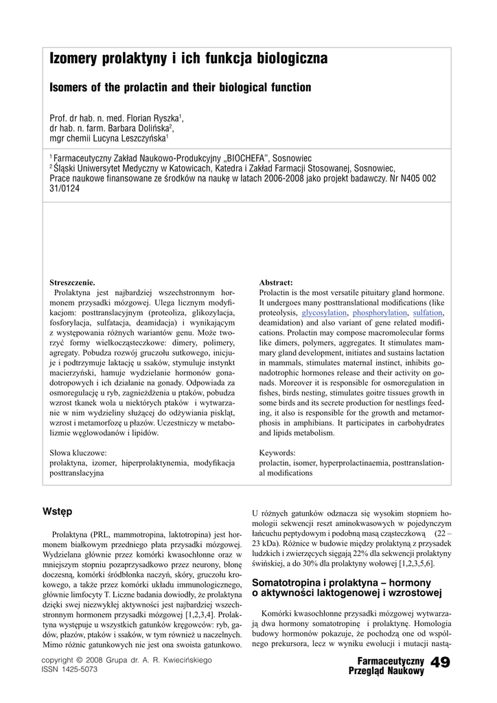 )ZOMERYPROLAKTYNYIICHFUNKCJABIOLOGICZNA )SOMERSOFTHEPROLACTINANDTHEIRBIOLOGICALFUNCTION 0ROFDRHABNMED&LORIAN2YSZKA DRHABNFARM"ARBARA$OLIÊSKA MGRCHEMII,UCYNA,ESZCZYÊSKA &ARMACEUTYCZNY:AKAD.AUKOWO0RODUKCYJNY`")/#(%&!n3OSNOWIEC gLSKI5NIWERSYTET-EDYCZNYW+ATOWICACH+ATEDRAI:AKAD&ARMACJI3TOSOWANEJ3OSNOWIEC 0RACENAUKOWEFINANSOWANEZEuRODKÌWNANAUKÃWLATACHJAKOPROJEKTBADAWCZY.R. Streszczenie. Prolaktyna jest najbardziej wszechstronnym hormonem przysadki mózgowej. Ulega licznym modyfikacjom: posttranslacyjnym (proteoliza, glikozylacja, fosforylacja, sulfatacja, deamidacja) i wynikającym z występowania różnych wariantów genu. Może tworzyć formy wielkocząsteczkowe: dimery, polimery, agregaty. Pobudza rozwój gruczołu sutkowego, inicjuje i podtrzymuje laktację u ssaków, stymuluje instynkt macierzyński, hamuje wydzielanie hormonów gonadotropowych i ich działanie na gonady. Odpowiada za osmoregulację u ryb, zagnieżdżenia u ptaków, pobudza wzrost tkanek wola u niektórych ptaków i wytwarzanie w nim wydzieliny służącej do odżywiania piskląt, wzrost i metamorfozę u płazów. Uczestniczy w metabolizmie węglowodanów i lipidów. Abstract: Prolactin is the most versatile pituitary gland hormone. It undergoes many posttranslational modifications (like proteolysis, glycosylation, phosphorylation, sulfation, deamidation) and also variant of gene related modifications. Prolactin may compose macromolecular forms like dimers, polymers, aggregates. It stimulates mammary gland development, initiates and sustains lactation in mammals, stimulates maternal instinct, inhibits gonadotrophic hormones release and their activity on gonads. Moreover it is responsible for osmoregulation in fishes, birds nesting, stimulates goitre tissues growth in some birds and its secrete production for nestlings feeding, it also is responsible for the growth and metamorphosis in amphibians. It participates in carbohydrates and lipids metabolism. Słowa kluczowe: prolaktyna, izomer, hiperprolaktynemia, modyfikacja posttranslacyjna Keywords: prolactin, isomer, hyperprolactinaemia, posttranslational modifications ' Ö Prolaktyna (PRL, mammotropina, laktotropina) jest hormonem białkowym przedniego płata przysadki mózgowej. Wydzielana głównie przez komórki kwasochłonne oraz w mniejszym stopniu pozaprzysadkowo przez neurony, błonę doczesną, komórki śródbłonka naczyń, skóry, gruczołu krokowego, a także przez komórki układu immunologicznego, głównie limfocyty T. Liczne badania dowiodły, że prolaktyna dzięki swej niezwykłej aktywności jest najbardziej wszechstronnym hormonem przysadki mózgowej [1,2,3,4]. Prolaktyna występuje u wszystkich gatunków kręgowców: ryb, gadów, płazów, ptaków i ssaków, w tym również u naczelnych. Mimo różnic gatunkowych nie jest ona swoista gatunkowo. COPYRIGHT'RUPADR!2+WIECIÊSKIEGO )33. U różnych gatunków odznacza się wysokim stopniem homologii sekwencji reszt aminokwasowych w pojedynczym łańcuchu peptydowym i podobną masą cząsteczkową (22 – 23 kDa). Różnice w budowie między prolaktyną z przysadek ludzkich i zwierzęcych sięgają 22% dla sekwencji prolaktyny świńskiej, a do 30% dla prolaktyny wołowej [1,2,3,5,6]. |u- | |ly-l|q-p ¬y-Xi|u|y¬ |-p ¬ªy|²Alq-p |aRy|ªRolª®| |ªRo Komórki kwasochłonne przysadki mózgowej wytwarzają dwa hormony somatotropinę i prolaktynę. Homologia budowy hormonów pokazuje, że pochodzą one od wspólnego prekursora, lecz w wyniku ewolucji i mutacji nastą- &ARMACEUTYCZNY 0RZEGLD.AUKOWY kU¤°°U piło zróżnicowanie ich czynności. Somatotropina ludzka wykazuje aktywność wzrostową ok. 2 j.m.1/mg i laktogenową ok. 12 j.m./mg. Natomiast prolaktyna ludzka wykazuje 1/30 aktywności wzrostowej somatotropiny ludzkiej, a jej aktywność laktogenowa jest wyższa i wynosi 30 j.m./mg. Aktywność hormonalna i immunologiczna obu hormonów jest trwała w szerokim zakresie wartości pH i w podwyższonej temperaturze (lecz działającej krótko). Badania fizyko-chemiczne wykazały, że u obu hormonów pod wpływem kwaśnego roztworu zawierającego mocznik następuje zmiana właściwości optycznych i hydrodynamicznych. Wywodzenie się hormonu laktogenowego i wzrostowego od ewolucyjnie wspólnego genu, wywołuje ich zbieżną aktywność biologiczną. Owcza prolaktyna po podaniu u człowieka ma działanie typowe dla somatotropiny np. hyperkalcemia. Natomiast u gołębia podwyższa poziom cukru we krwi, zwiększa zasoby glikogenu i tłuszczu w wątrobie, u jaszczurek powoduje przyrost masy ciała. Wykazano również, że wołowa somatotropina może pełnić funkcje prolaktyny w zespole hormonów wywołujących wzrost gruczołu mlecznego i laktogenezę u myszy i w hodowli tkankowej. Somatotropina wykazuje również działanie hypo- i hyperglikemiczne. Fragment peptydu o sekwencji 44-77 ma właściwości hyperglikemiczne, a peptyd sekwencji 177-191 działanie diabetogenne. Podobny peptyd został wyizolowany z przysadek bydlęcych i jest bliski prolaktynie [3]. W 1971 roku wyizolowano z przysadek wołowych inny izomer prolaktyny – laktosomatotropinę (m.cz. 20 kDa) posiadającą podobnie jak ludzka somatotropina aktywność wzrostową (tibia test) i laktogenową (test stymulacji wola gołębia). Wykazano jej duże podobieństwo do prolaktyny wołowej [8,9]. Wydajność tego hormonu wynosi 800 j.m./ kg, przy aktywności wzrostowej 0,9 j.m./mg i laktogenowej 8 j.m./mg. Od prolaktyny laktosomatotropina różni się aktywnością (PRL – 20-25 j.m./mg) i sekwencją reszt aminokwasowych w pozycjach 40,73,77-79,107,164,187,189 i 193 na ogólną ilość 197 [3]. ¥ypAoR|q-p ¬y¬ Prolaktyna pełni w ustroju wiele funkcji. Pobudza rozwój gruczołu sutkowego, inicjuje i podtrzymuje laktację u ssaków, stymuluje instynkt macierzyński, hamuje wydzielanie hormonów gonadotropowych i ich działanie na gonady (prawdopodobnie w ten sposób hamuje owulację), ponadto odpowiada za osmoregulację u ryb, zagnieżdżenia u