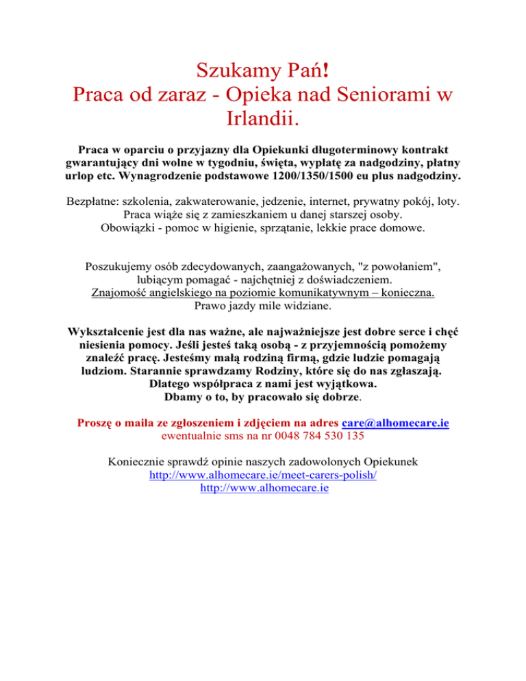 Szukamy Pań! Praca od zaraz - Opieka nad Seniorami w Irlandii. Praca w oparciu o przyjazny dla Opiekunki długoterminowy kontrakt gwarantujący dni wolne w tygodniu, święta, wypłatę za nadgodziny, płatny urlop etc. Wynagrodzenie podstawowe 1200/1350/1500 eu plus nadgodziny. Bezpłatne: szkolenia, zakwaterowanie, jedzenie, internet, prywatny pokój, loty. Praca wiąże się z zamieszkaniem u danej starszej osoby. Obowiązki - pomoc w higienie, sprzątanie, lekkie prace domowe. Poszukujemy osób zdecydowanych, zaangażowanych, "z powołaniem", lubiącym pomagać - najchętniej z doświadczeniem. Znajomość angielskiego na poziomie komunikatywnym – konieczna. Prawo jazdy mile widziane. Wykształcenie jest dla nas ważne, ale najważniejsze jest dobre serce i chęć niesienia pomocy. Jeśli jesteś taką osobą - z przyjemnością pomożemy znaleźć pracę. Jesteśmy małą rodziną firmą, gdzie ludzie pomagają ludziom. Starannie sprawdzamy Rodziny, które się do nas zgłaszają. Dlatego współpraca z nami jest wyjątkowa. Dbamy o to, by pracowało się dobrze. Proszę o maila ze zgłoszeniem i zdjęciem na adres [email protected] ewentualnie sms na nr 0048 784 530 135 Koniecznie sprawdź opinie naszych zadowolonych Opiekunek http://www.alhomecare.ie/meet-carers-polish/ http://www.alhomecare.ie