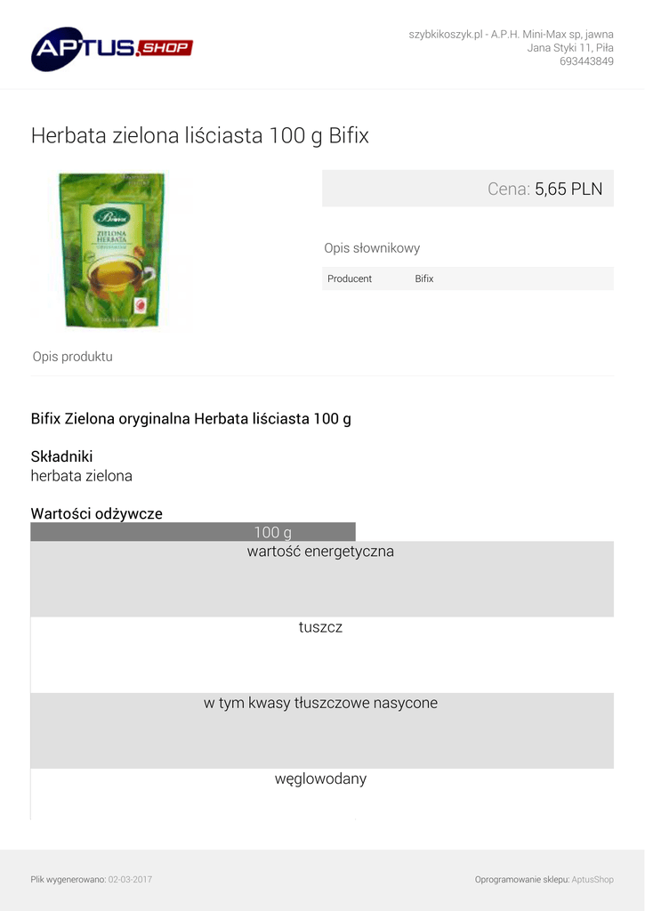 szybkikoszyk.pl - A.P.H. Mini-Max sp, jawna Jana Styki 11, Piła 693443849 Herbata zielona liściasta 100 g Bifix Cena: 5,65 PLN Opis słownikowy Producent Bifix Opis produktu Bifix Zielona oryginalna Herbata liściasta 100 g Składniki herbata zielona Wartości odżywcze 100 g wartość energetyczna tuszcz w tym kwasy tłuszczowe nasycone węglowodany Plik wygenerowano: 02-03-2017 Oprogramowanie sklepu: AptusShop szybkikoszyk.pl - A.P.H. Mini-Max sp, jawna Jana Styki 11, Piła 693443849 w tym cukry białko sól Nazwa produktu uregulowana prawnie Zielona herbata oryginalna Marka Bifix Cechy gwarancja najwyższej jakości - W. Piasecki, Dobra Marka 2011 - jakość, zaufanie, renoma, Poznaj Dobrą Żywność Marka standaryzowana Marka: Bifix Adres firmy Górki Małe ul. Dworska 33 95-080 Tuszyn Opis produktu Tradycyjna zielona herbata o przyjemnie orzeźwiającym smaku. Daje delikatny napar o charakterystycznej jasnej barwie. Zielona herbata jest bogata w witaminy B1, B2, B5, K, PP, związki garbnikowe, alkaloidy, związki purynowe, kumaryny i lecytynę. Zawiera również bardzo liczne związki mineralne, wapń, magnez, żelazo, mangan, krzem, fluor, miedź, jod oraz aminokwasy. Dzięki tak różnorodnej zawartości cennych składników, ma ona dobroczynny wpływ na różne funkcje naszego organizmu. Najczęściej wymienianą zaletą picia zielonej herbaty jest oczyszczenie organizmu z toksyn, Plik wygenerowano: 02-03-2017 Oprogramowanie sklepu: AptusShop szybkikoszyk.pl - A.P.H. Mini-Max sp, jawna Jana Styki 11, Piła 693443849 korzystny wpływ na naturalną pracę układu sercowo-naczyniowego oraz przewodu pokarmowego. Na szczególną uwagę zasługują jej właściwości pobudzające, dzięki którym z powodzeniem może ona zastąpić codzienne picie czarnej kawy. Zieloną herbatę polecamy osobom w każdym wieku. Szczególnie osobom: dbającym o dobrą kondycję serca, układu naczyniowego i układu trawiennego. O marce Zielone herbaty Bifix są esencją nie tylko dobrego smaku i wspaniałego aromatu, ale też wywierają na organizm niezwykle dobroczynny wpływ. Zawierają wiele cennych składników, pobudzają, a jednocześnie odprężają i koją zmysły. Oczyszczają nie tylko ciało, ale także pozytywnie oddziałują na umysł. Zielone herbaty Bifix dostępne są w oryginalnej wersji smakowej, jak również z dodatkiem owoców i delikatnych aromatów. Oferujemy różne sposoby pakowania produktu. O producencie Pracujemy w systemie ISO-9001:2008. Company Name BiFIX Wojciech Piasecki Sp. j. Przygotowanie i stosowanie Sposób parzenia herbaty: 1. Wsypać jedną łyżeczkę herbaty do filiżanki. 2. Zalać zagotowaną wodą o temp. ok. 70-85°C. 3. Parzyć 3-5 minut. Przechowywanie Przechowywać w suchym i chłodnym miejscu. Rodzaj przechowywania Typ: Przechowywać w temperaturze otoczenia Rozmiar opakowania 100 Jednostka (tekst opisowy) g Średnia miara Średnia miara (e) Plik wygenerowano: 02-03-2017 Oprogramowanie sklepu: AptusShop szybkikoszyk.pl - A.P.H. Mini-Max sp, jawna Jana Styki 11, Piła 693443849 Informacje o recyklingu Opakowanie: Nadające się do recyklingu Jednostka (specyficzna) Jednostka (specyficzna): Gramów Kraj Zapakowano w: Polska Rodzaj opakowania Typ: Opakowanie wielokrotnie zamykane Wymiar liczbowy Wymiar liczbowy: 100 Wymiar Wymagana wysokość na półce: 197 Wymagana szerokość na półce: 136 Wymagana głębokość na półce: 53 Waga Waga brutto: 110 Sprzedaż jednostkowa Wysokość: 197 Szerokość: 136 Głębokość: 53 Pochodzenie Tekst dowolny o pochodzeniu: Kraj pochodzenia herbaty: Chiny. Paczkowano w Polsce. Adres producenta BiFIX Wojciech Piasecki Sp. j. Górki Małe ul. Dworska 33 95-080 Tuszyn Adres zwrotny BiFIX Wojciech Piasecki Sp. j. Górki Małe ul. Dworska 33 95-080 Tuszyn tel. +48 42 614 33 49 fax +48 42 614 41 20 e-mail: [email protected] www.bifix.pl Plik wygenerowano: 02-03-2017 Oprogramowanie sklepu: AptusShop szybkikoszyk.pl - A.P.H. Mini-Max sp, jawna Jana Styki 11, Piła 693443849 Telefon/Fax kontaktowy +48426143349 Numer fax +48426144120 Email kontaktowy [email protected] Adres internetowy www.bifix.pl Języki na opakowaniu polski Język produktu Główny język opisu: polski Język danych: polski Podzielony opis produktu Nazwa funkcjonalna: Herbata liściasta Wariant: Zielona oryginalna Plik wygenerowano: 02-03-2017 Powered by TCPDF (www.tcpdf.org) Oprogramowanie sklepu: AptusShop