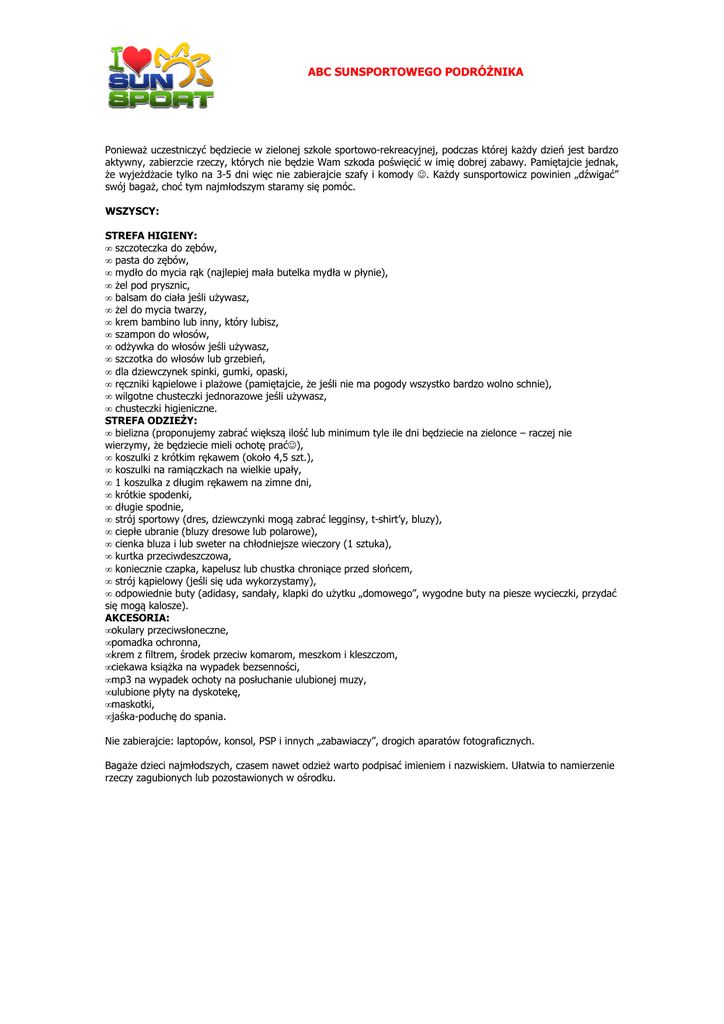 ABC SUNSPORTOWEGO PODRÓŻNIKA Ponieważ uczestniczyć będziecie w zielonej szkole sportowo-rekreacyjnej, podczas której każdy dzień jest bardzo aktywny, zabierzcie rzeczy, których nie będzie Wam szkoda poświęcić w imię dobrej zabawy. Pamiętajcie jednak, że wyjeżdżacie tylko na 3-5 dni więc nie zabierajcie szafy i komody ☺. Każdy sunsportowicz powinien „dźwigać” swój bagaż, choć tym najmłodszym staramy się pomóc. WSZYSCY: STREFA HIGIENY: • szczoteczka do zębów, • pasta do zębów, • mydło do mycia rąk (najlepiej mała butelka mydła w płynie), • żel pod prysznic, • balsam do ciała jeśli używasz, • żel do mycia twarzy, • krem bambino lub inny, który lubisz, • szampon do włosów, • odżywka do włosów jeśli używasz, • szczotka do włosów lub grzebień, • dla dziewczynek spinki, gumki, opaski, • ręczniki kąpielowe i plażowe (pamiętajcie, że jeśli nie ma pogody wszystko bardzo wolno schnie), • wilgotne chusteczki jednorazowe jeśli używasz, • chusteczki higieniczne. STREFA ODZIEŻY: • bielizna (proponujemy zabrać większą ilość lub minimum tyle ile dni będziecie na zielonce – raczej nie wierzymy, że będziecie mieli ochotę prać☺), • koszulki z krótkim rękawem (około 4,5 szt.), • koszulki na ramiączkach na wielkie upały, • 1 koszulka z długim rękawem na zimne dni, • krótkie spodenki, • długie spodnie, • strój sportowy (dres, dziewczynki mogą zabrać legginsy, t-shirt’y, bluzy), • ciepłe ubranie (bluzy dresowe lub polarowe), • cienka bluza i lub sweter na chłodniejsze wieczory (1 sztuka), • kurtka przeciwdeszczowa, • koniecznie czapka, kapelusz lub chustka chroniące przed słońcem, • strój kąpielowy (jeśli się uda wykorzystamy), • odpowiednie buty (adidasy, sandały, klapki do użytku „domowego”, wygodne buty na piesze wycieczki, przydać się mogą kalosze). AKCESORIA: • okulary przeciwsłoneczne, • pomadka ochronna, • krem z filtrem, środek przeciw komarom, meszkom i kleszczom, • ciekawa książka na wypadek bezsenności, • mp3 na wypadek ochoty na posłuchanie ulubionej muzy, • ulubione płyty na dyskotekę, • maskotki, • jaśka-poduchę do spania. Nie zabierajcie: laptopów, konsol, PSP i innych „zabawiaczy”, drogich aparatów fotograficznych. Bagaże dzieci najmłodszych, czasem nawet odzież warto podpisać imieniem i nazwiskiem. Ułatwia to namierzenie rzeczy zagubionych lub pozostawionych w ośrodku.